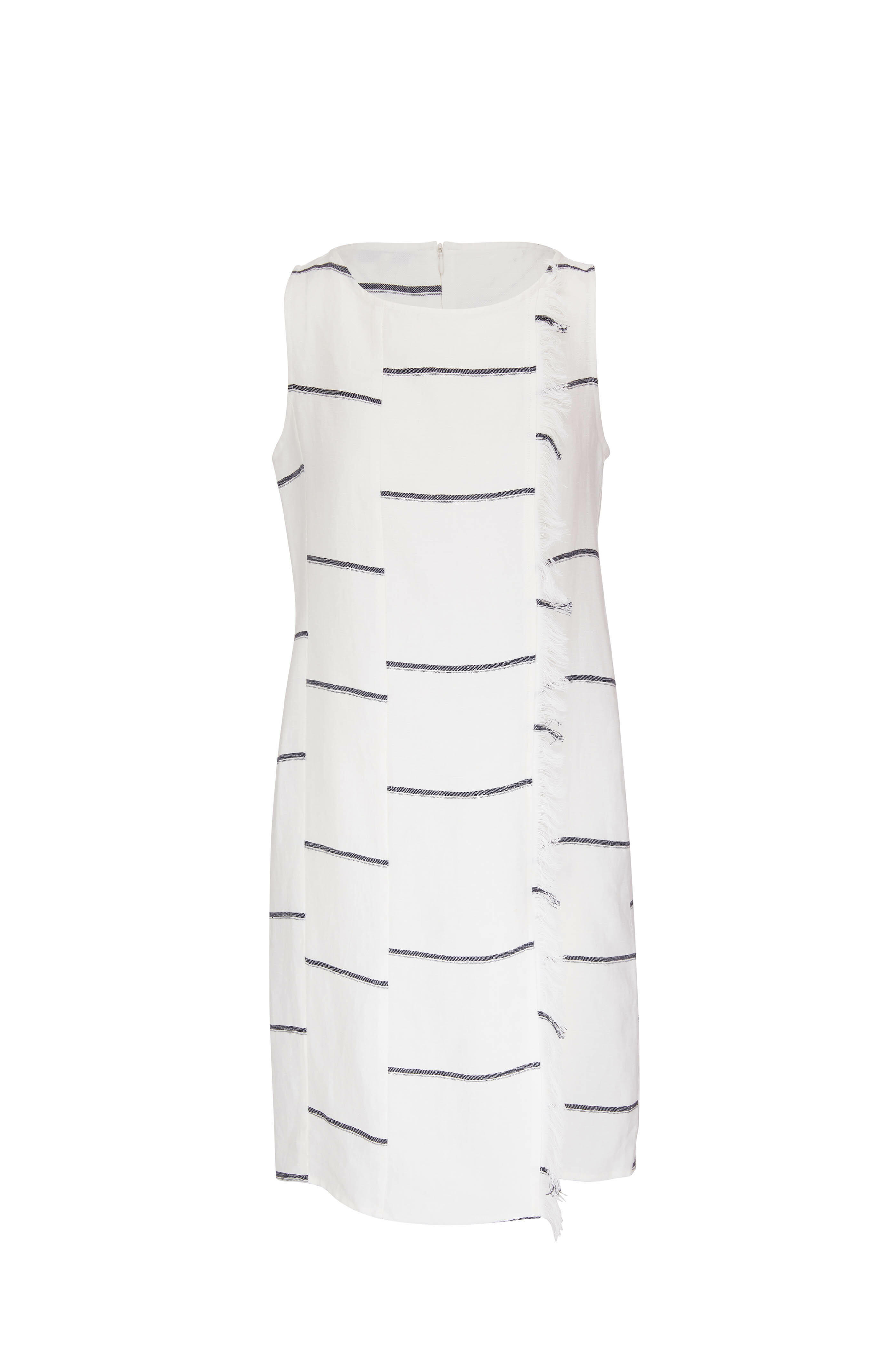 Round neckline. Concealed back zip. Front side slit. Fringe detail on left center seam. Made in Italy. Approx. 39” shoulder to hem. 100% linen. Hand wash.