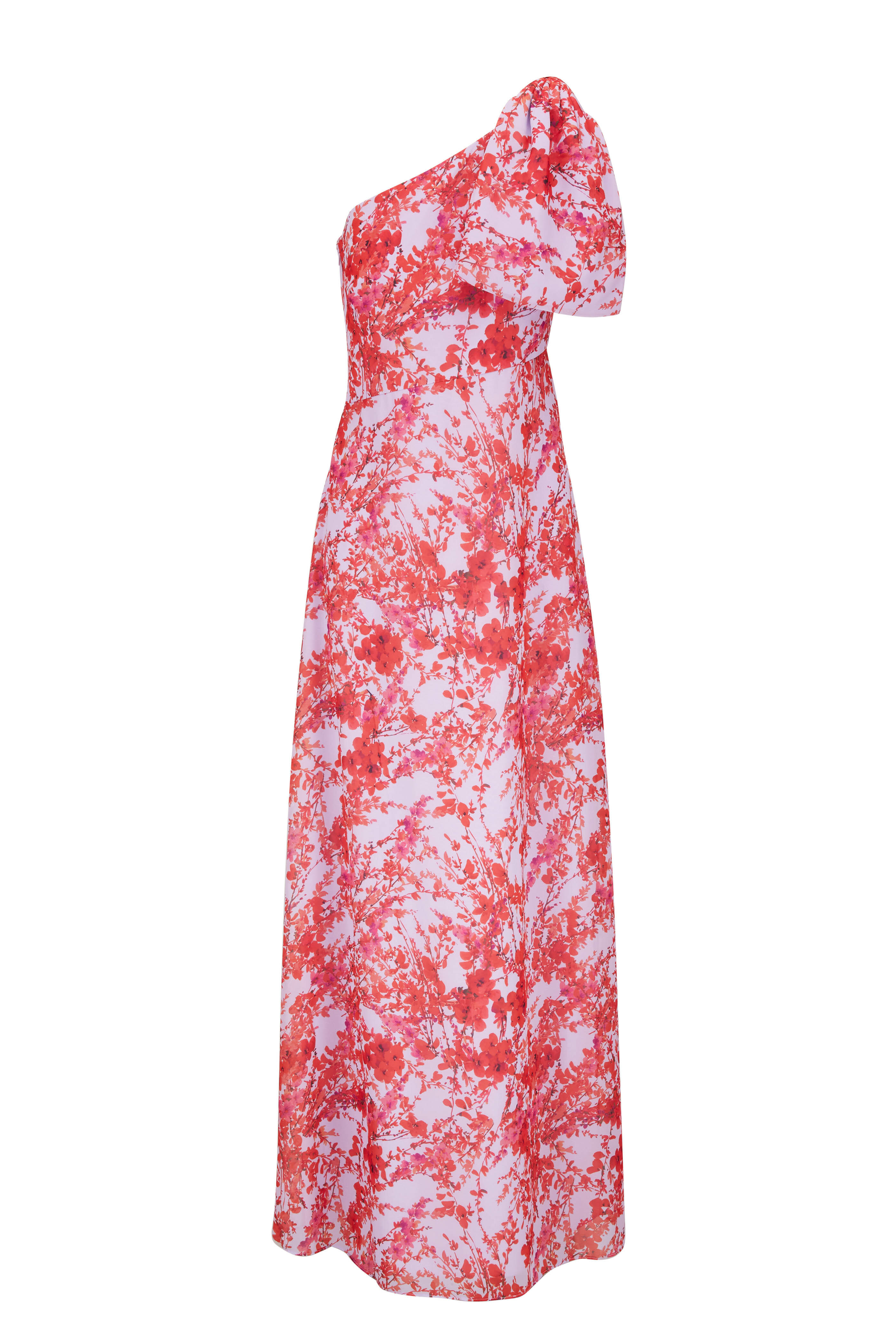 One-shoulder neckline. Side zip closure. Cut on bias. Asymmetric seam at the waist. Oversized bow detailing at left shoulder. Imported. 62" length. 100% polyester. Dry clean.