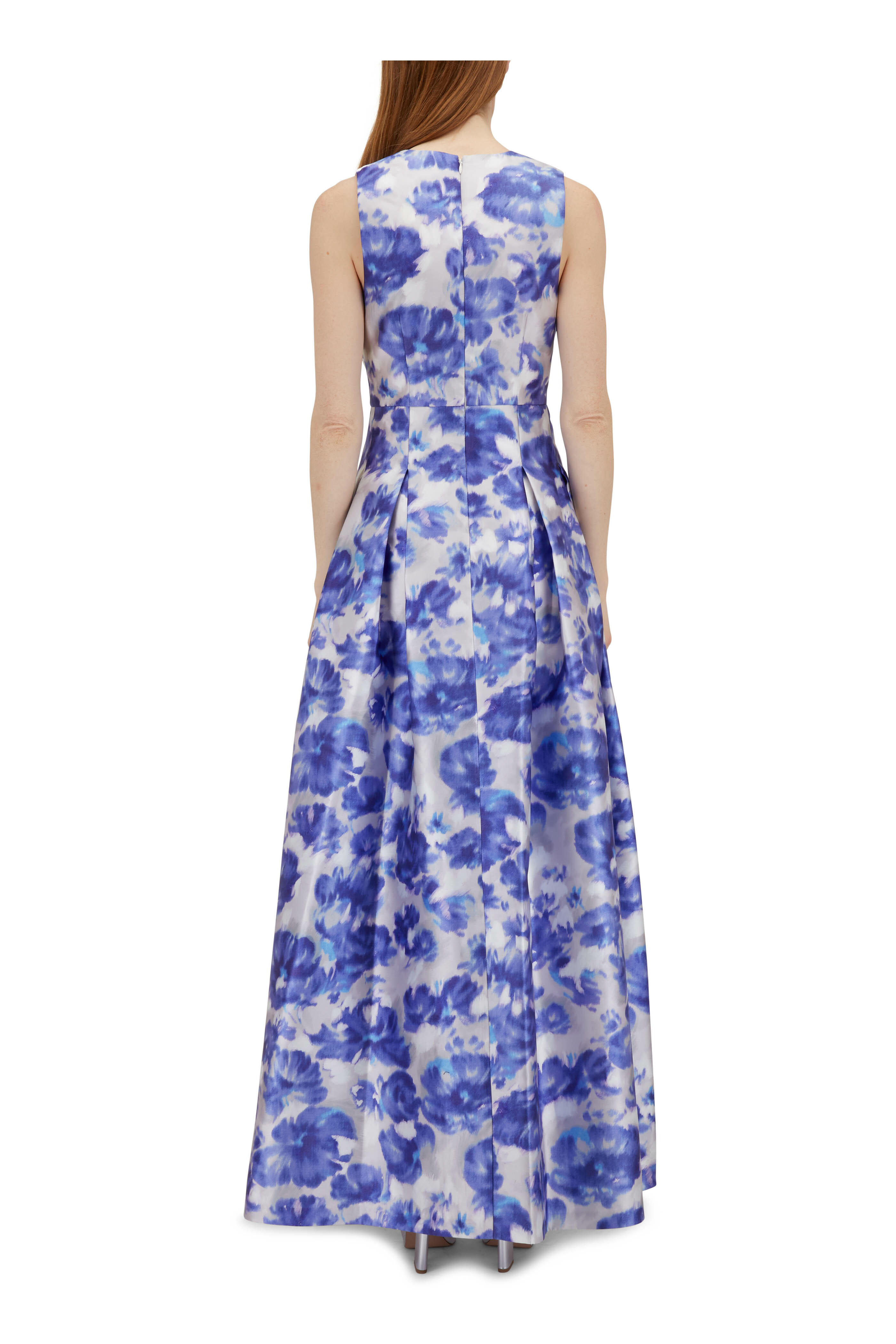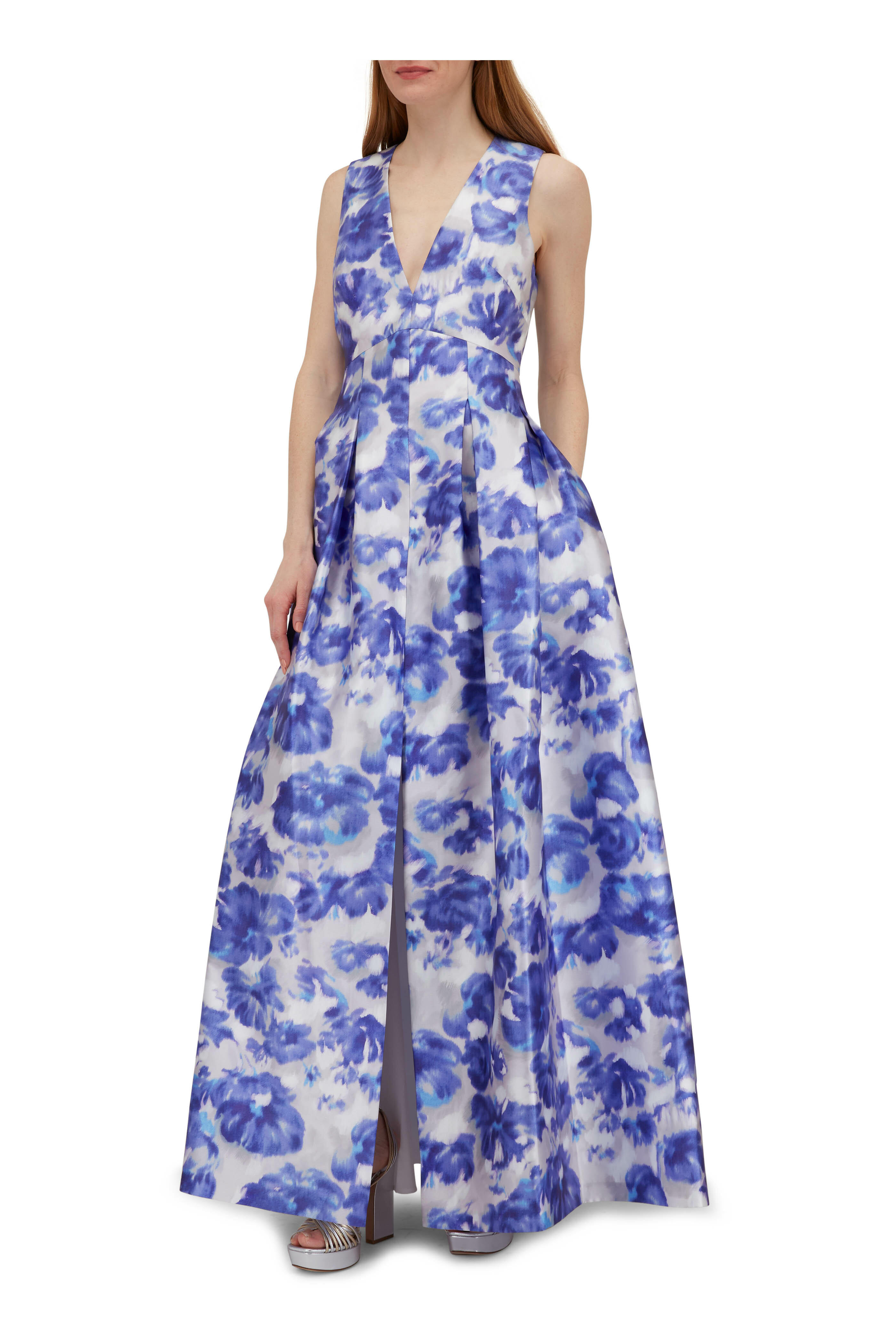 V-neckline. Concealed back zip. Concealed lower waist pockets. Front slit at hem. Imported. 62" length. 100% polyester. Dry clean.