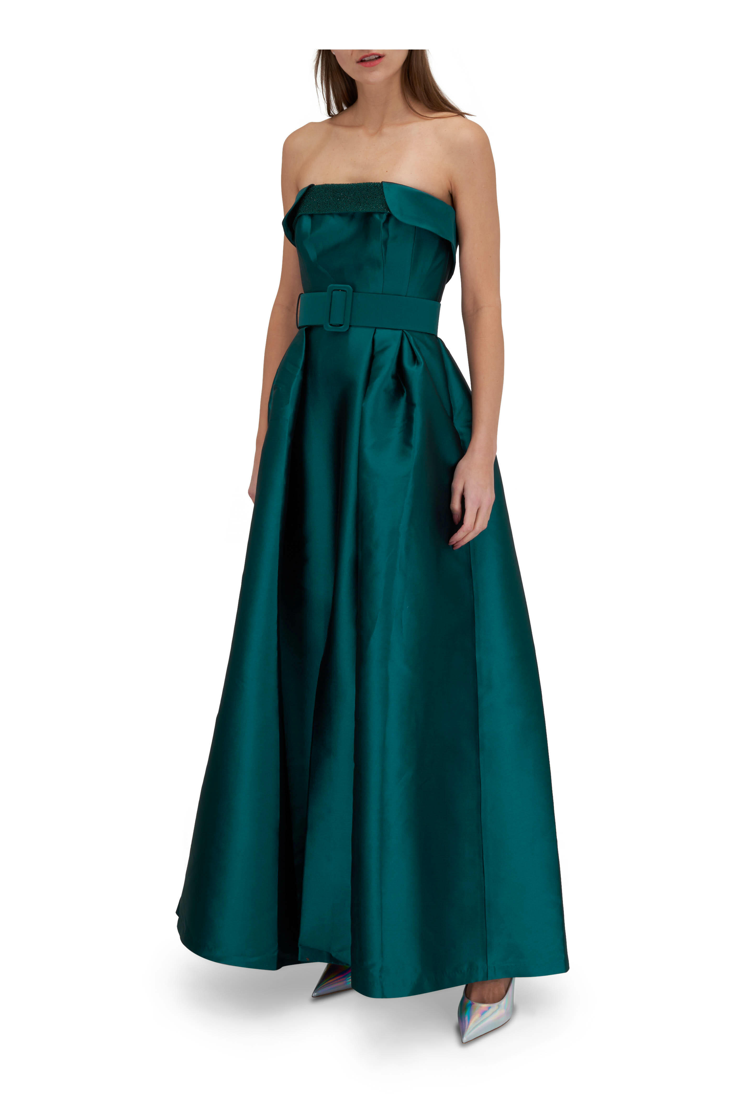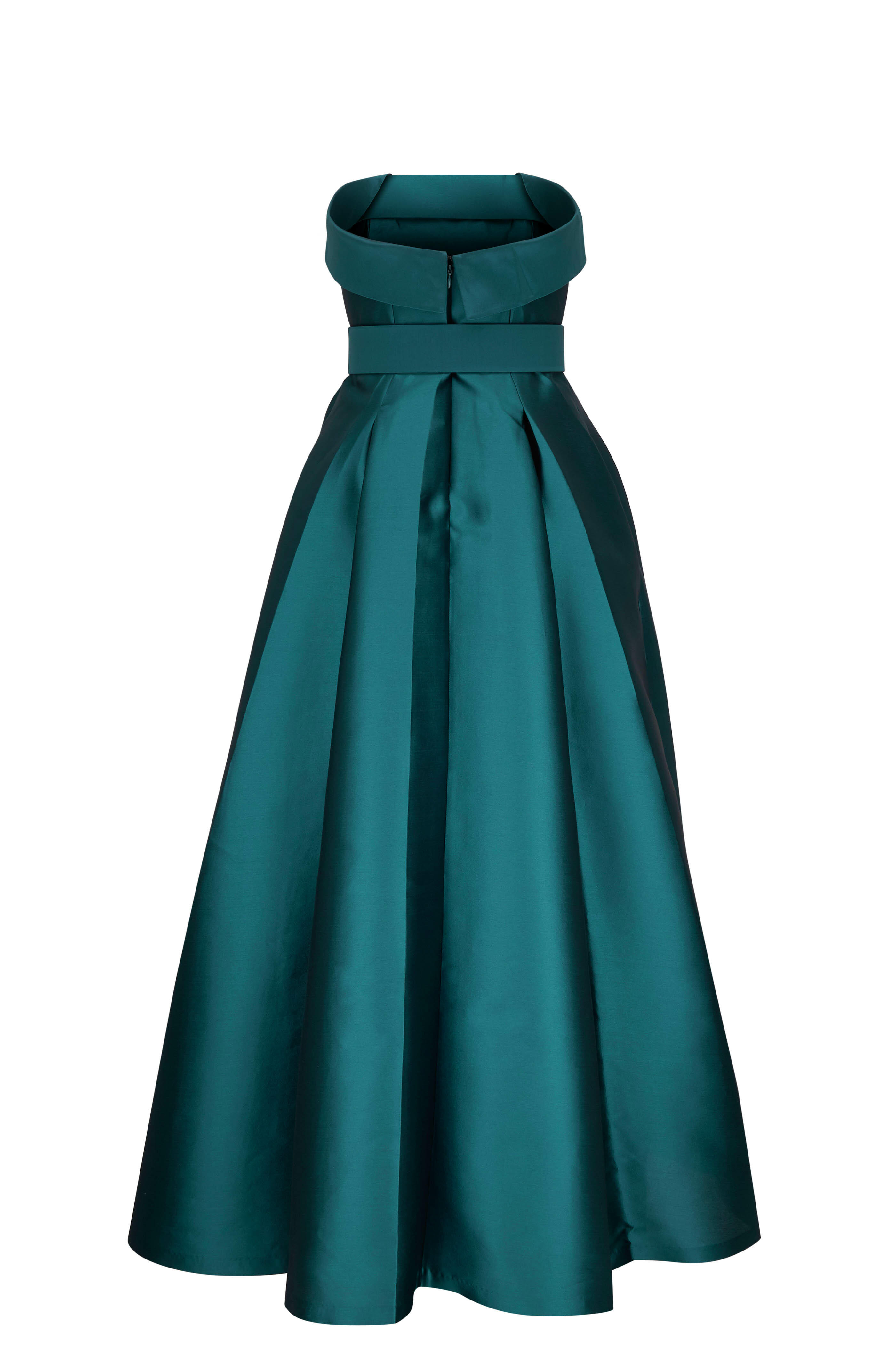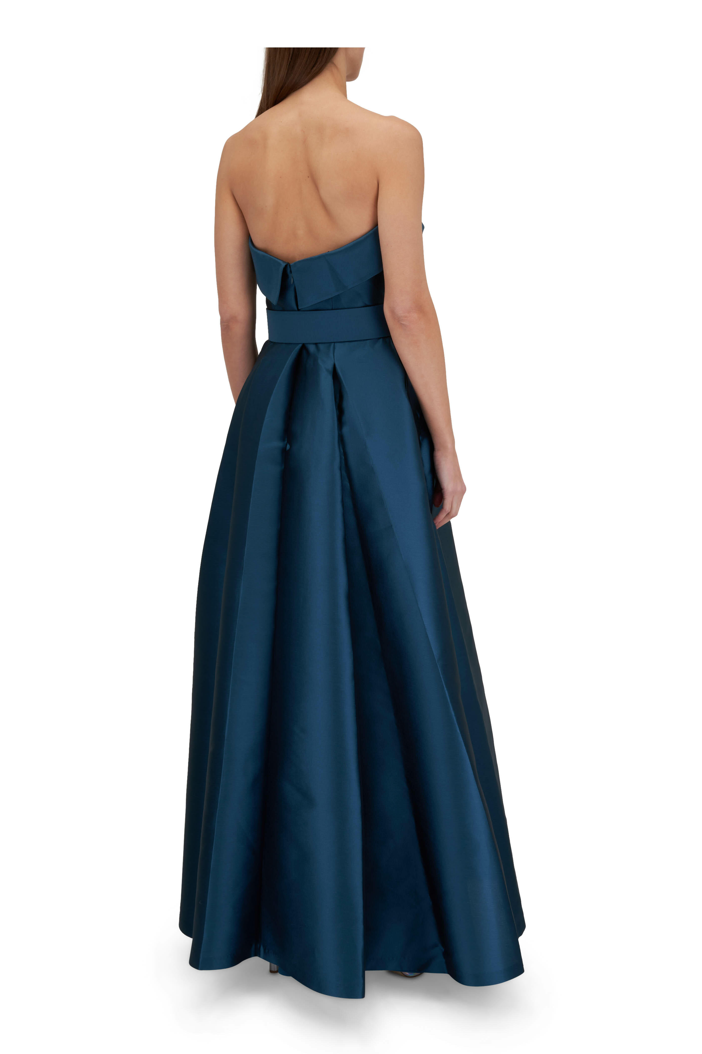 Strapless neckline. Concealed back zip. Removable self-belt at waist. Concealed side seam pockets. Short front slit. Imported. Color: Deep Teal. 62" Long. 85% polyester, 15% silk. Dry clean.