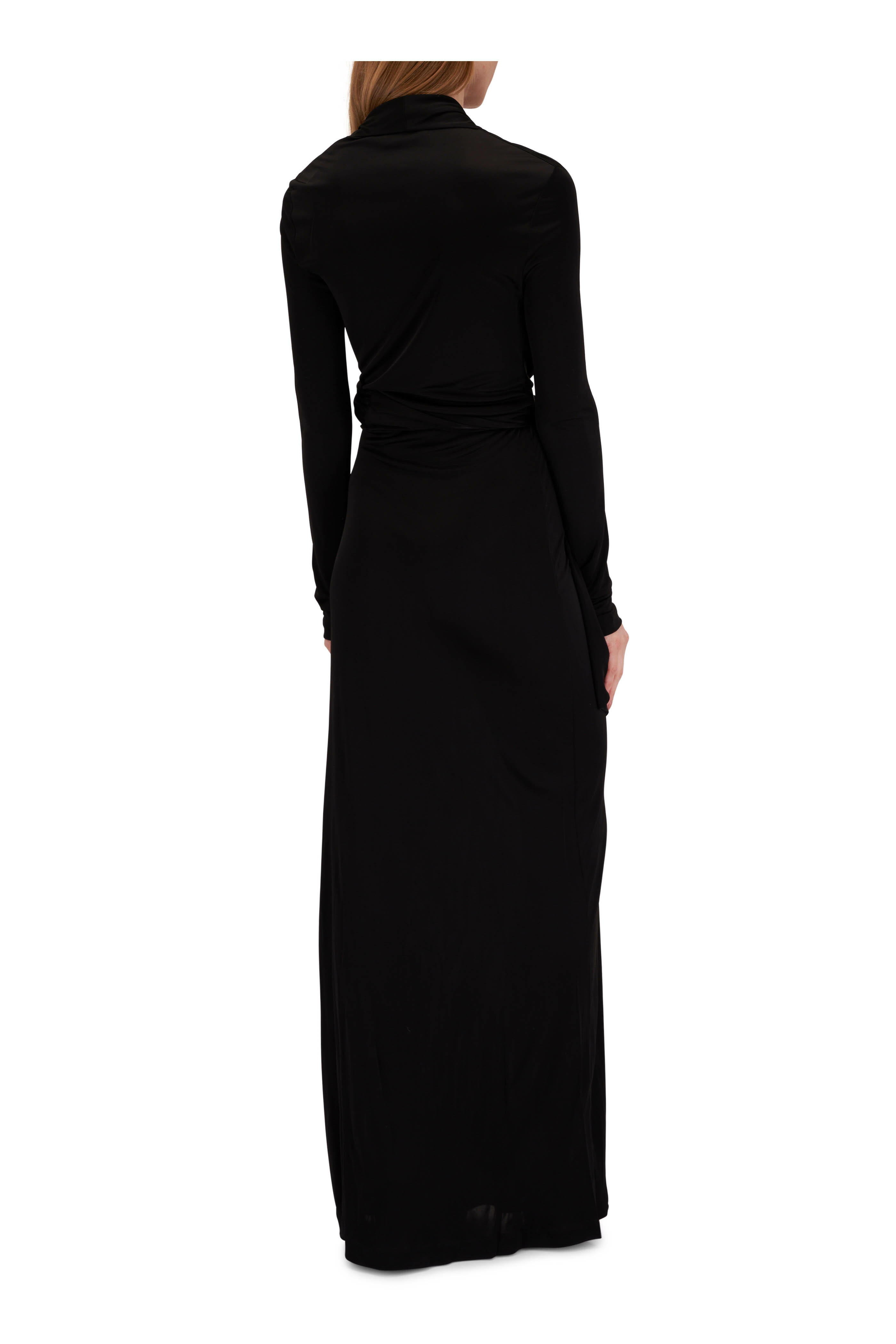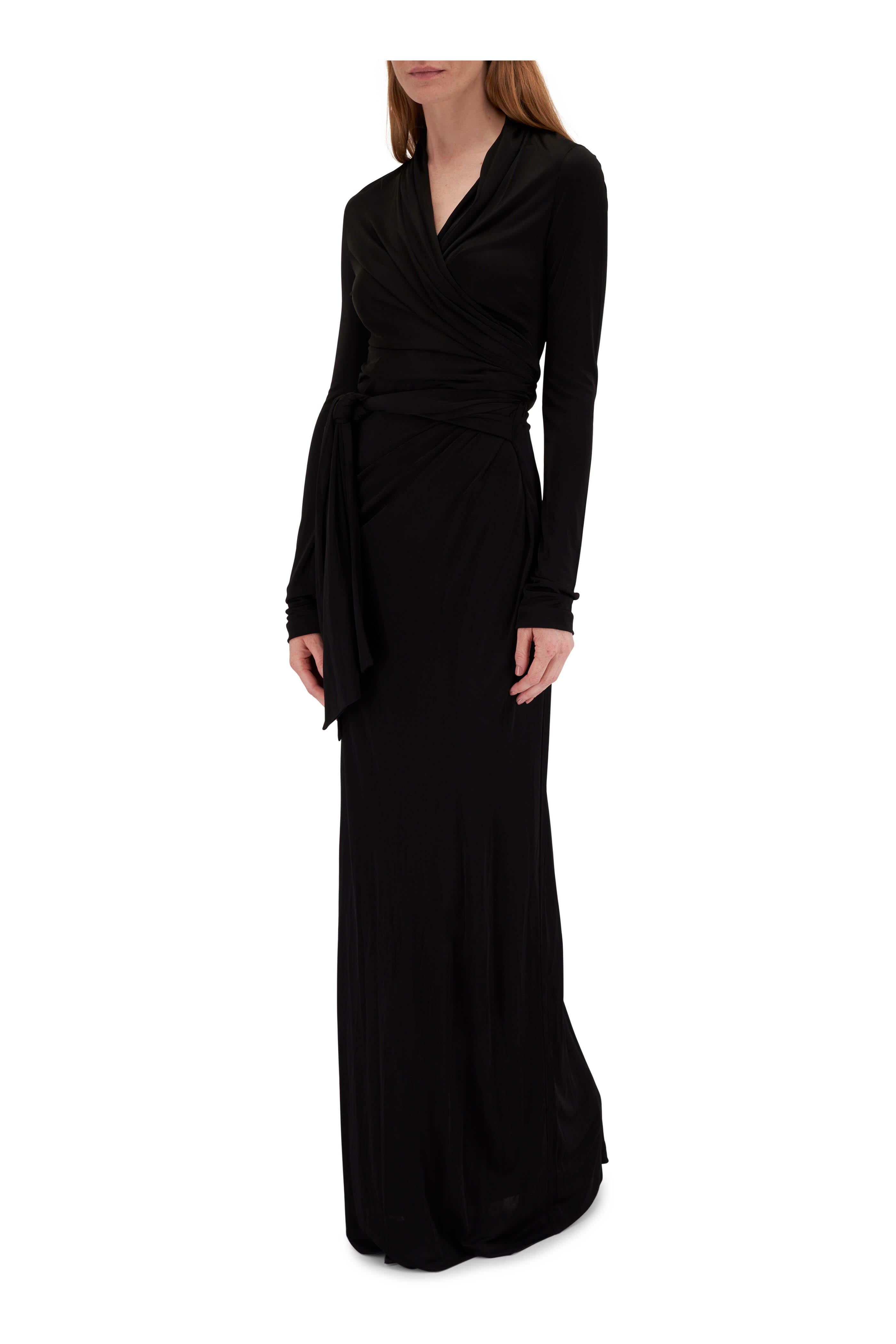 Surplice neckline. Self-tie wrap closure. Drape detailing. Made in Italy. Floor length. 100% viscose. Dry clean.