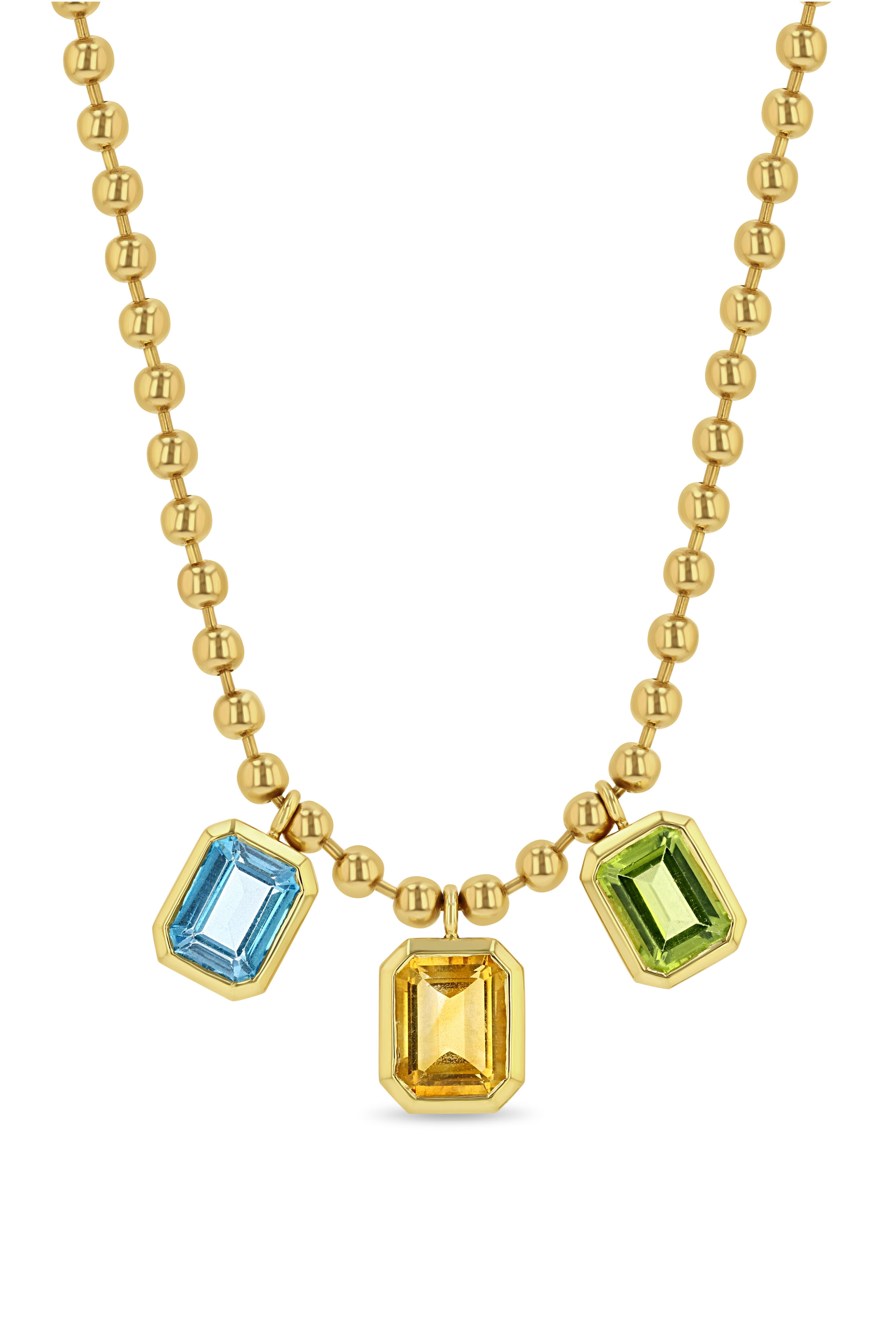 18k yellow gold. Peridot. Citrine. Blue topaz. 20" chain length.