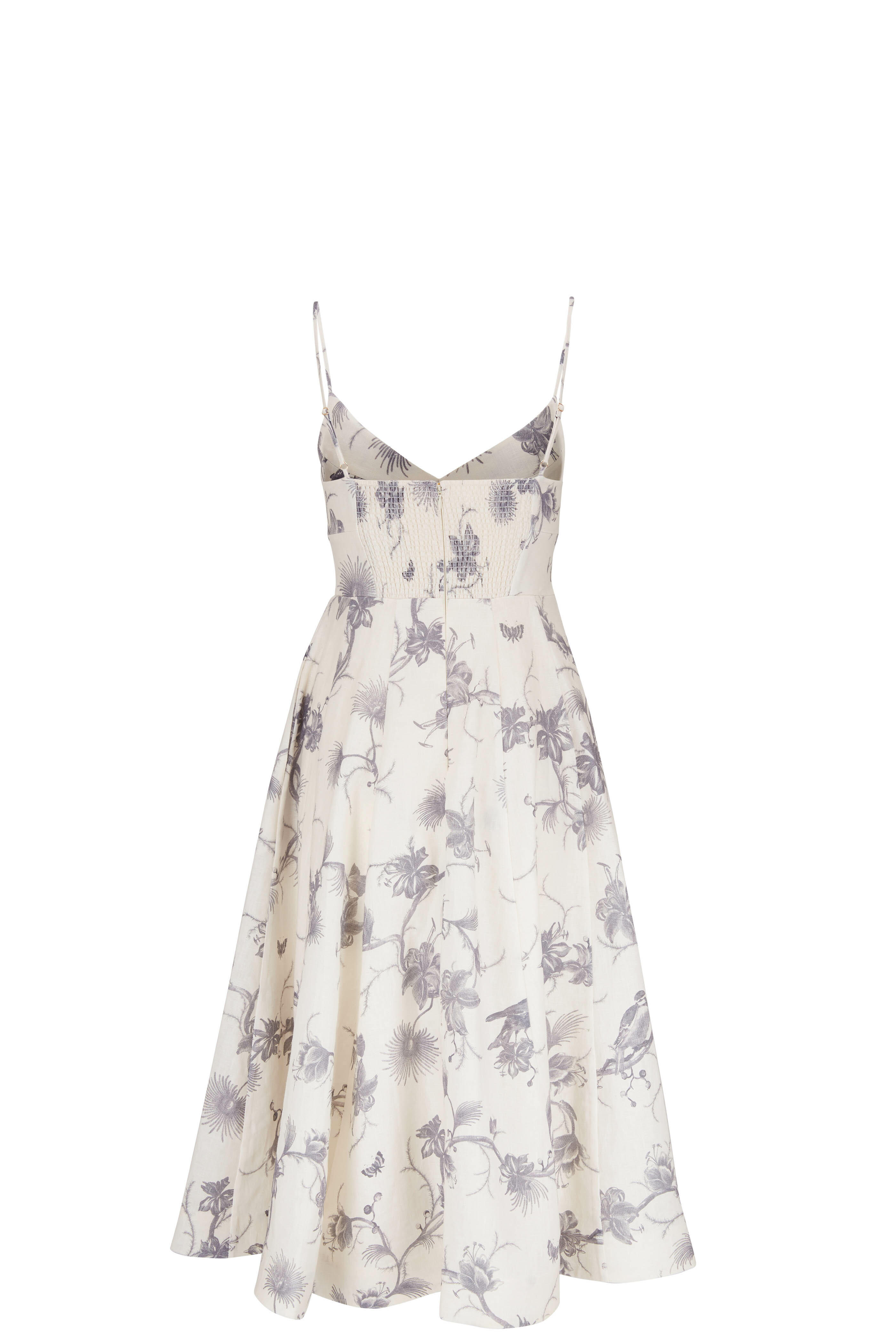 Sweetheart neckline. Shirred back with concealed zip. Adjustable shoulder straps. Side seam pockets. Imported. 46" shoulder to hem. Fit-&-flare silhouette. 100% linen, Lining: 100% cotton. Dry clean.
