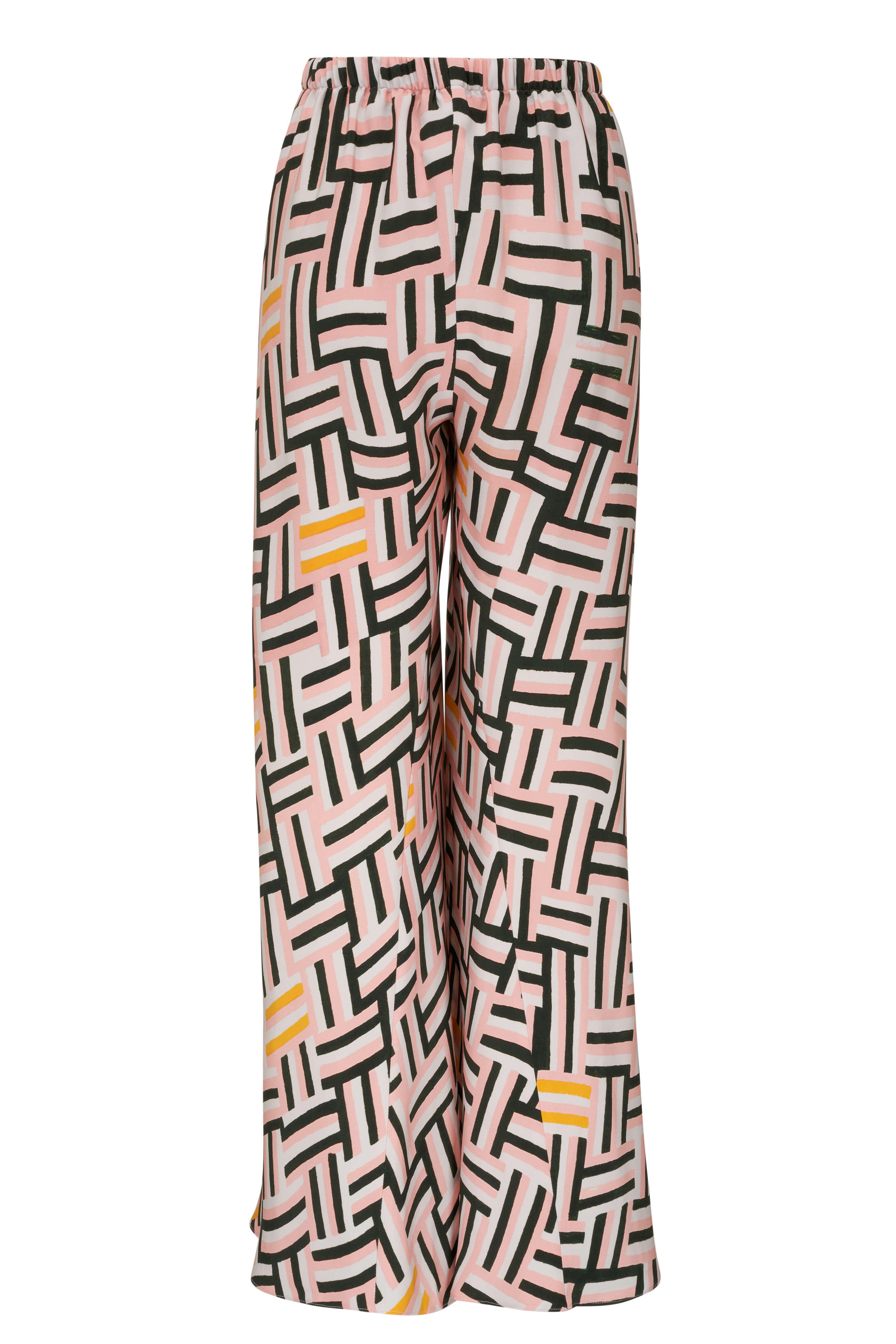 Elasticized waist. Pull on style. Made in the USA. 31" inseam. Wide leg. 100% 4-ply silk. Dry clean.
