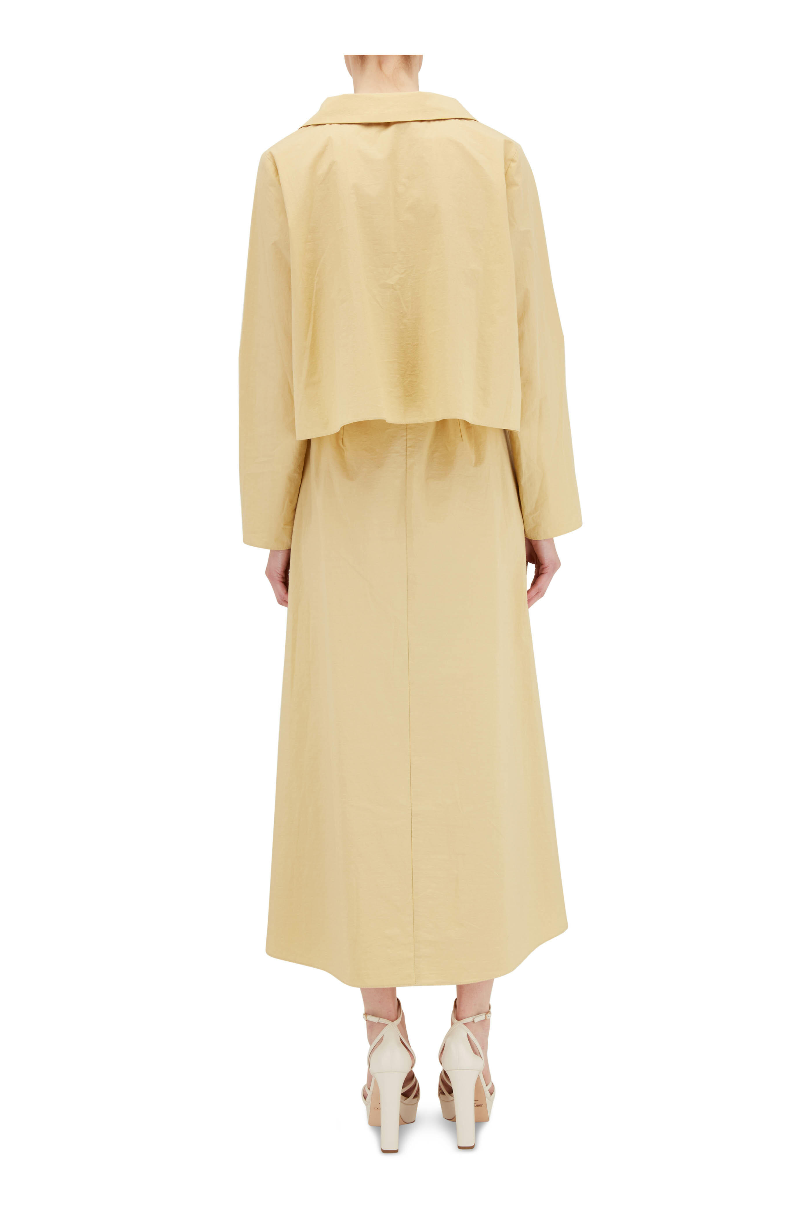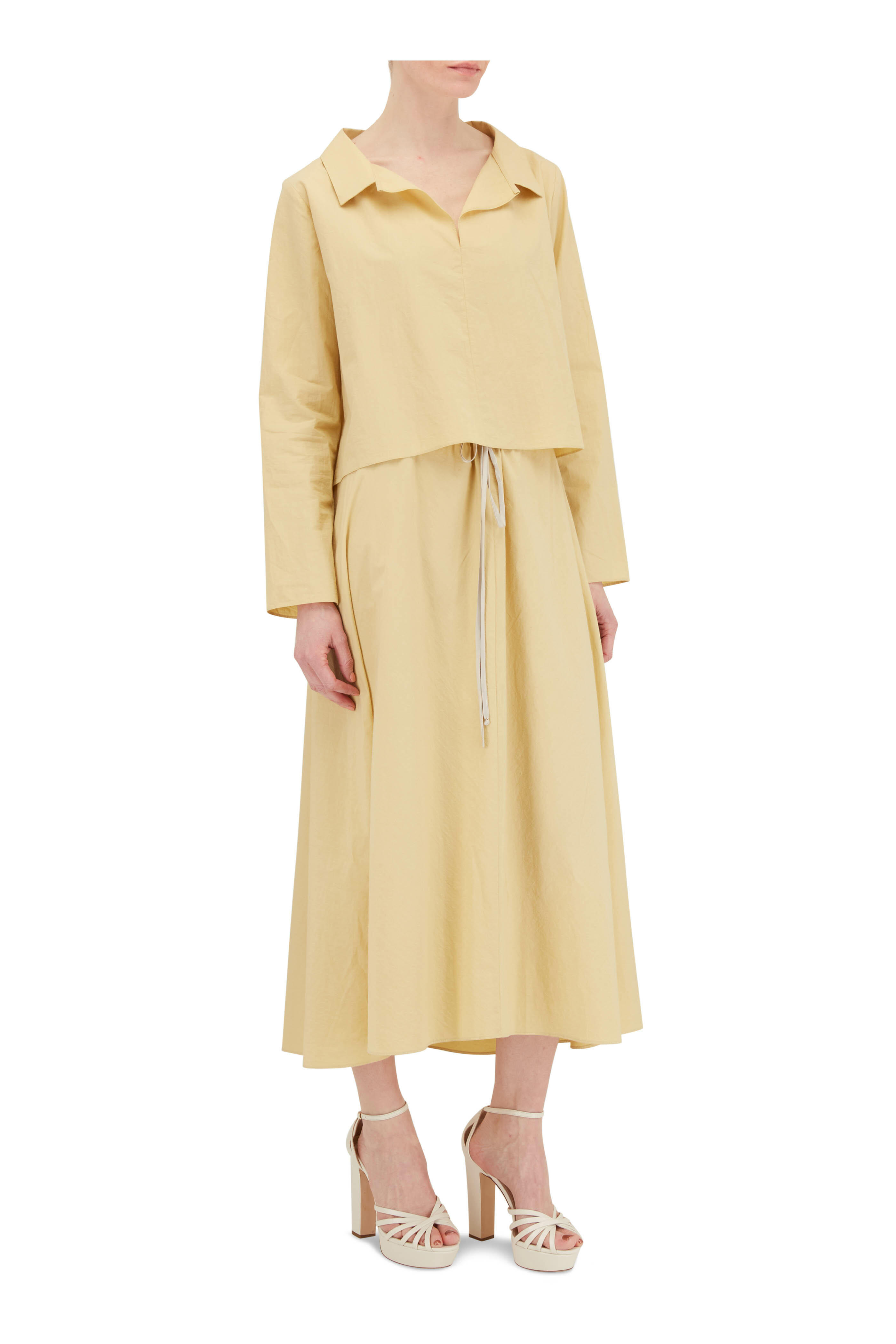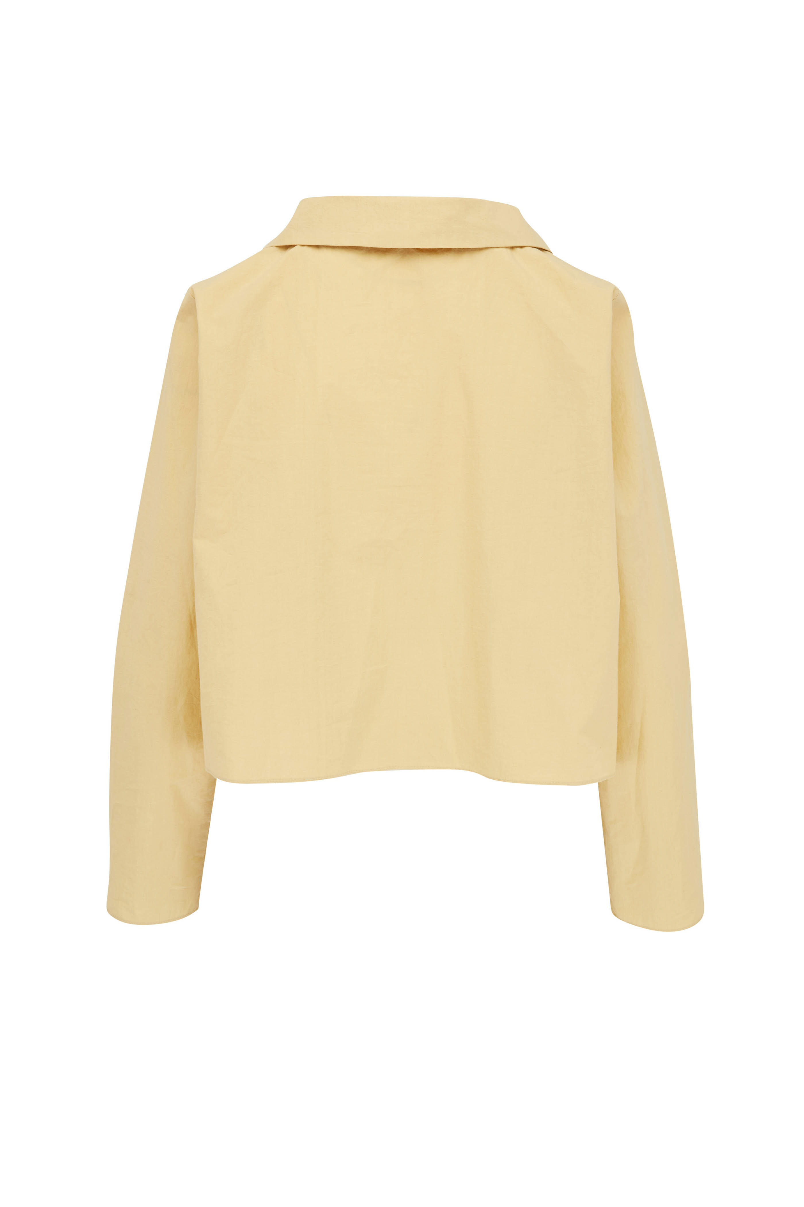 Spread collar. Slip on style. Made in the USA. 100% cotton. Dry clean.