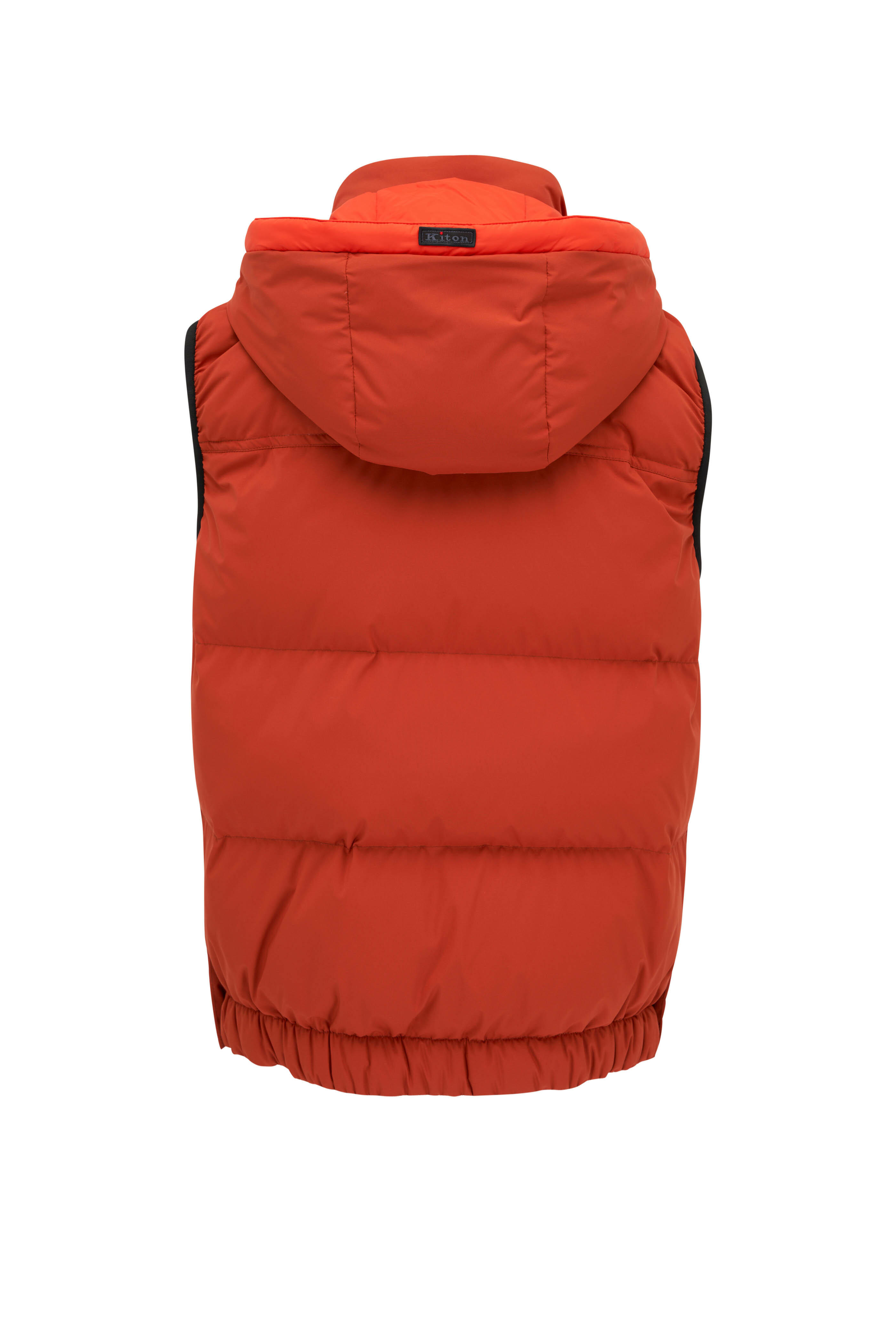 Stand collar. Detachable quilted hood. Front zip closure. Lower zip pockets; interior zip pocket. Vented side zip openings. Elasticized waistband. Made in Italy. 26" shoulder to hem. 100% polyester; Fill: 90% down, 10% feather; fully lined. Dry clean.