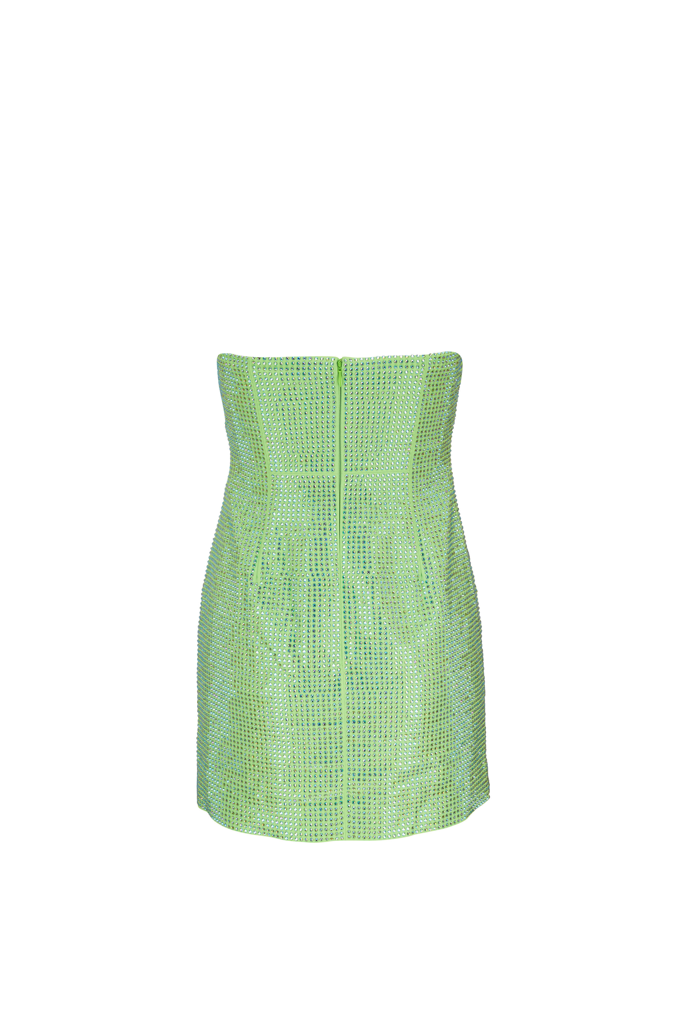 Strapless, draped neckline. Concealed back zip. Internal corset. Allover crystal embellishment. Imported. 27" shoulder to hem. 100% polyester; fully lined. Dry clean.