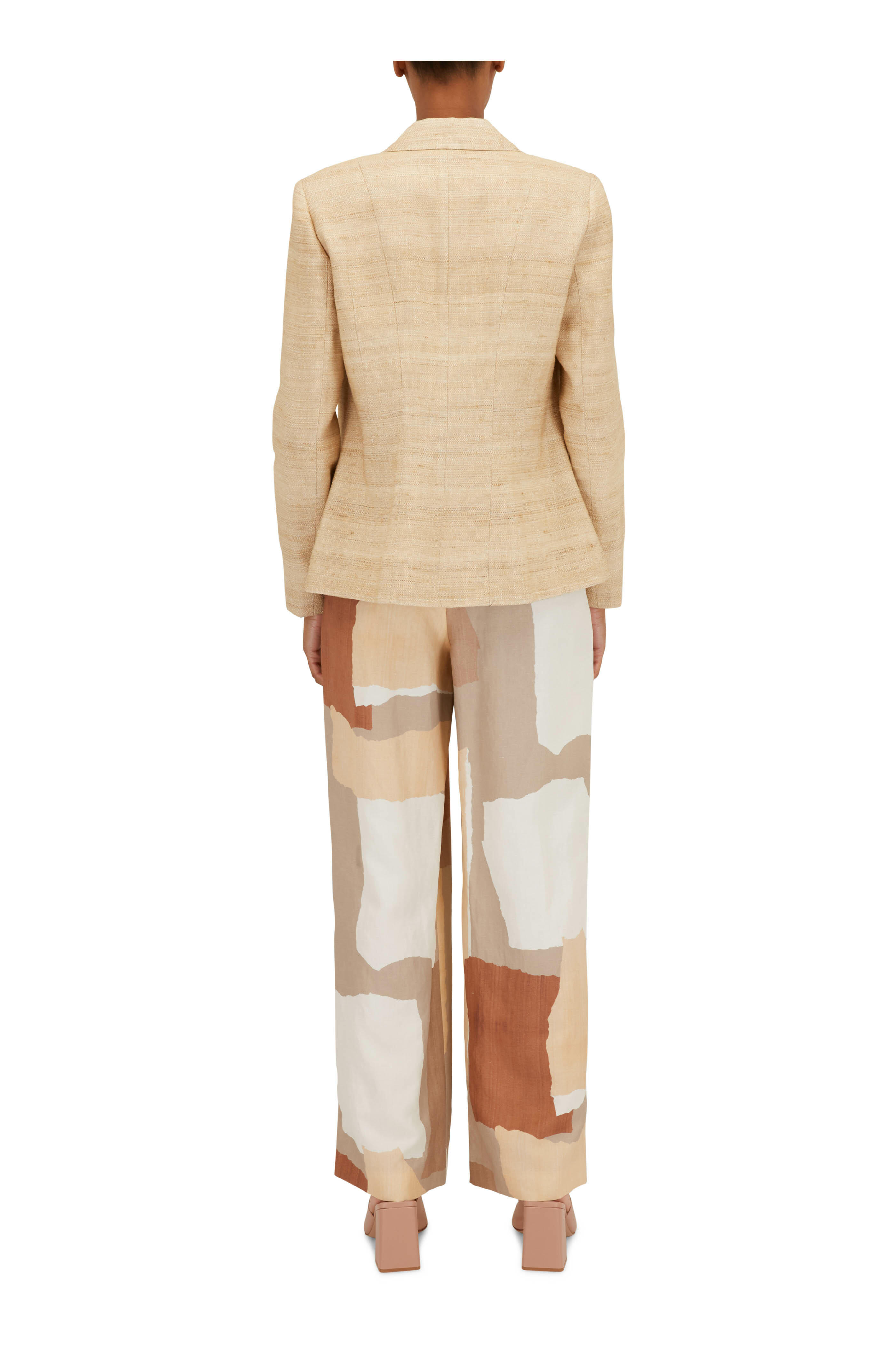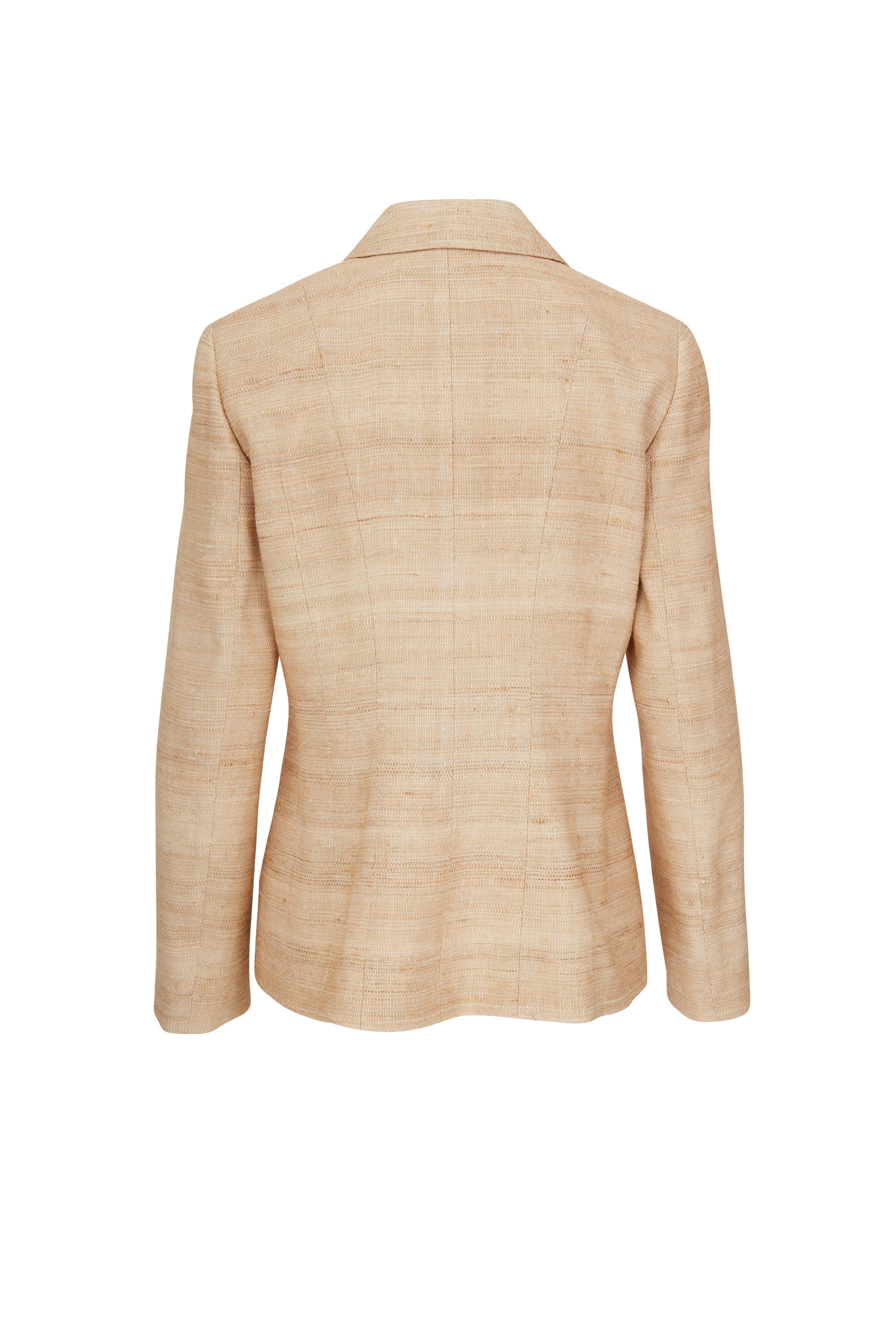Spread collar. Front button closure. Structured shoulder. Long sleeves. Chest patch pocket; Lower waist patch pockets. Princess seam details. Straight hem. Fabric from Italy. Color: Dune Mélange. Hip length. Fitted silhouette. 52% linen, 48% tussah silk. Dry clean.