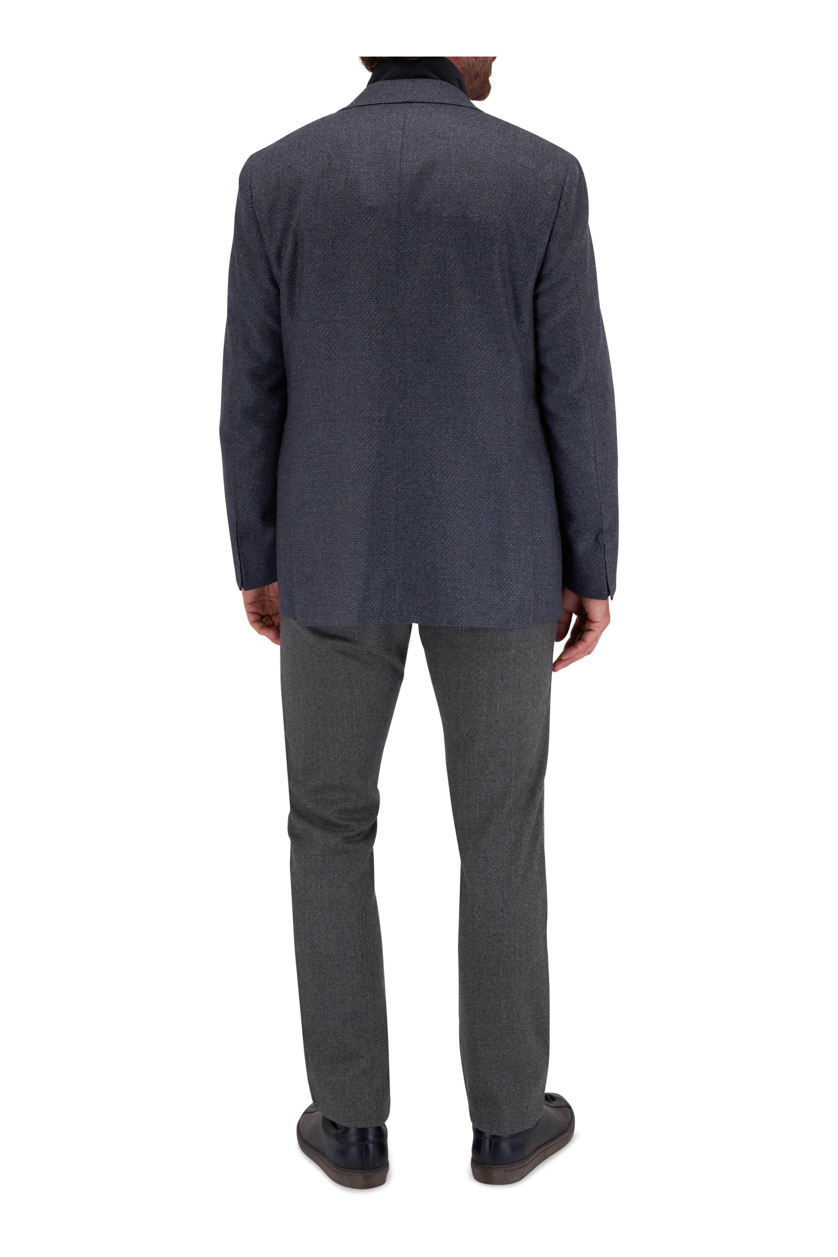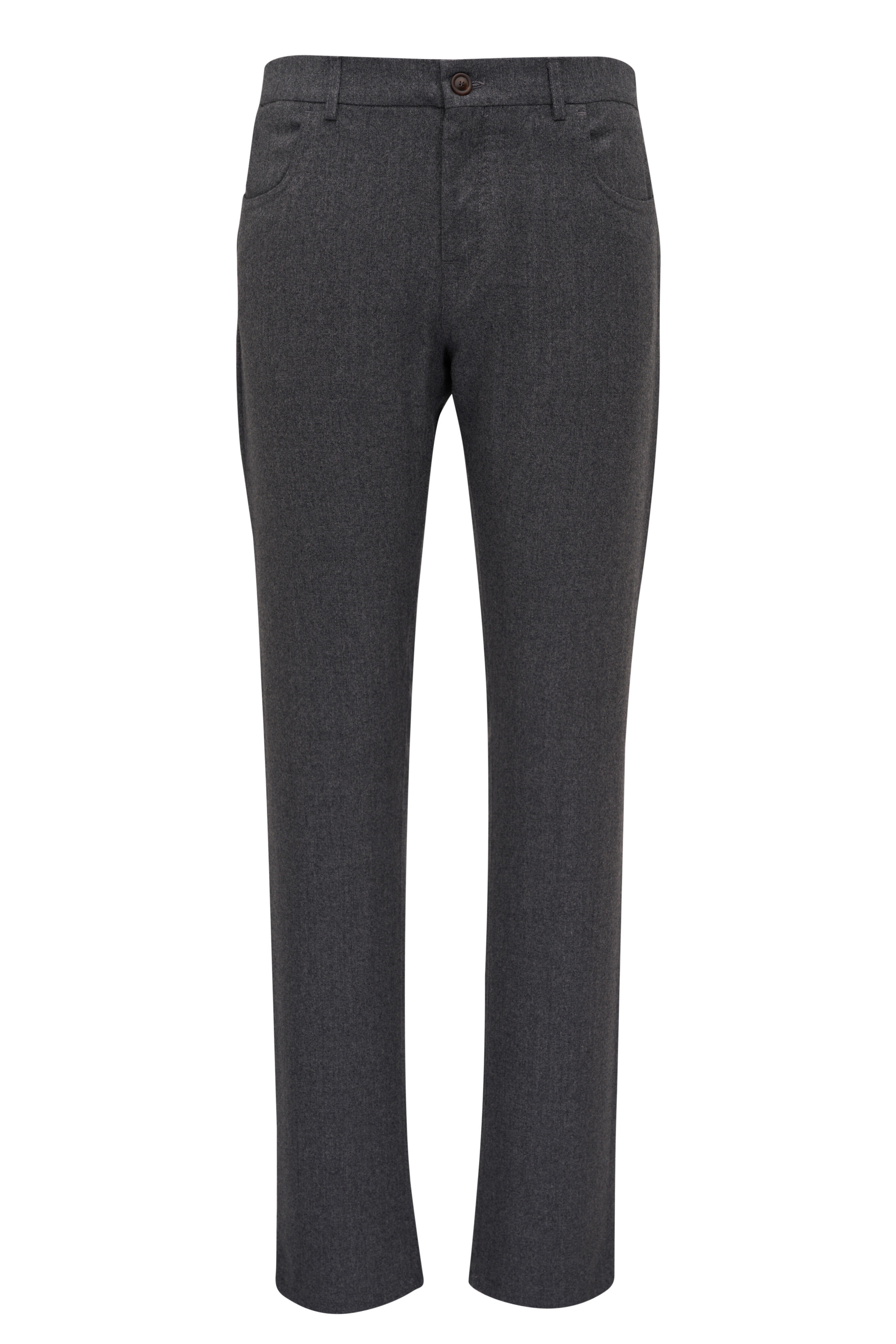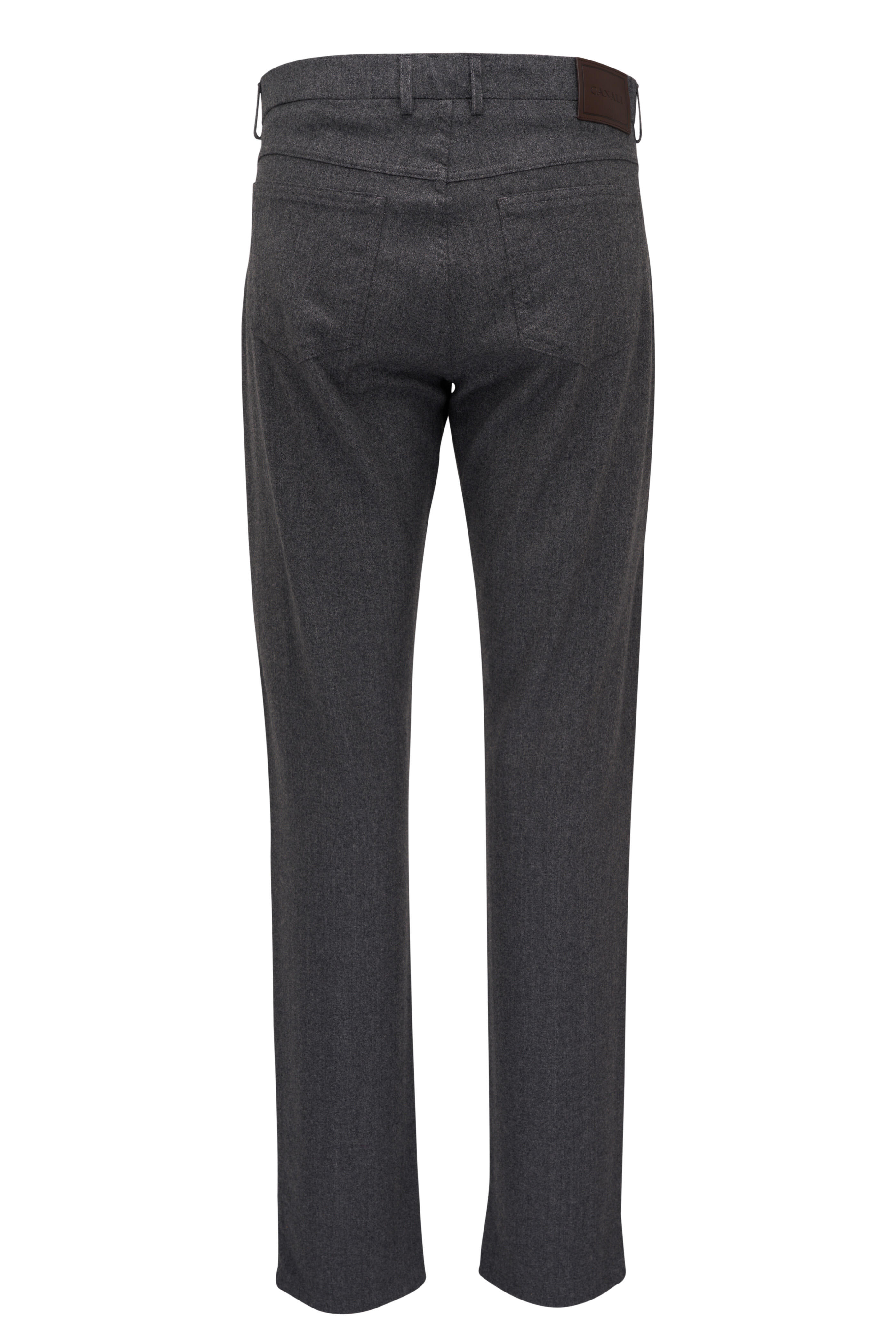 Zip fly with button closure. Banded waist; belt loops. Five pocket styling. Made in Italy. Jogger fit. Inseam: 35". 100% wool. Machine wash cold.