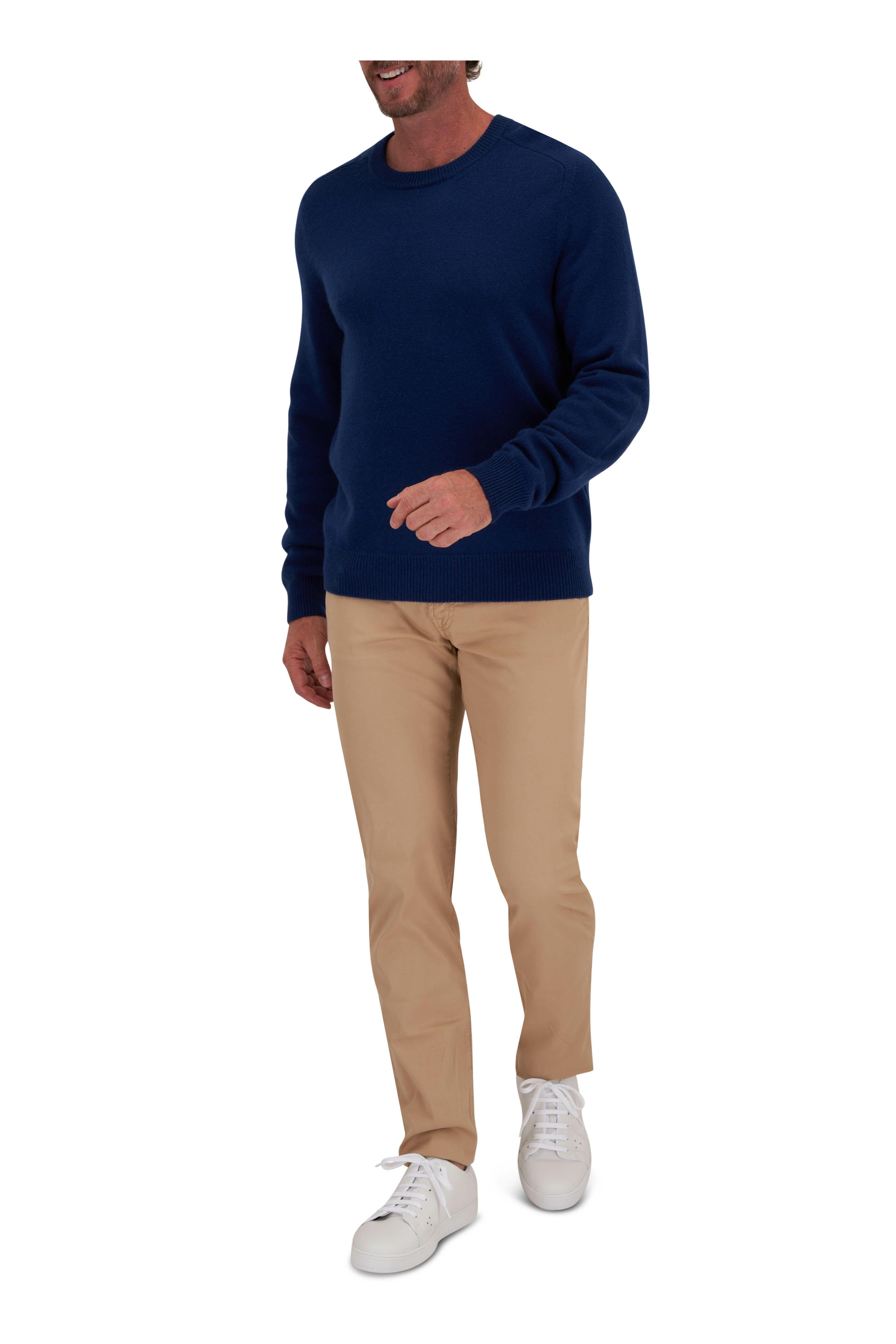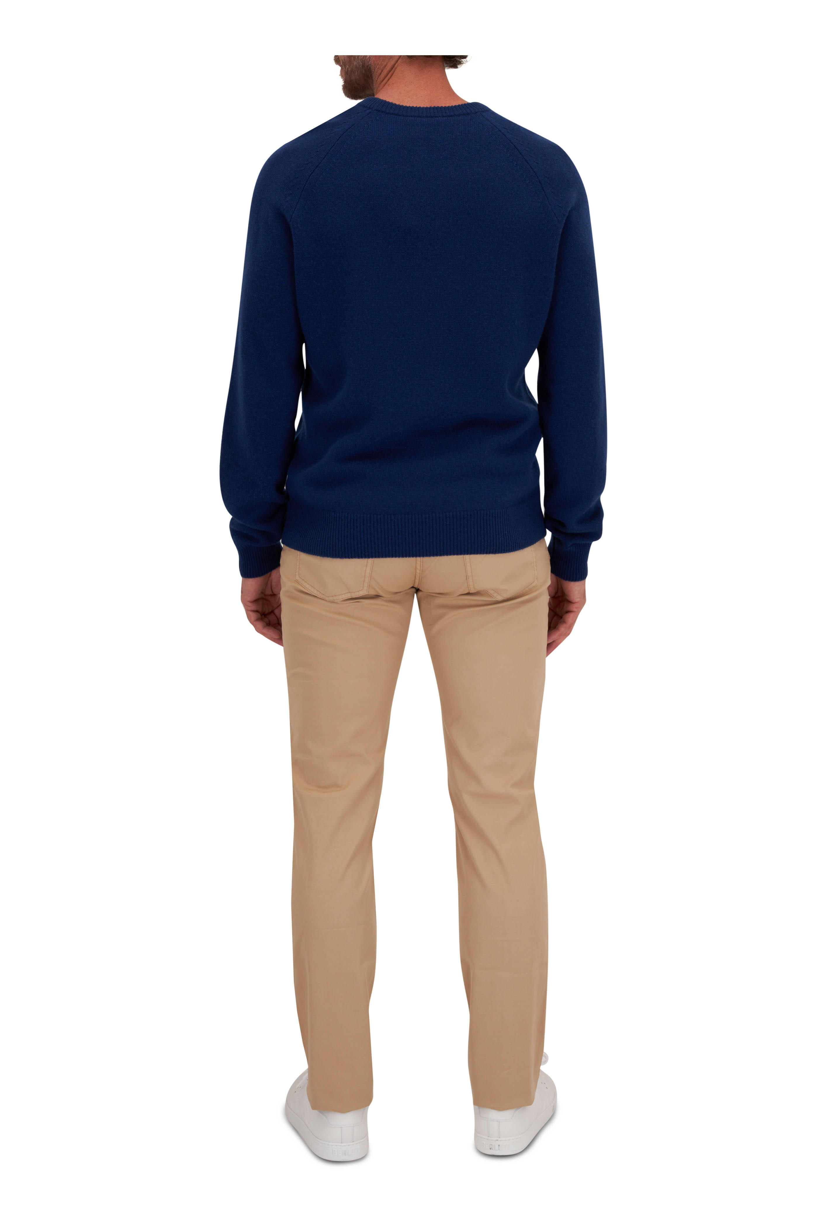 Crew neckline. Ribbed trims. Made in Italy. 100% cashmere. Dry clean.