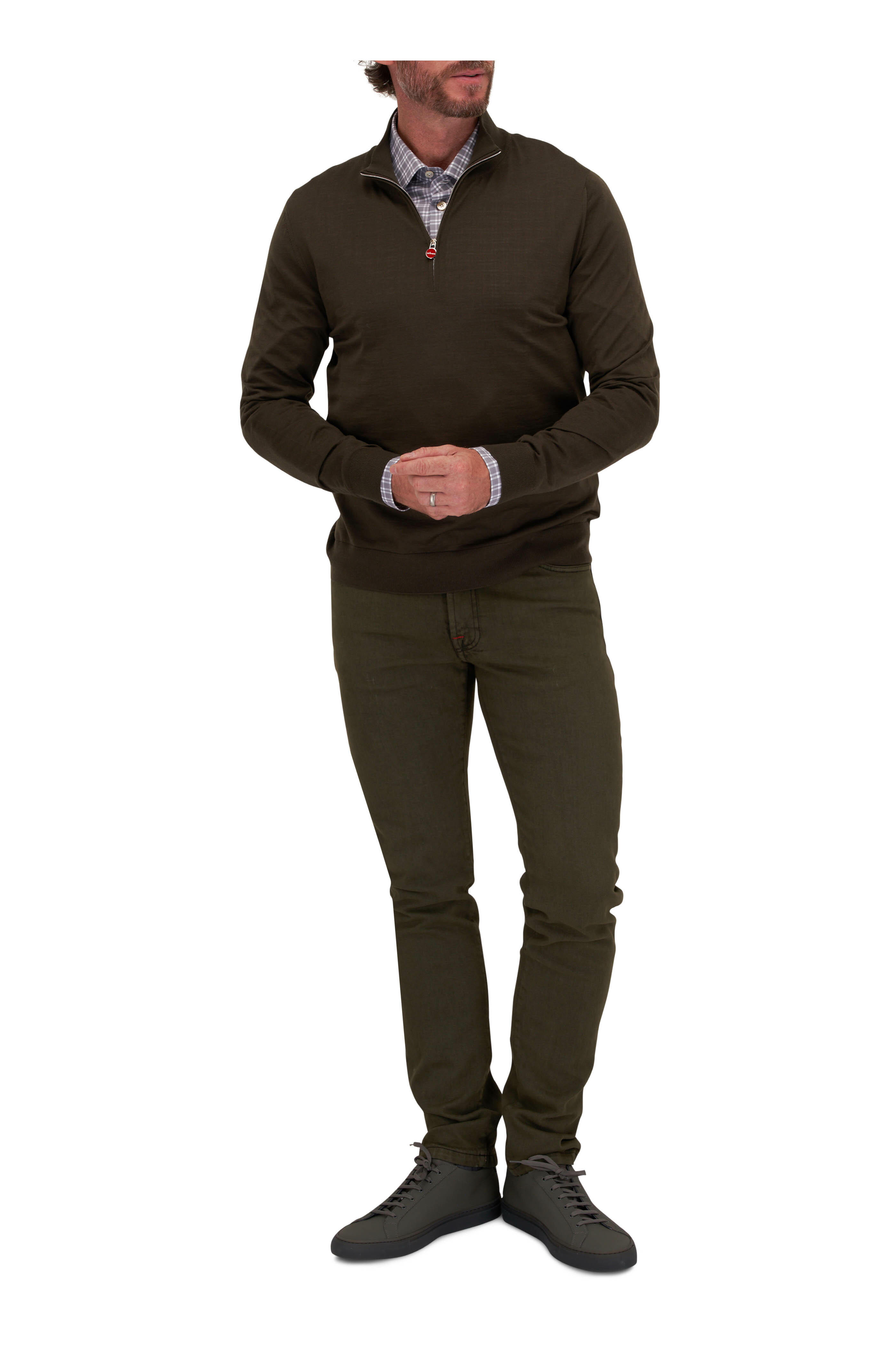 Spread collar. Front button placket. Single button mitered cuffs. Classic shirt tail hem. Made in Italy. 100% cotton.