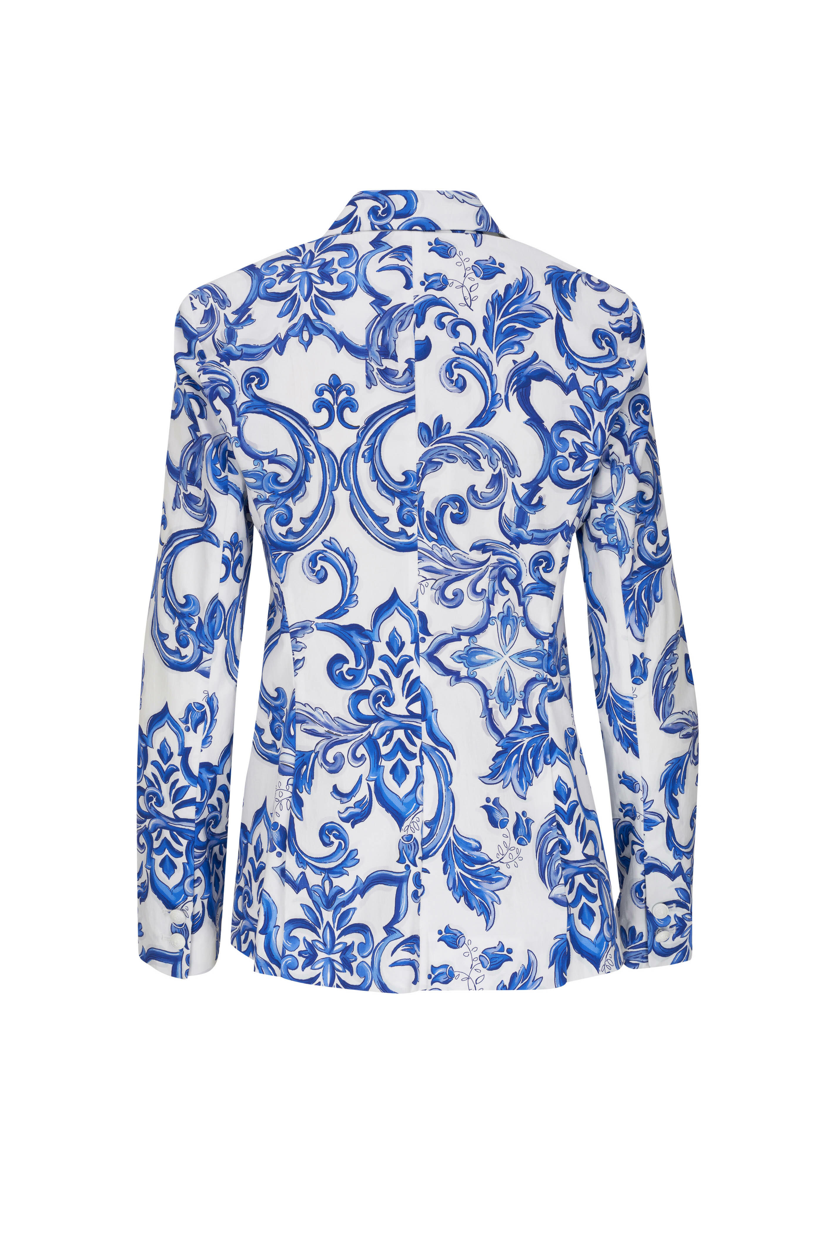 Peak lapels. Single button closure. Two button cuffs. Lower flap pockets. Double vent. Imported. 98% cotton, 2% spandex. Dry clean.