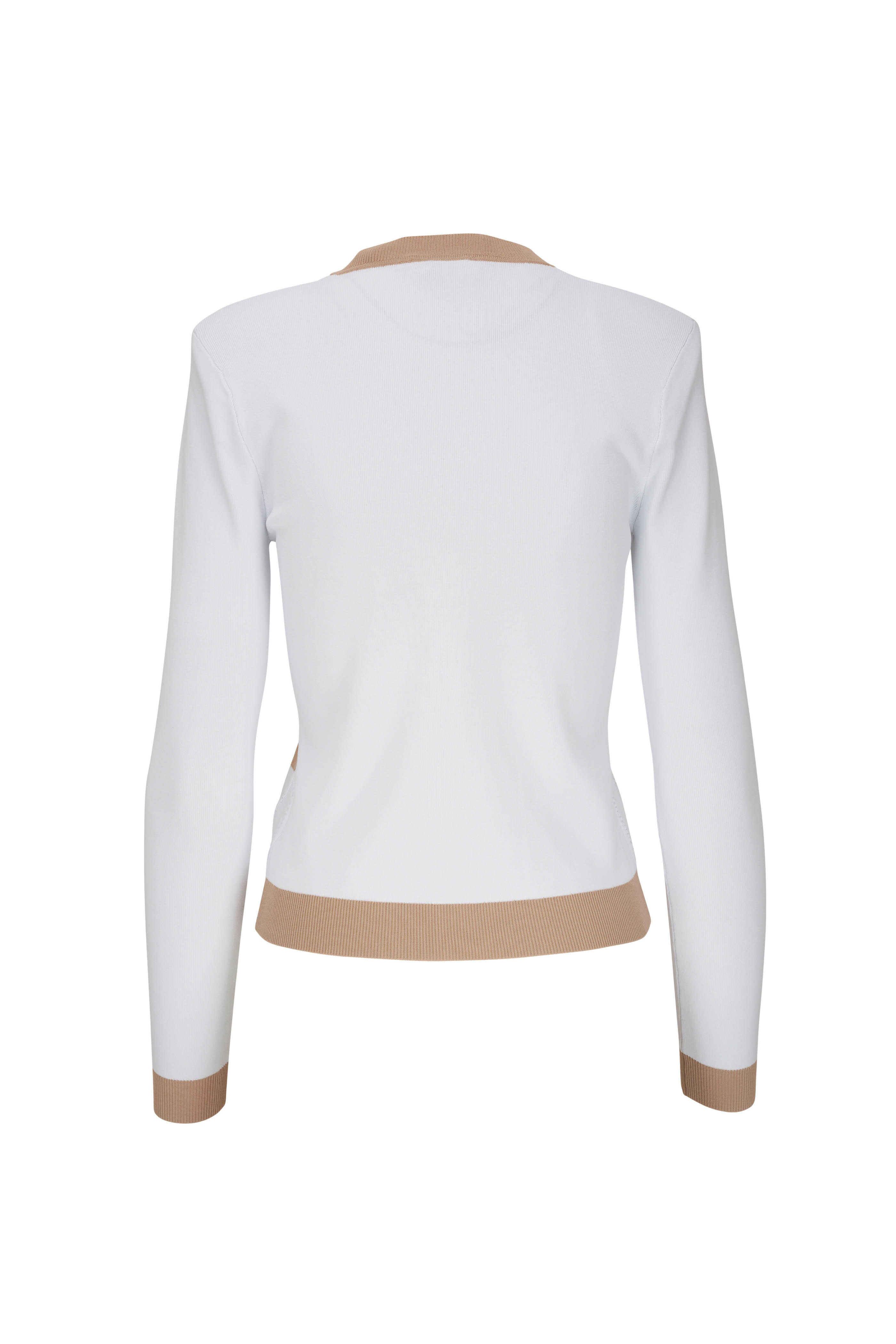 Crewneck. Front gold-tone embossed button placket. Lower patch pockets with button detail. Contrast trims. Imported. 80% rayon, 18% nylon, 2% spandex. Dry clean.