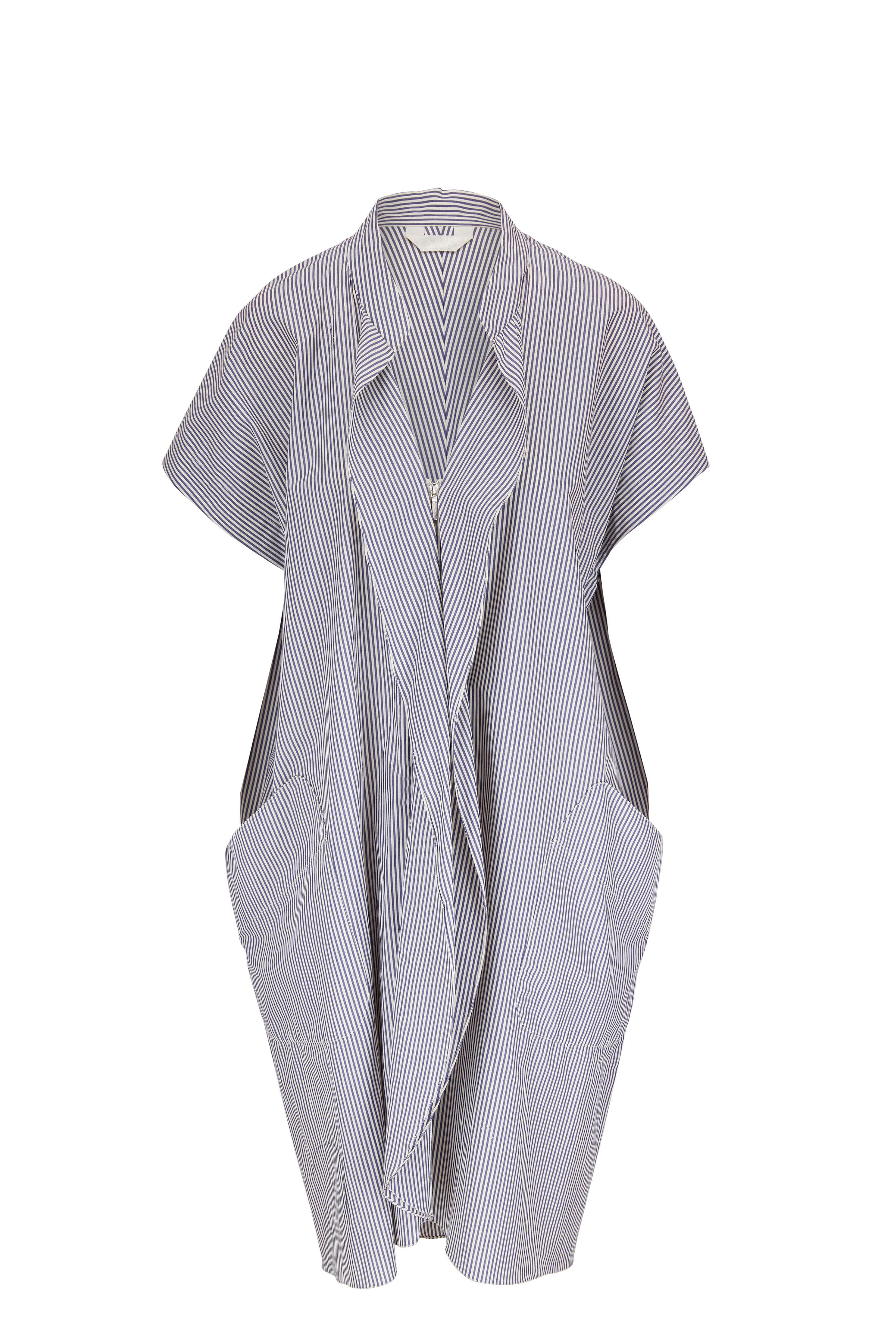 Ruffle v-neckline. Front zip placket. Lower waist patch pockets. Oversized short sleeves. Made in the USA. Oversized. Knee-length. 100% cotton. Machine wash.