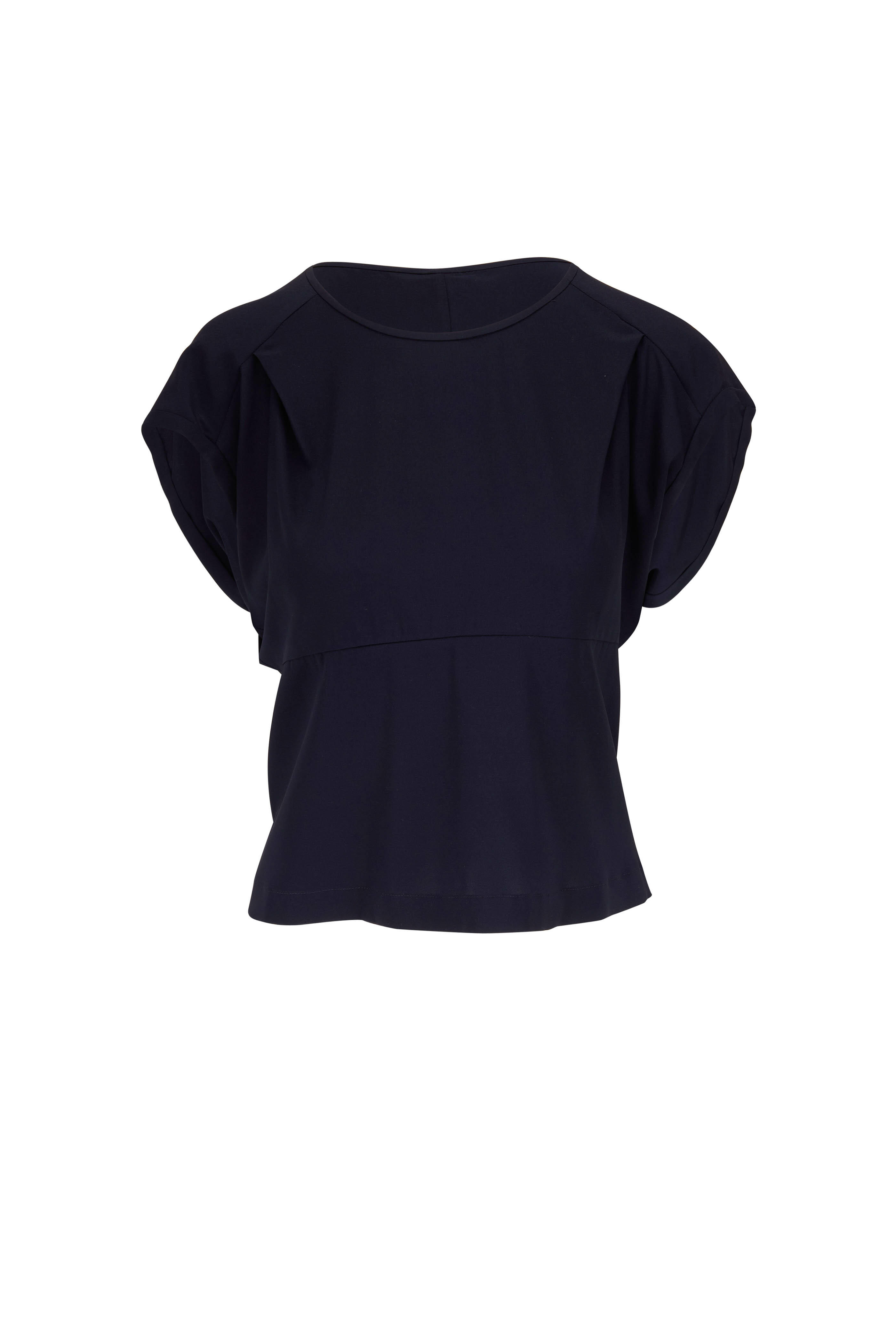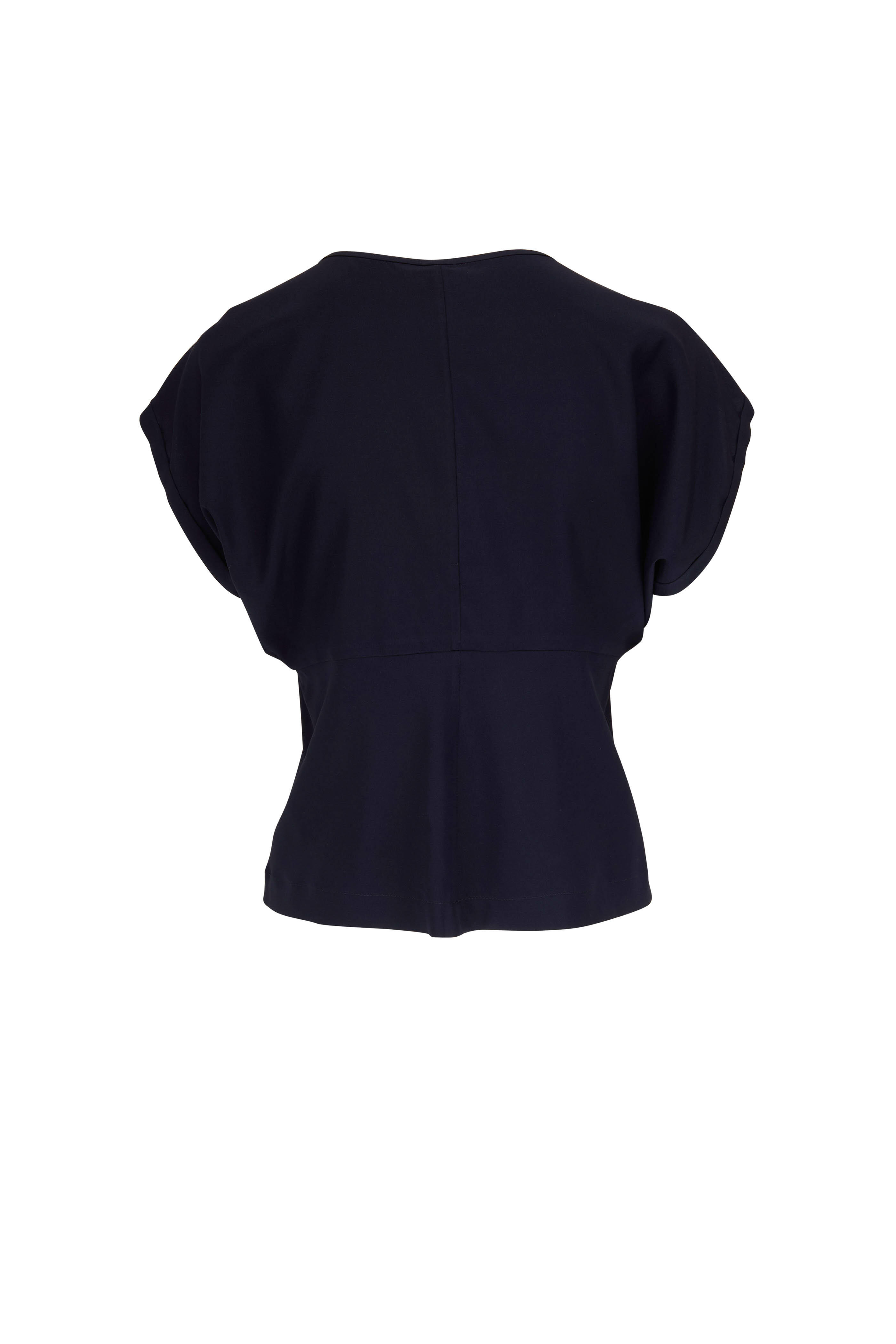 Round neckline. Slip on style. Short dolman sleeves. Imported. 95% silk, 5% elastane. Dry clean.