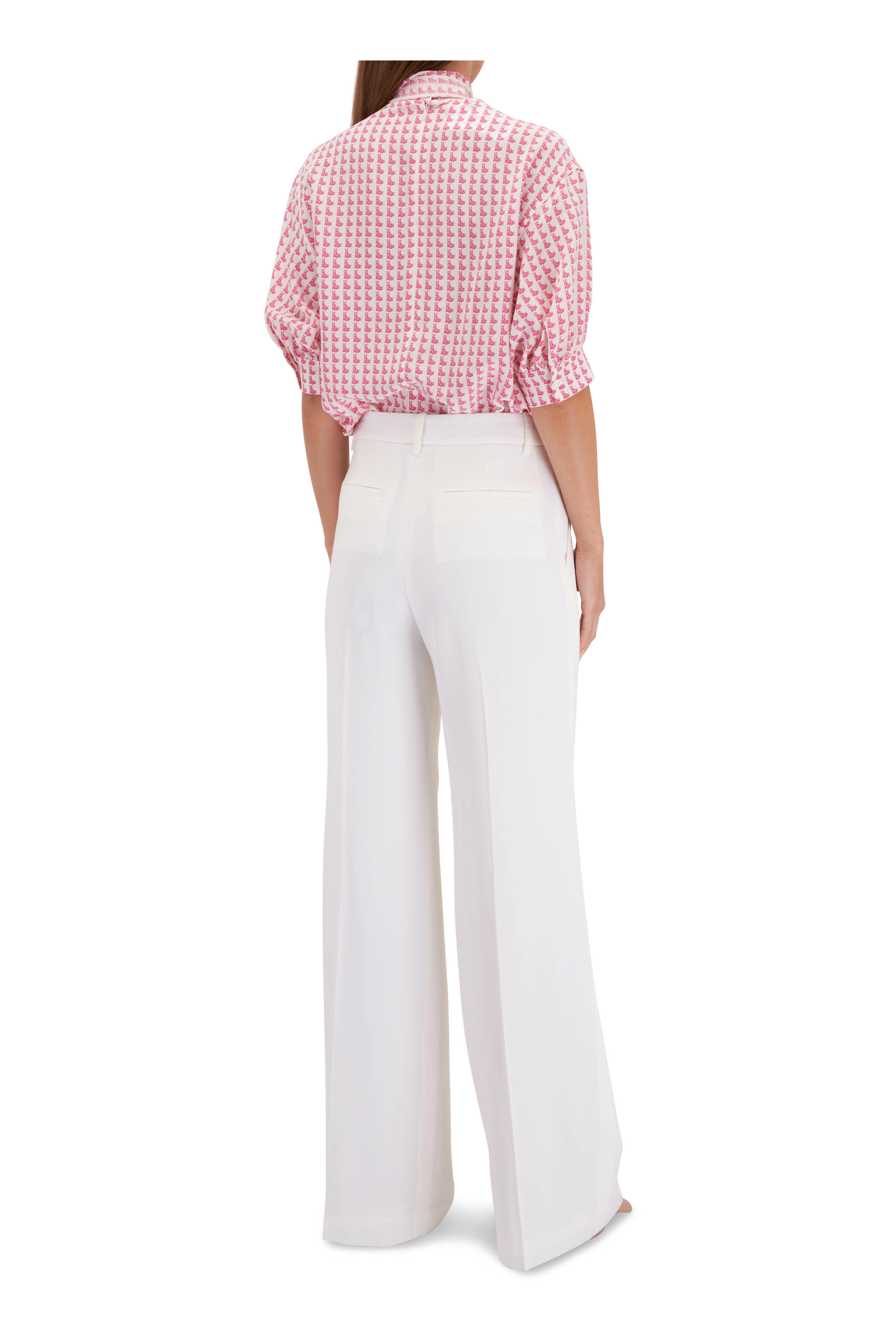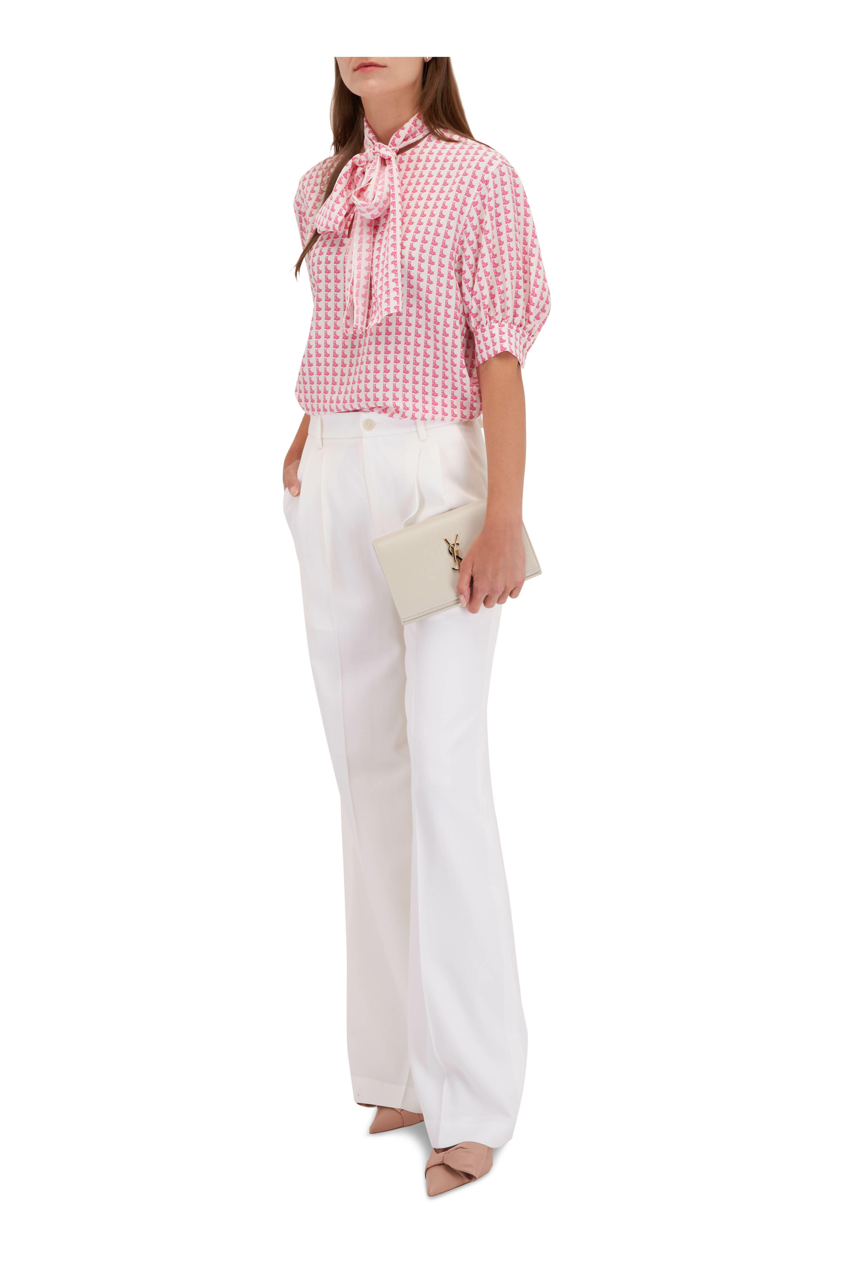 Crewneck; detachable self-tie neck scarf. Elbow sleeves; single button square cuffs. Vented hem. Imported. 26" shoulder to hem. 100% mulberry silk. Dry clean.