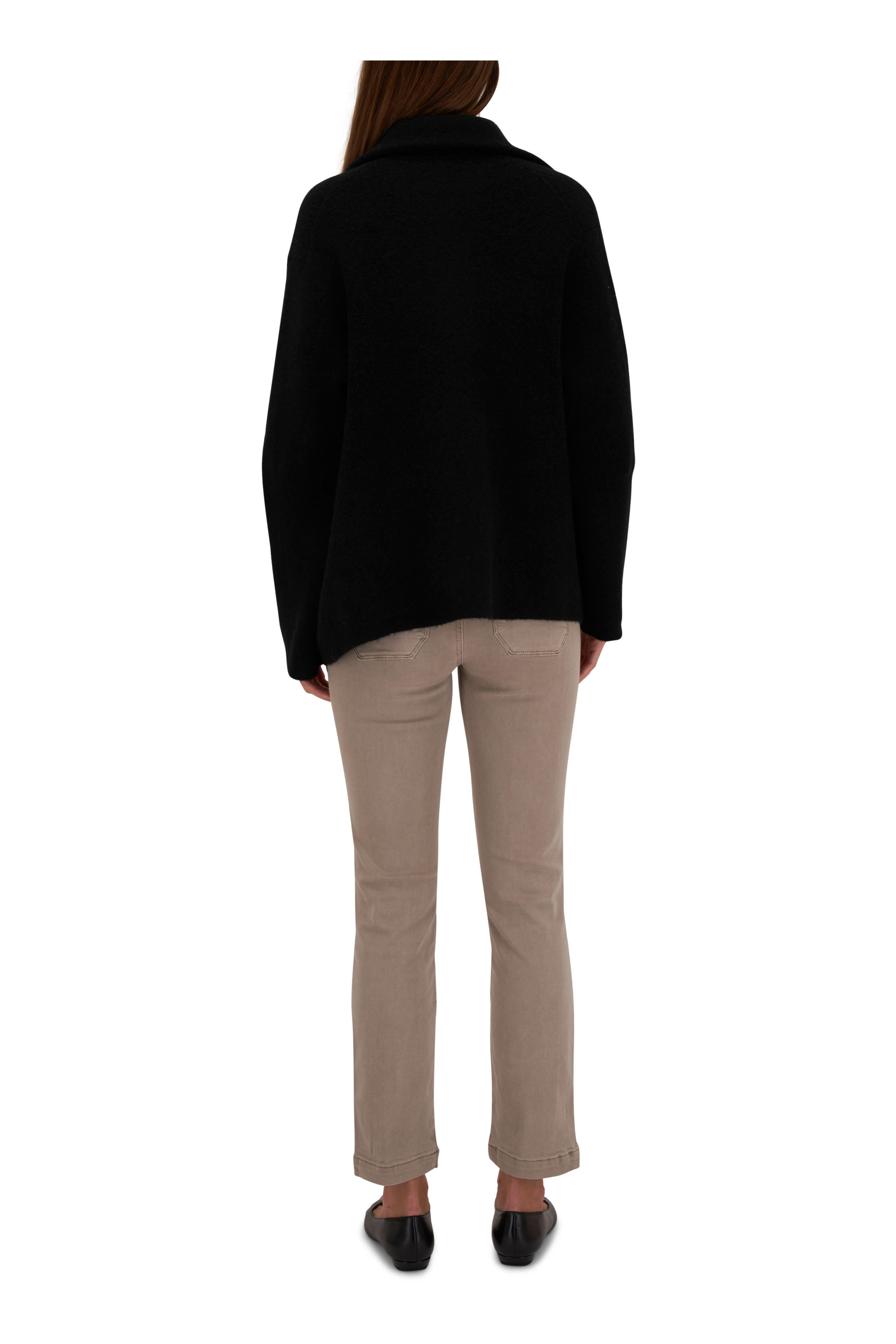 Spread collar. Front button placket. Drop shoulders. Side seam pockets. Imported. Oversized fit. 27" shoulder to hem. 36% wool, 26% nylon, 18% viscose, 18% alpaca, 2% spandex. Hand wash.