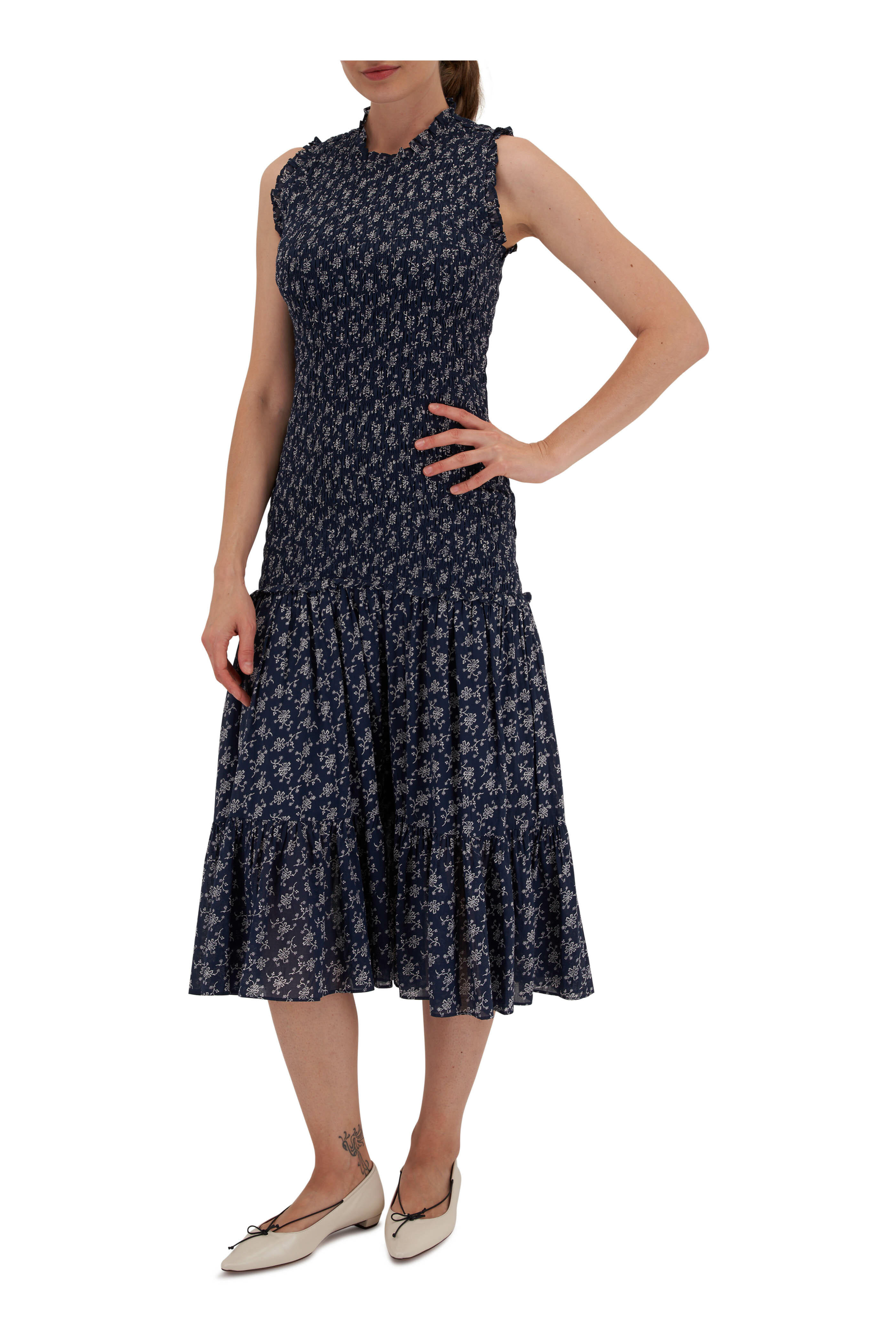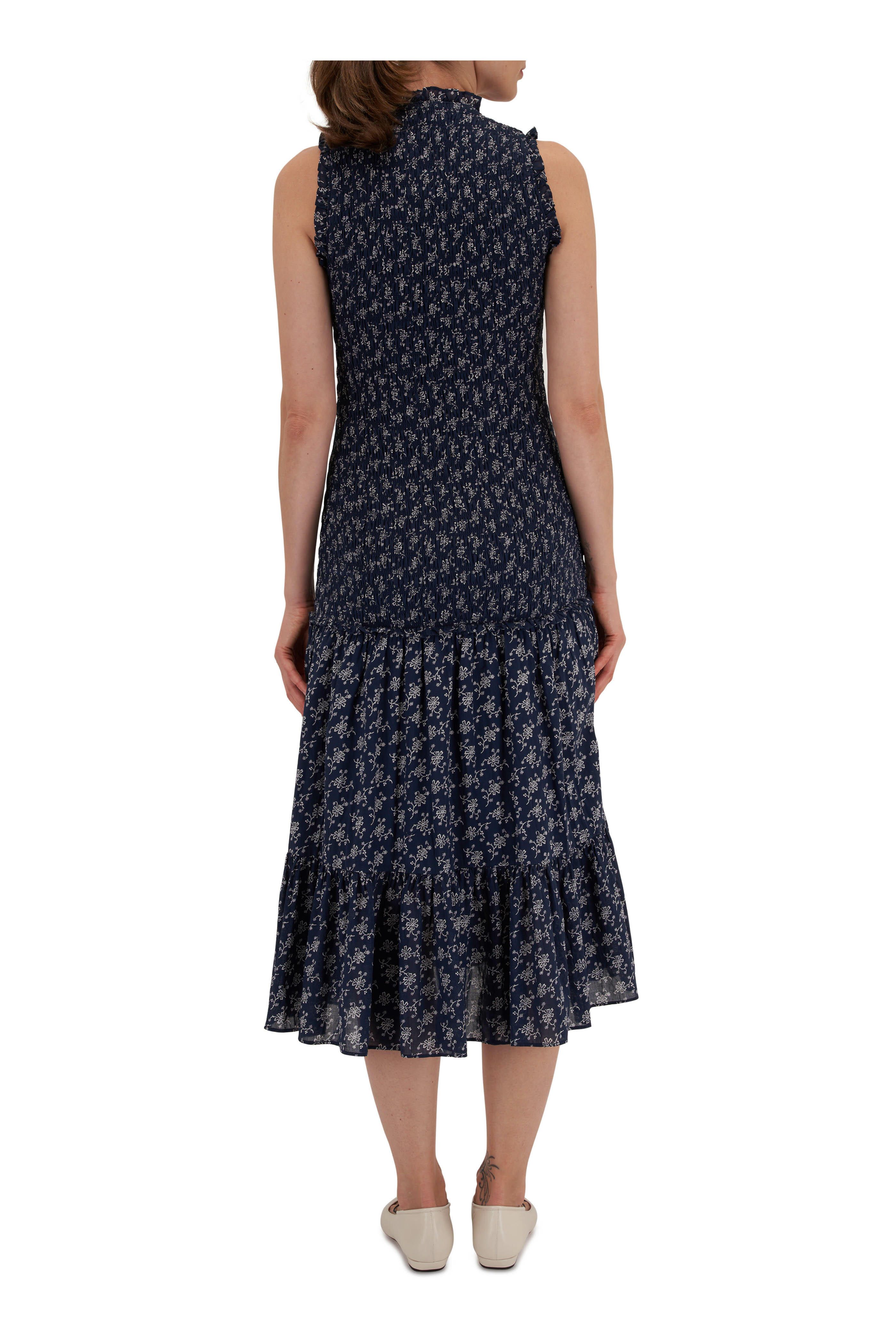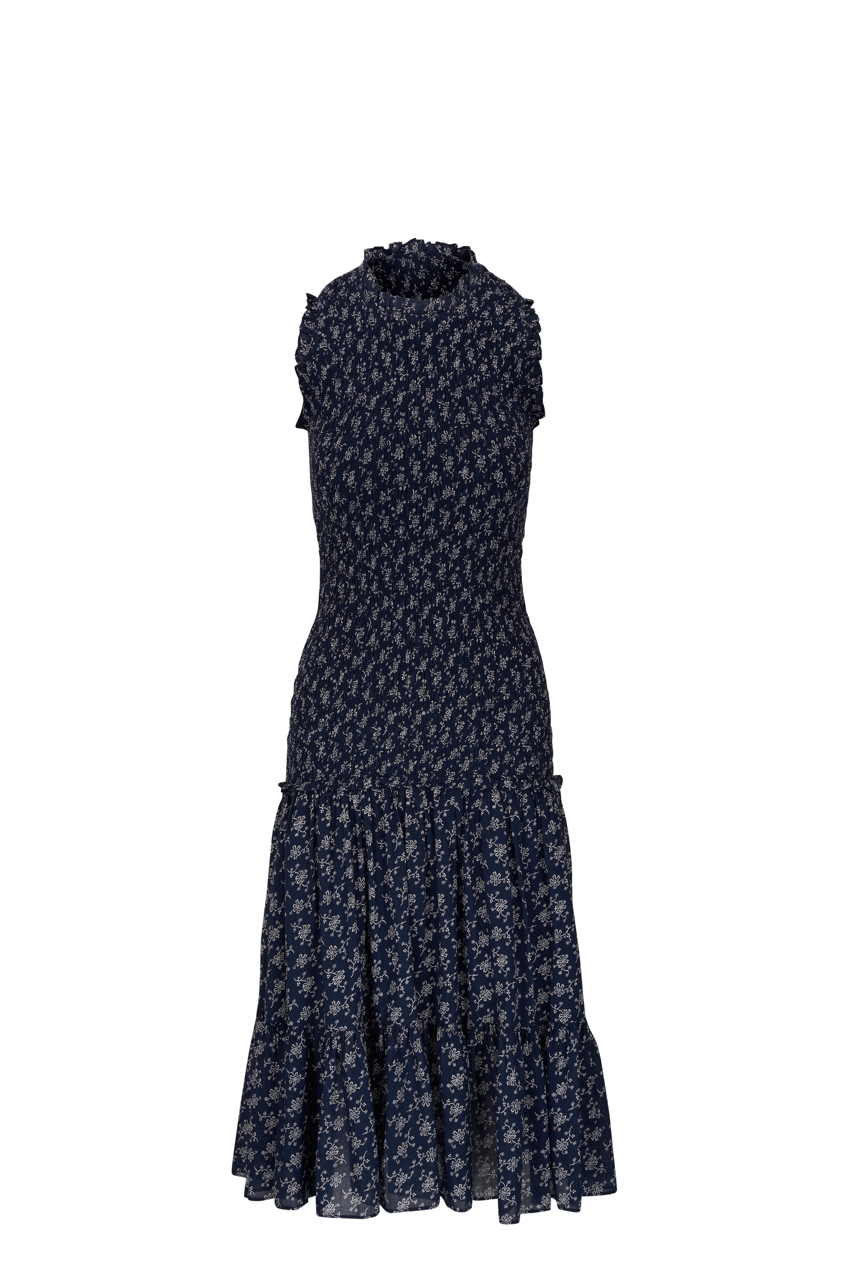 Crew neckline. Smocked bodice. Tiered skirt; ruffled trims. Imported. Color: Marine/ Off-White. 48" ½ Shoulder to hem. 100% cotton. Dry clean.