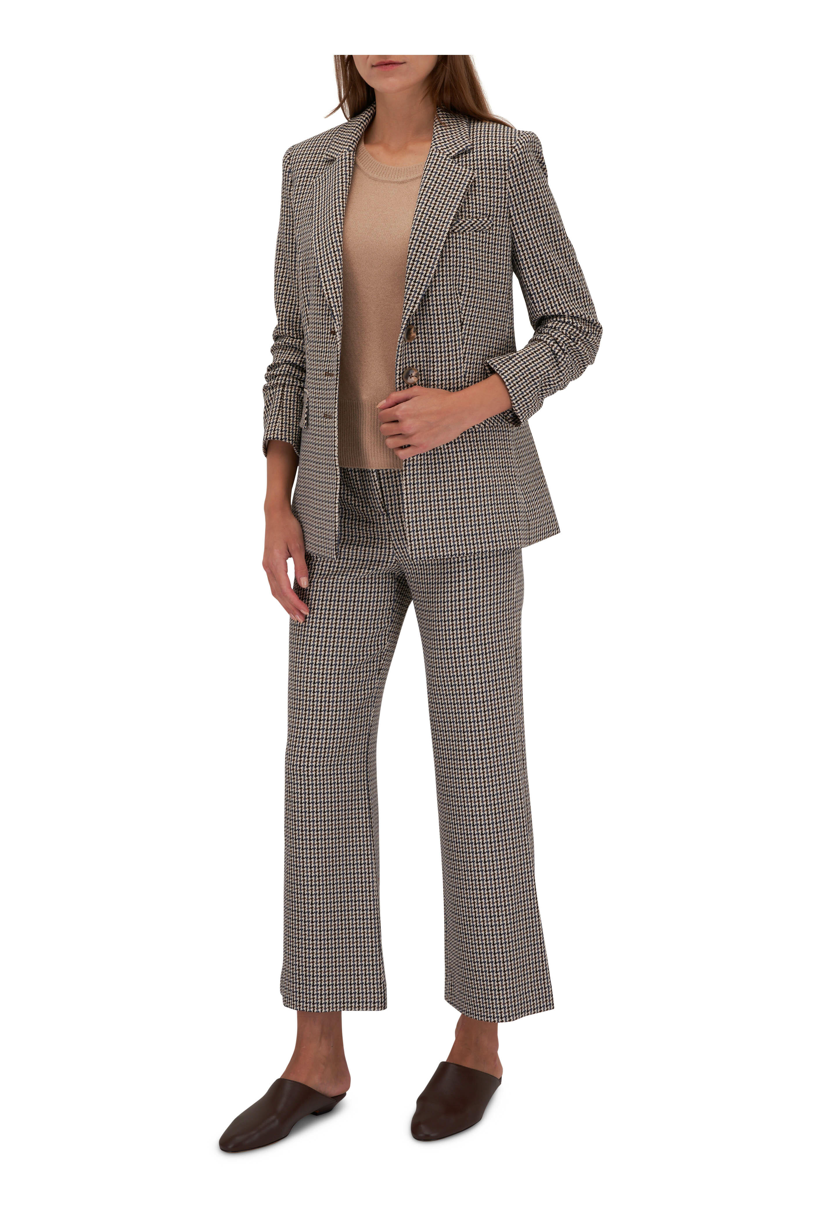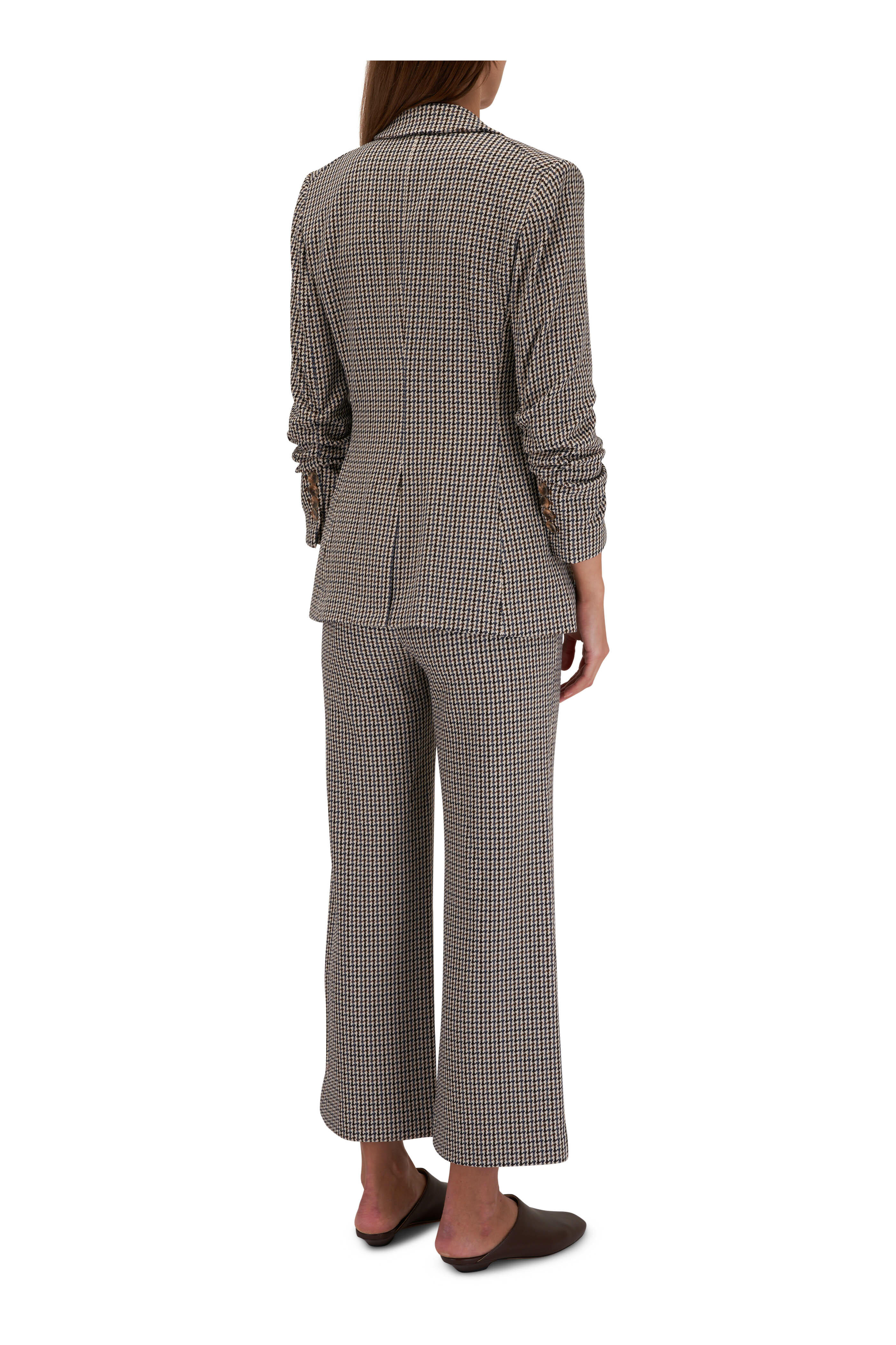 Notch lapels. Three-button closure. Three-quarter length ruched sleeves; four button cuffs. Lower waist flap pockets. Single vent. Imported. Compatible with all Veronica Beard dickeys (sold separately). 62% polyester, 34% viscose, 4% elastane; lining: 96% polyester, 4% elastane; partially lined. Dry clean.