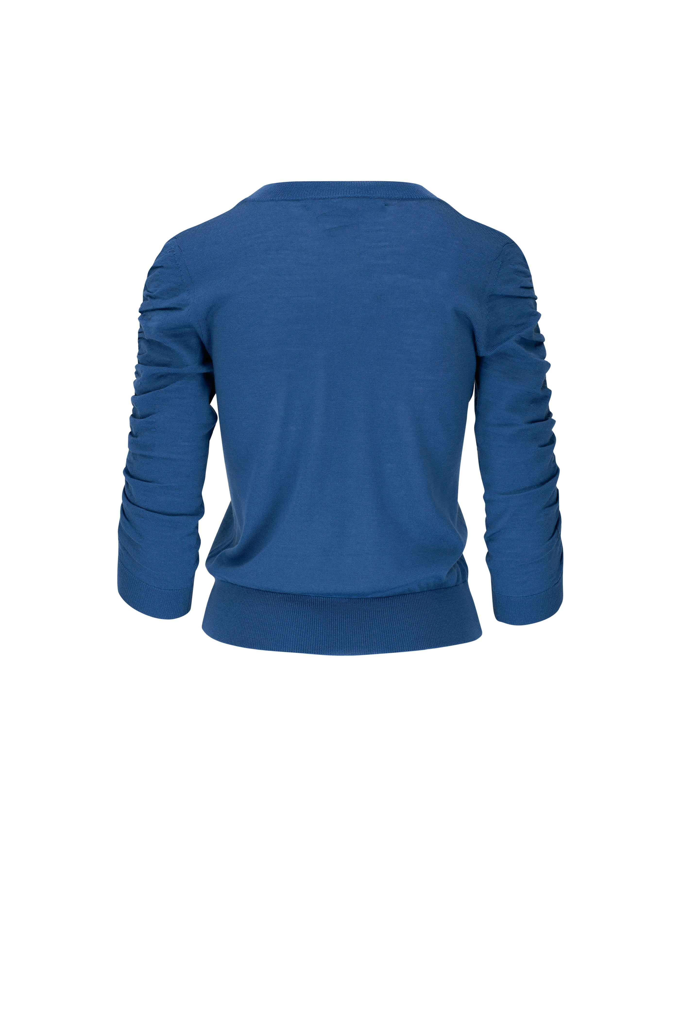 Crew neckline. Three-quarter ruched sleeves. Imported. 100% wool. Dry clean.