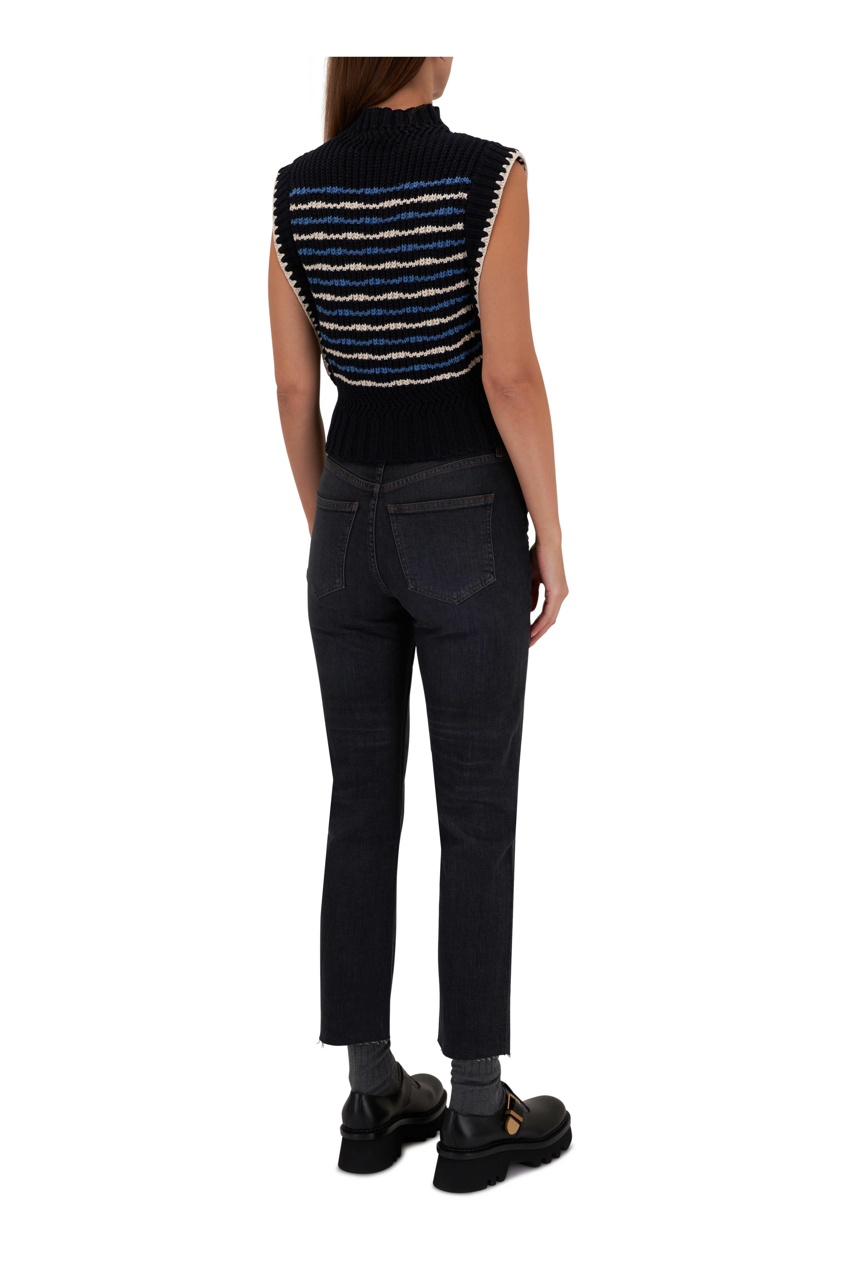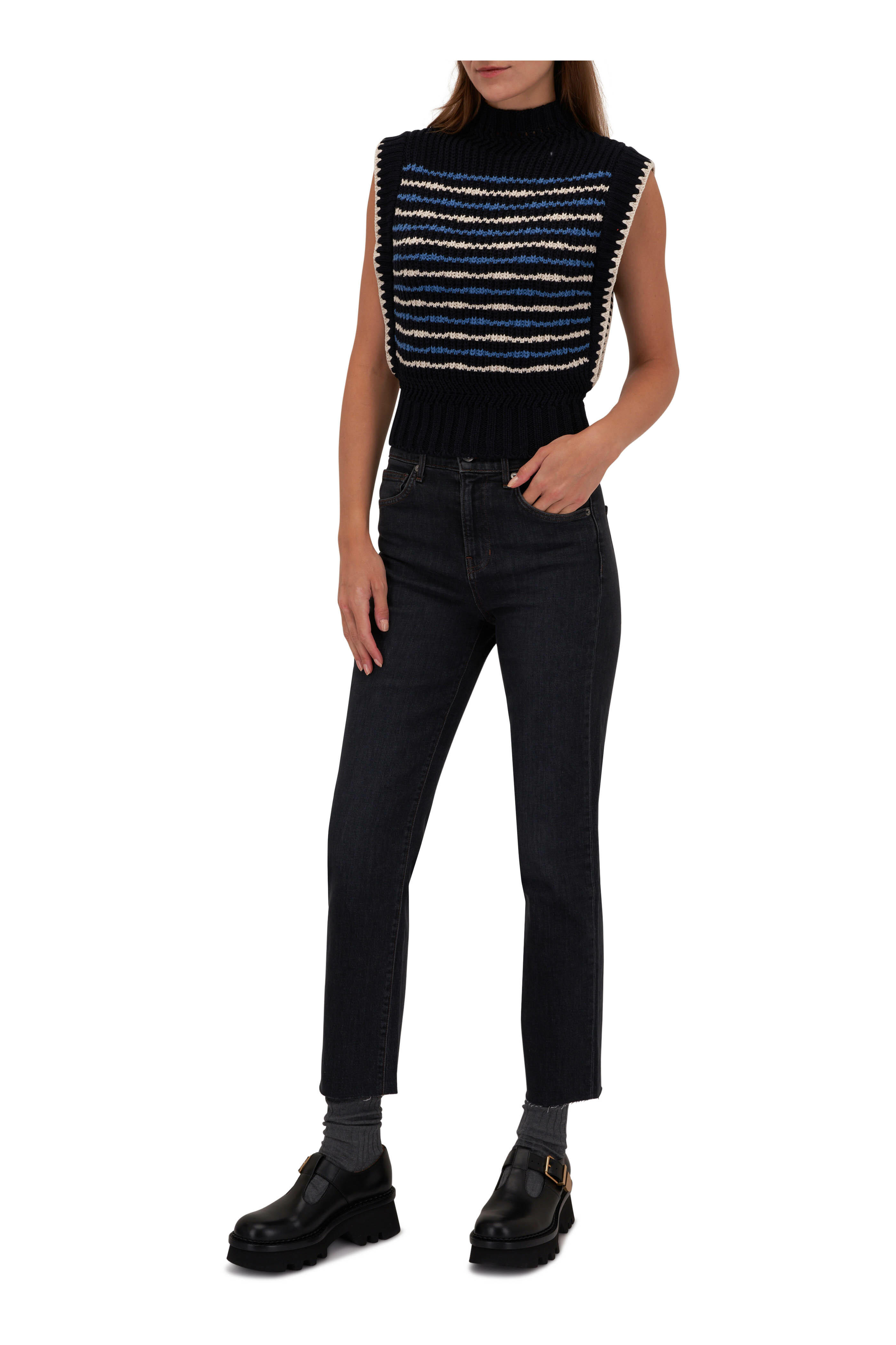 Zip fly with button closure. Belt loops. Five pocket styling. Imported. Color: Vanishing Point. Rise 11 3/4". Inseam 27". Leg opening 15 1/2". 98% cotton, 2% elastane. Dry clean.