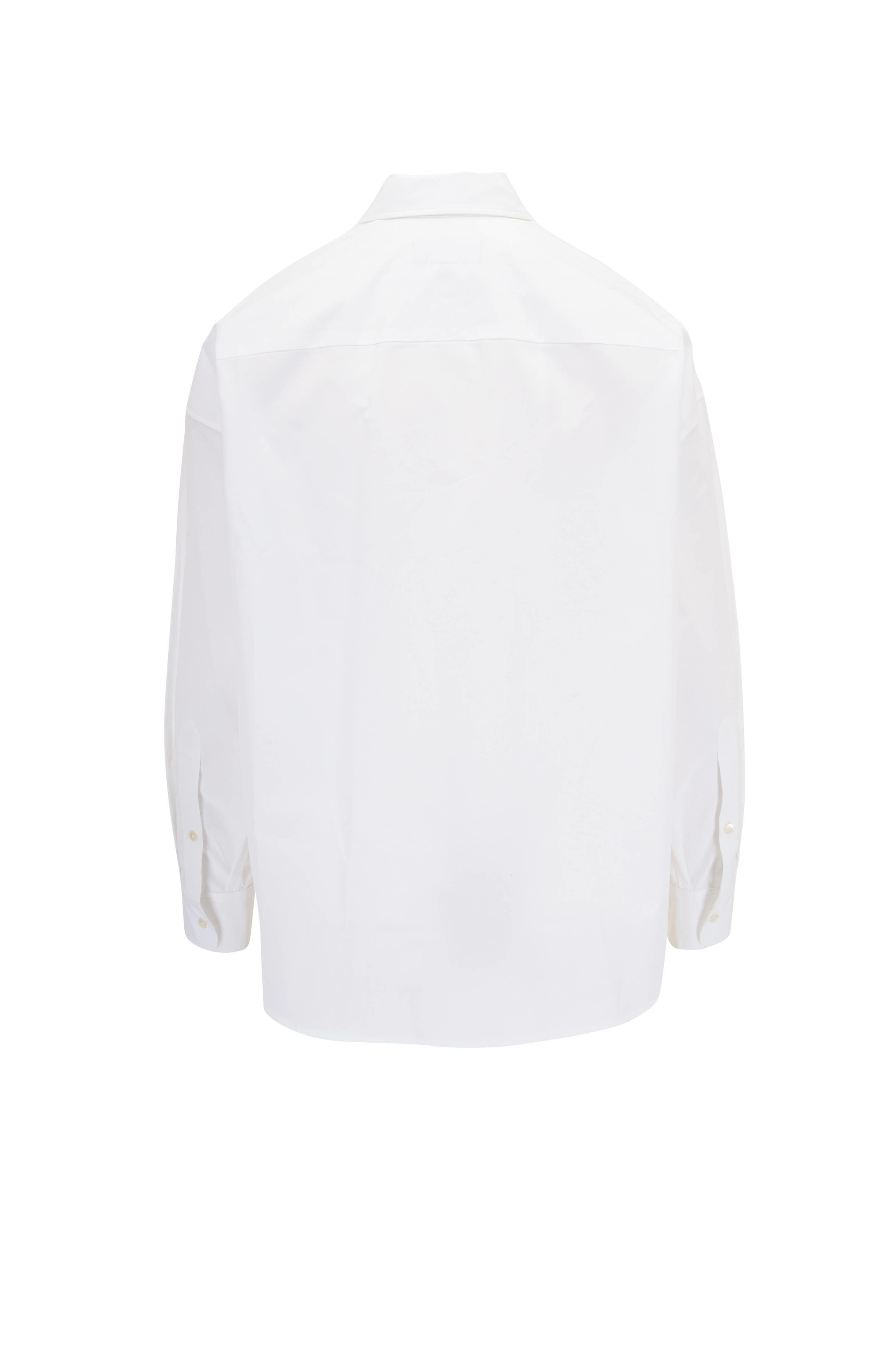 Pointed collar. Front button placket. Single button rounded cuffs. Dress-shirt hem. Made in the USA. 100% cotton. Machine wash.