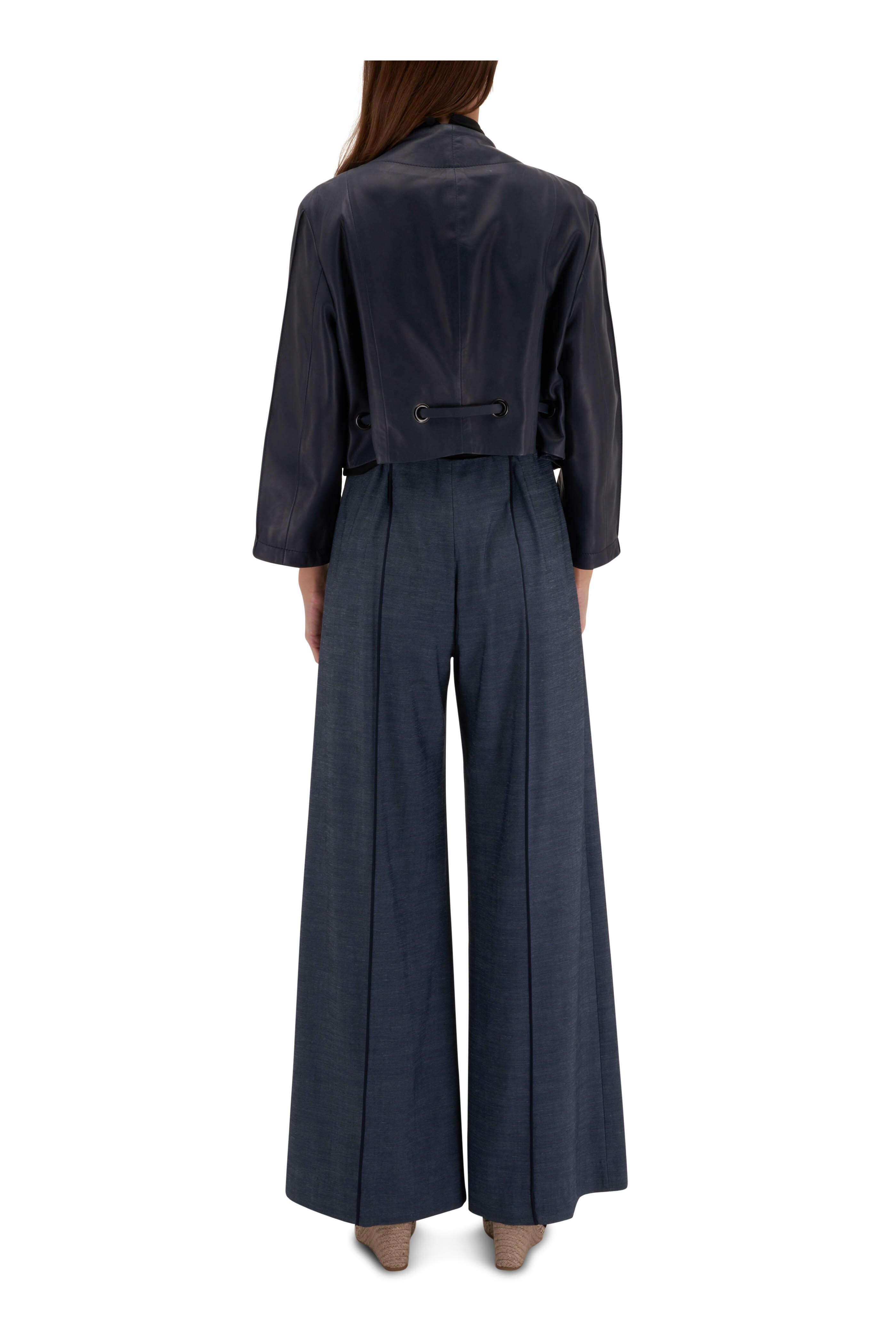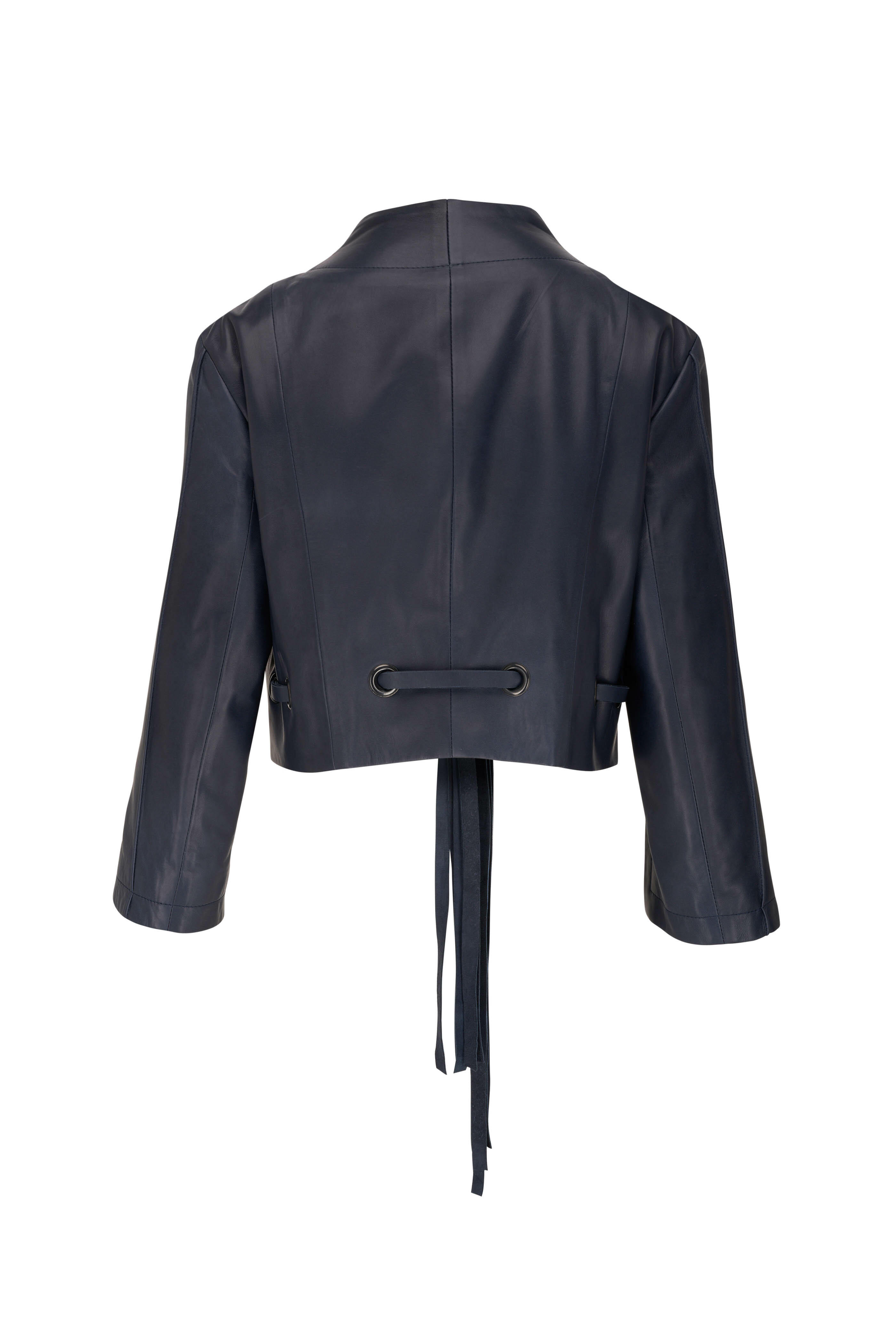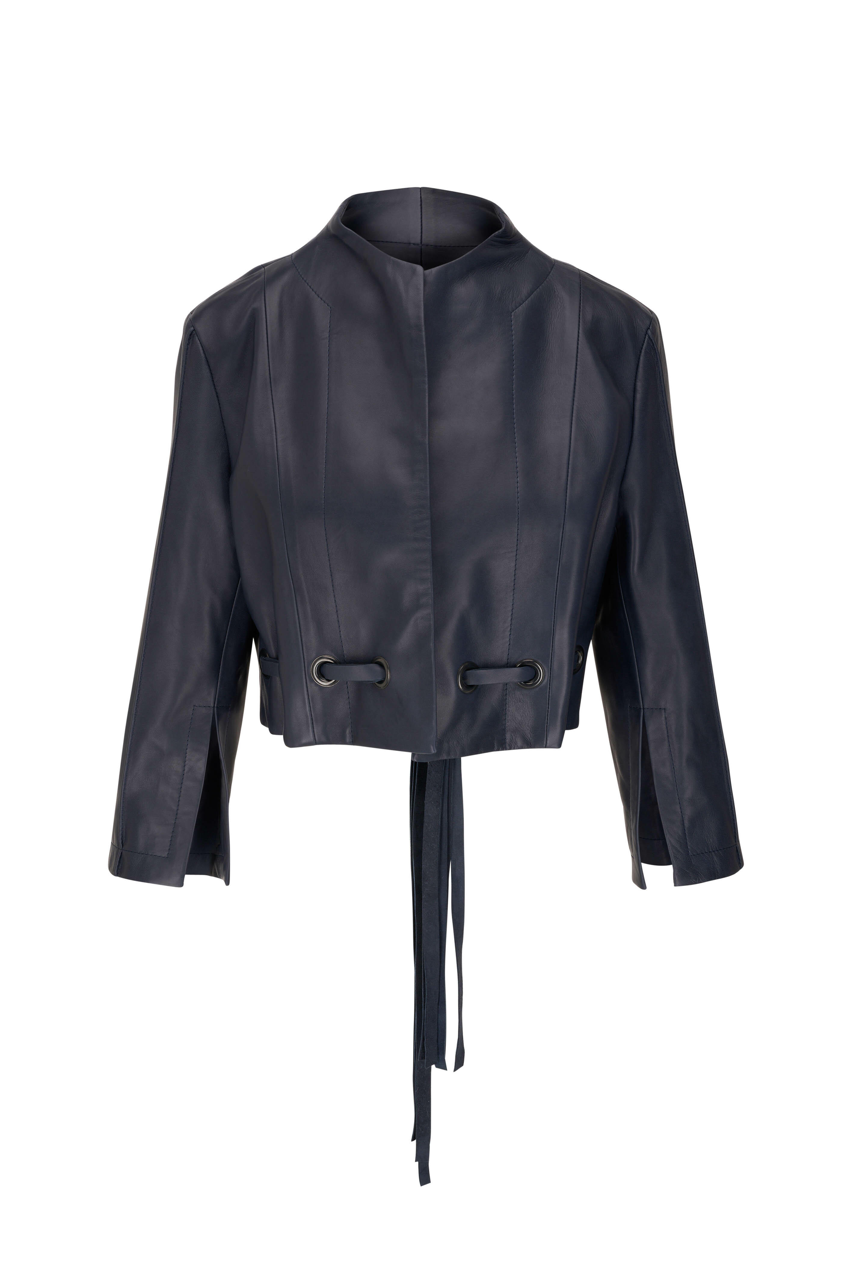 Specialist clean. Slight funnel neckline. Open front. Bracelet sleeves; split cuffs. Belt loops; detachable fringe self-tie belt. Cropped hem. Made in italy. 17" shoulder to hem. Lambskin leather; lining: 100% silk.