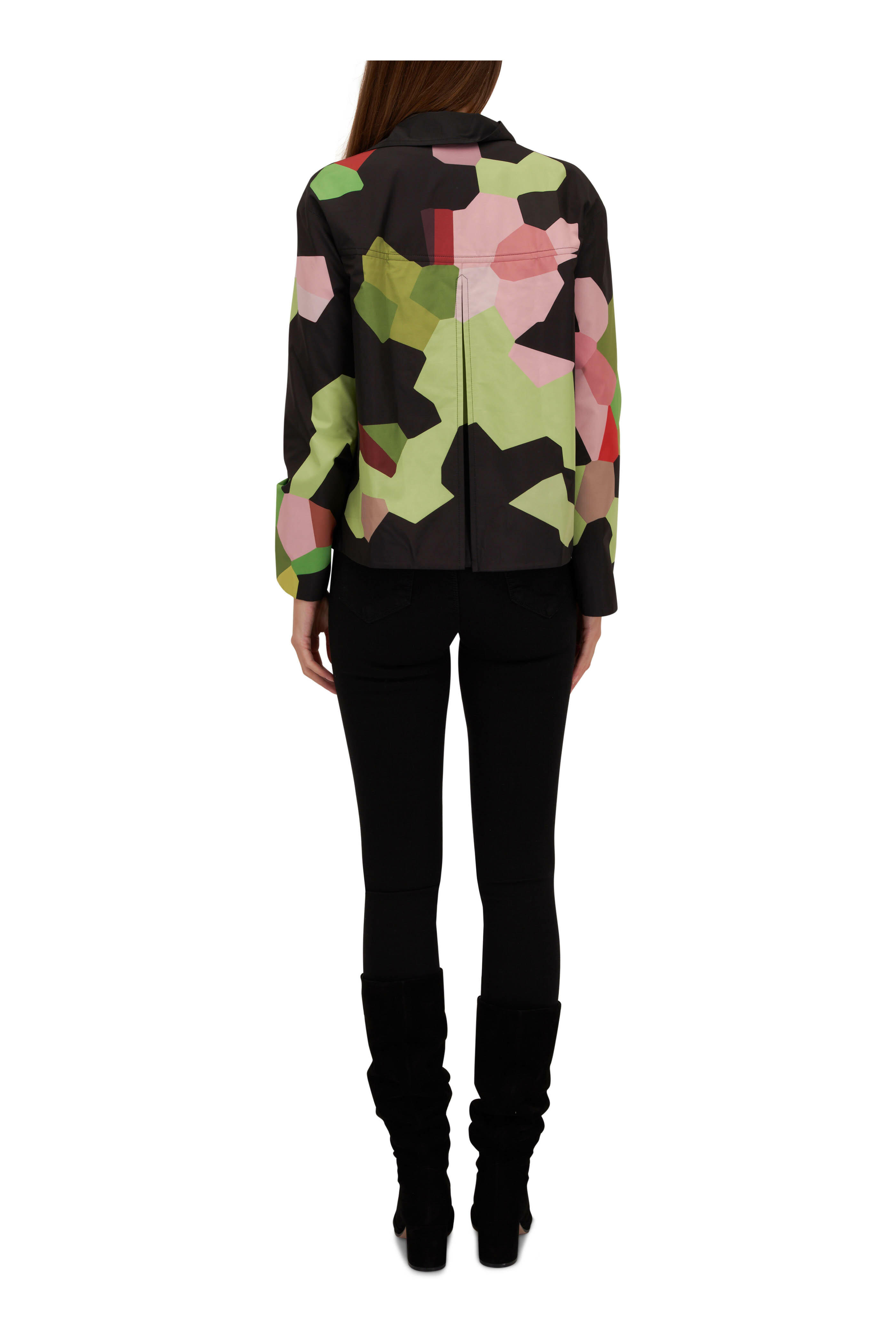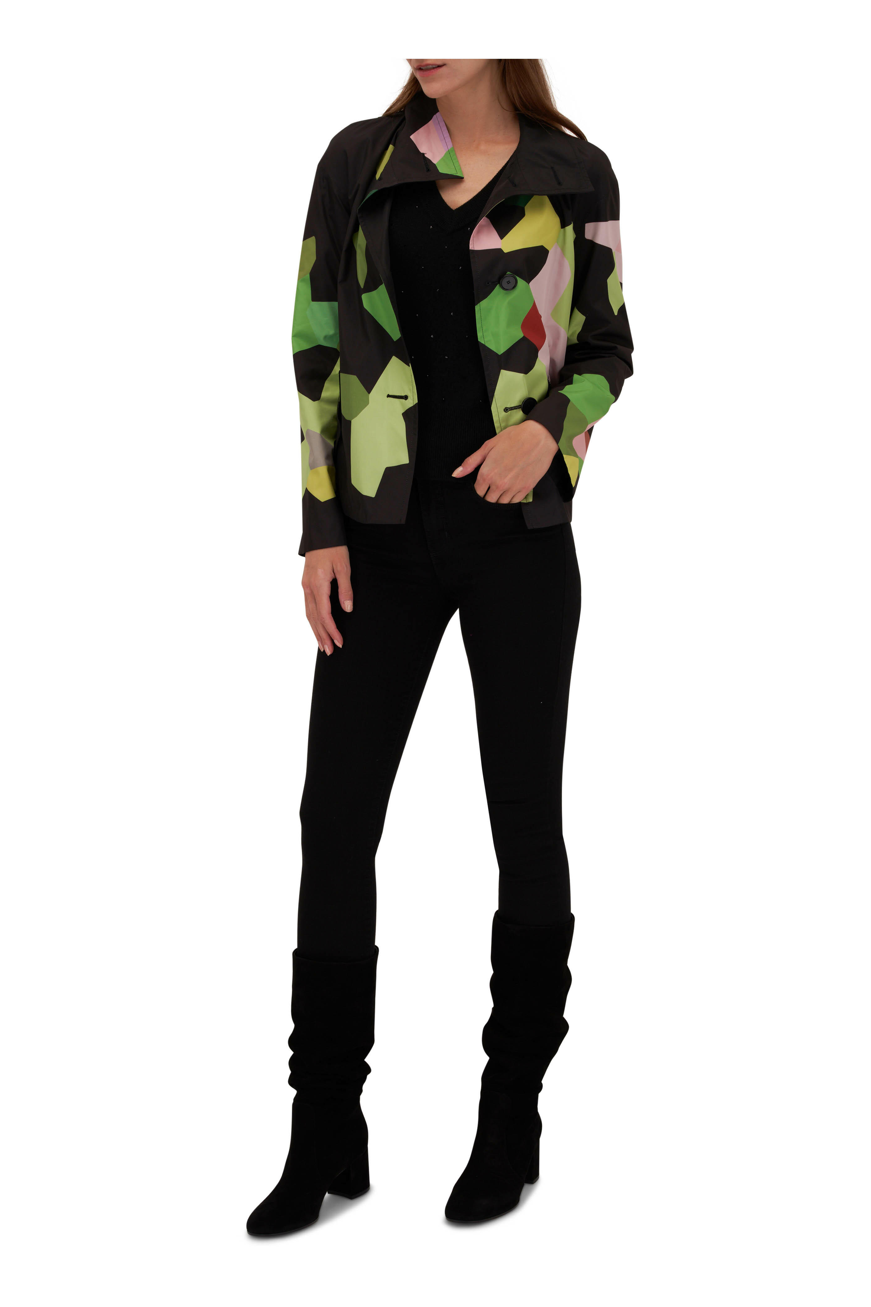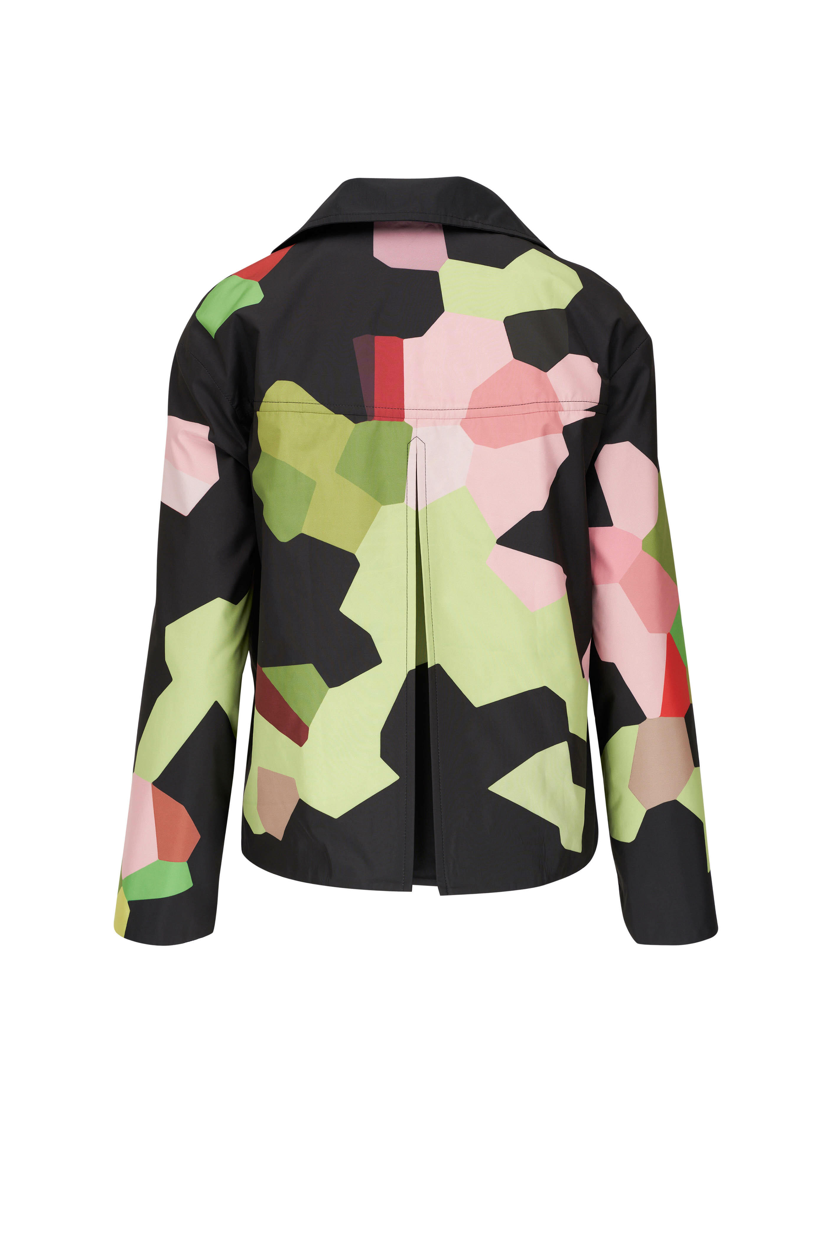 Stand collar. Front button placket. Lower waist pockets. Straight hem. Reverses to solid black. Fabric from Italy. 100% polyester. Dry clean.