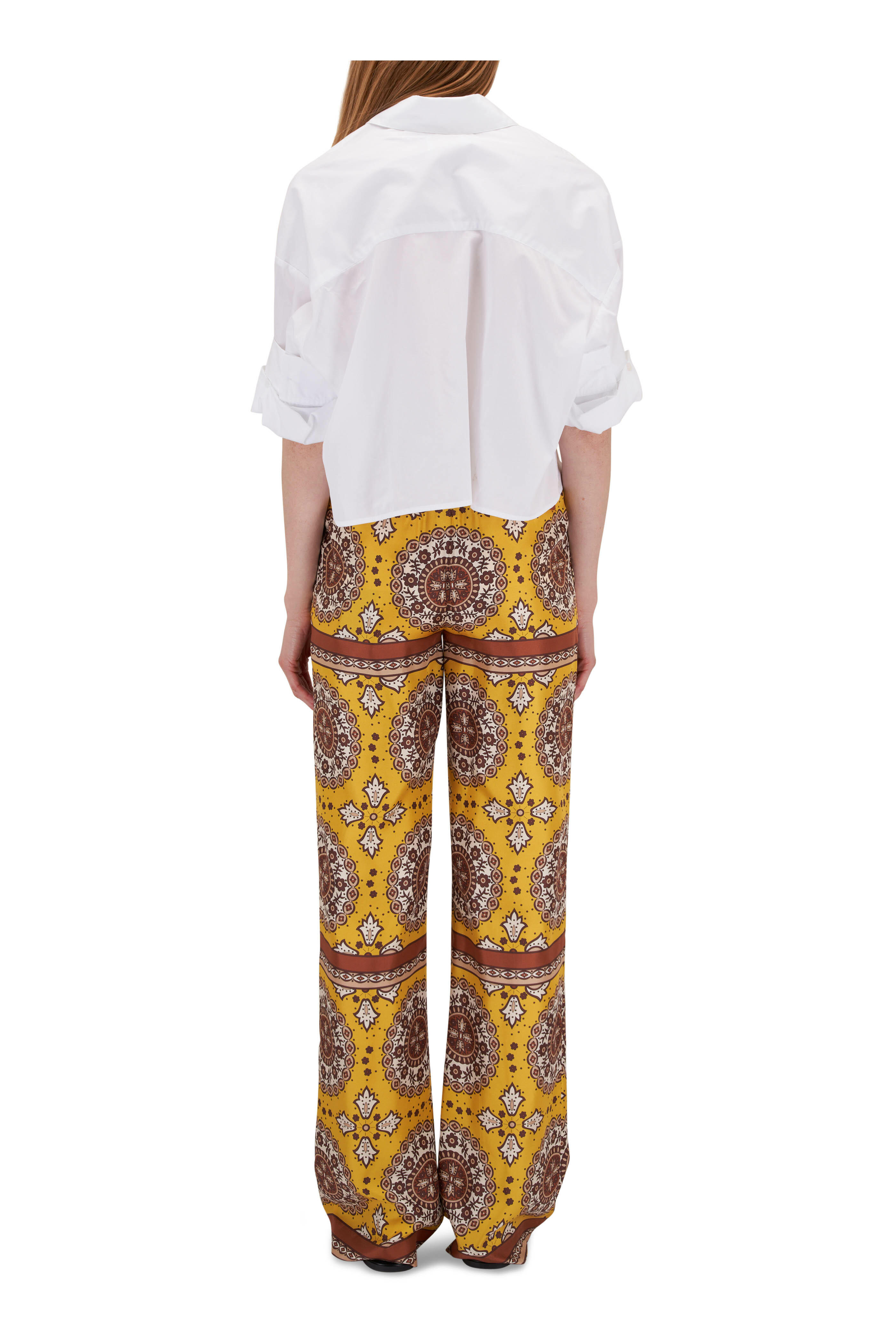 Zip fly with button closure. Concealed side-seam pockets; Faux back welt pockets. Made in the USA. Color: Scarf Print Yellow. Size 4 measures approximately 30 5/8" waist circumference, 38" low hip circumference, 34" inseam, 21" leg opening, 12 5/8" front rise. 100% silk. Dry clean.
