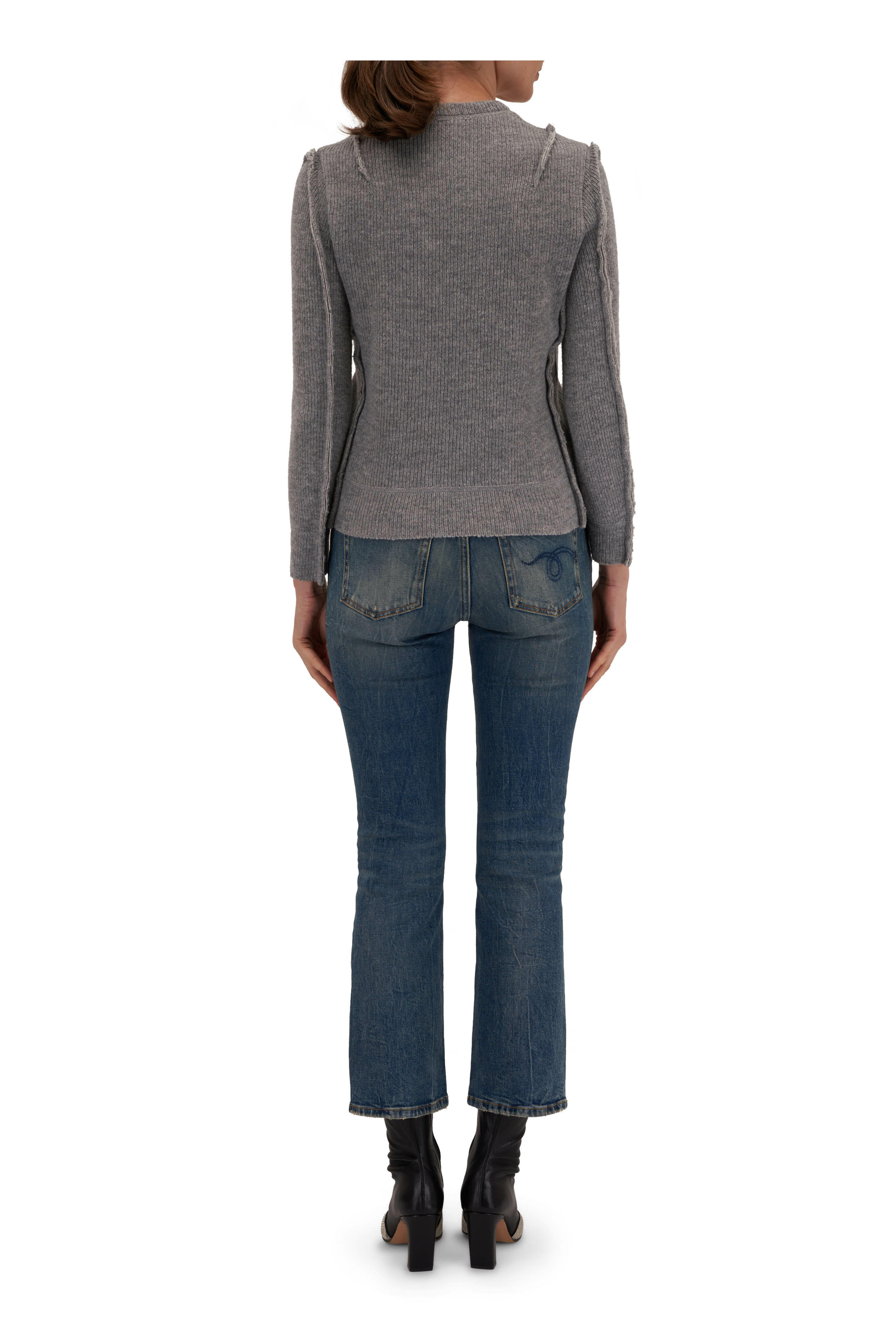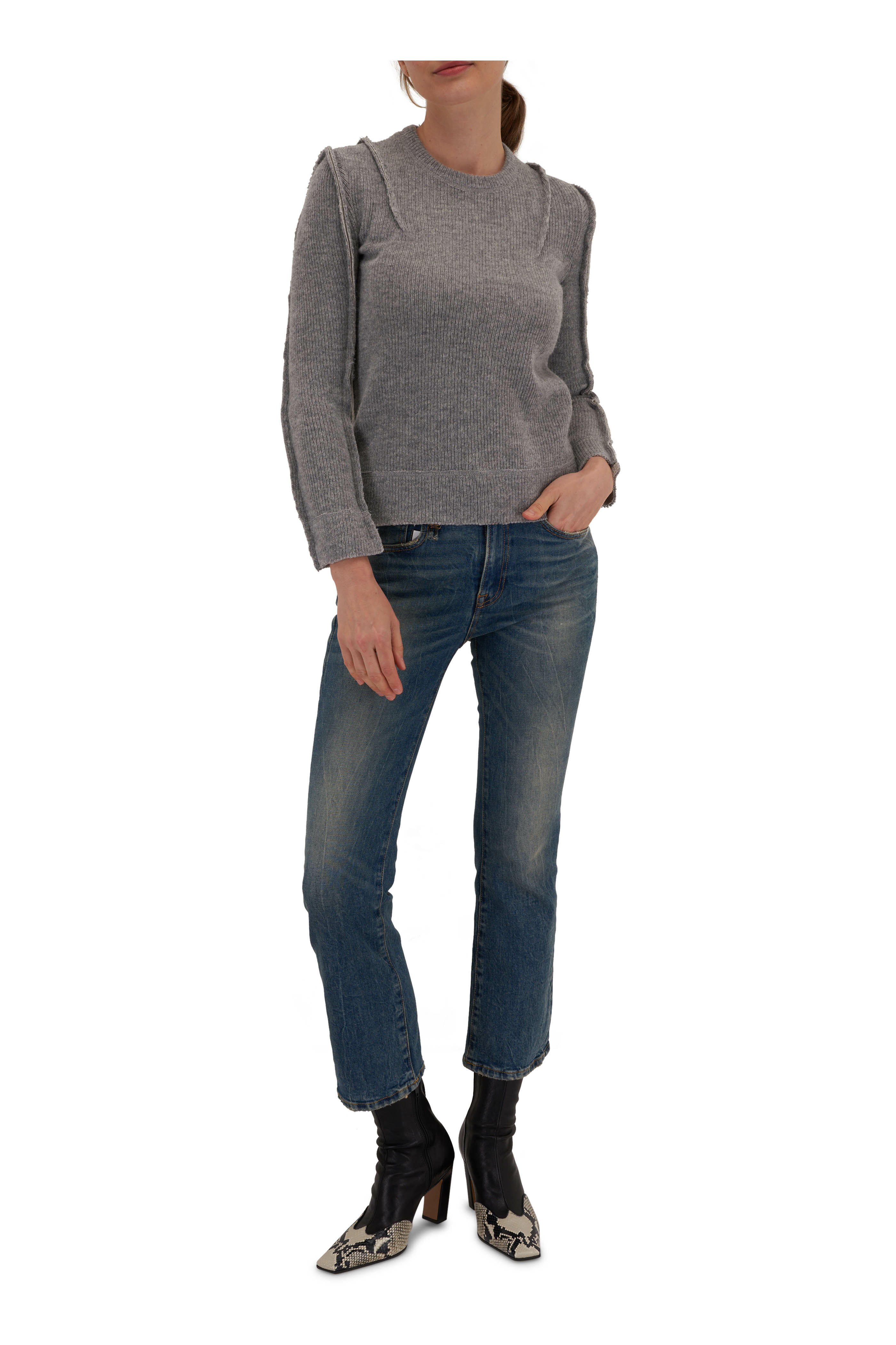 Crew neckline. Ribbed trims. Seam details. Imported. Color: Heather Gray. 56% wool, 27% cotton, 17% nylon. Hand wash.