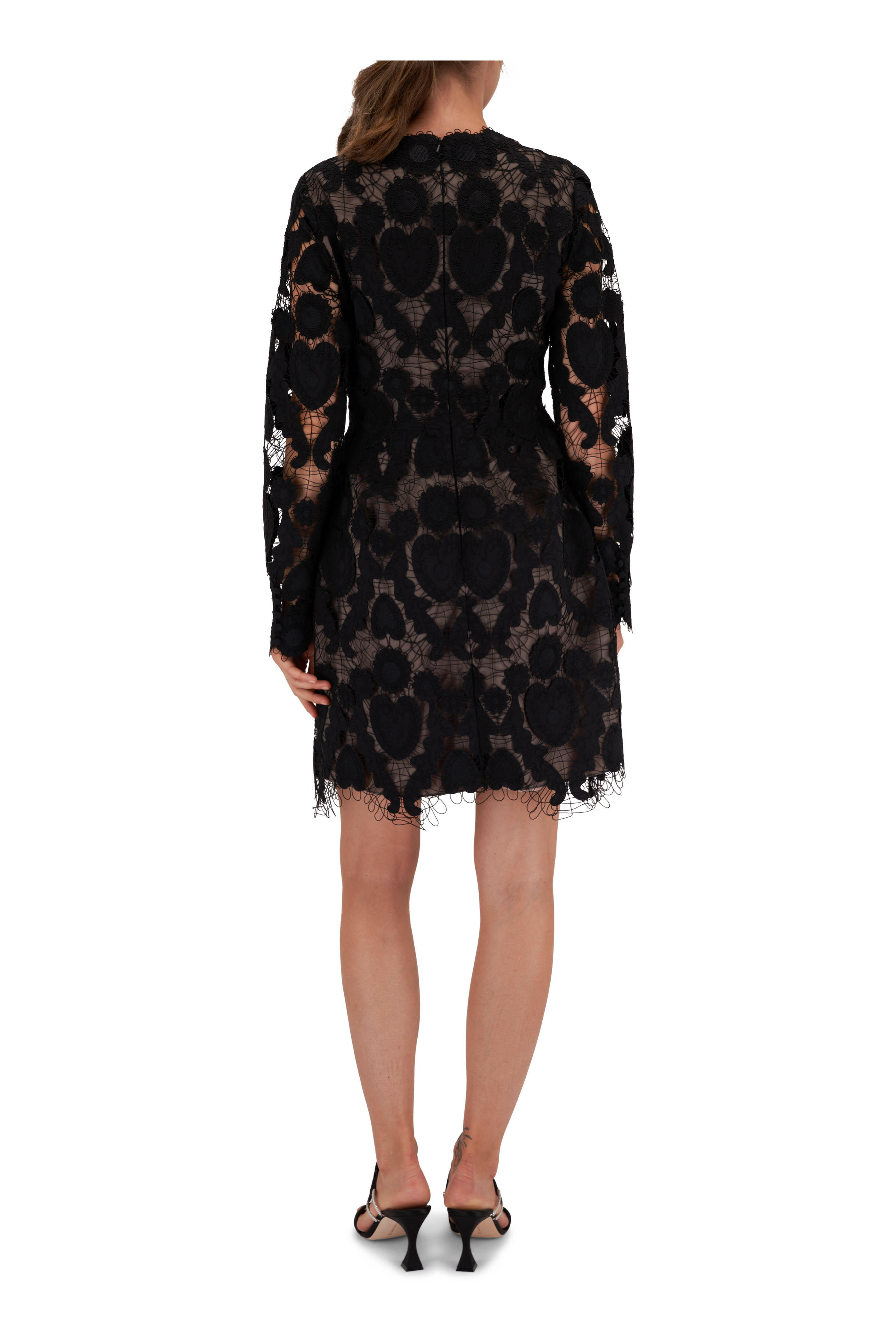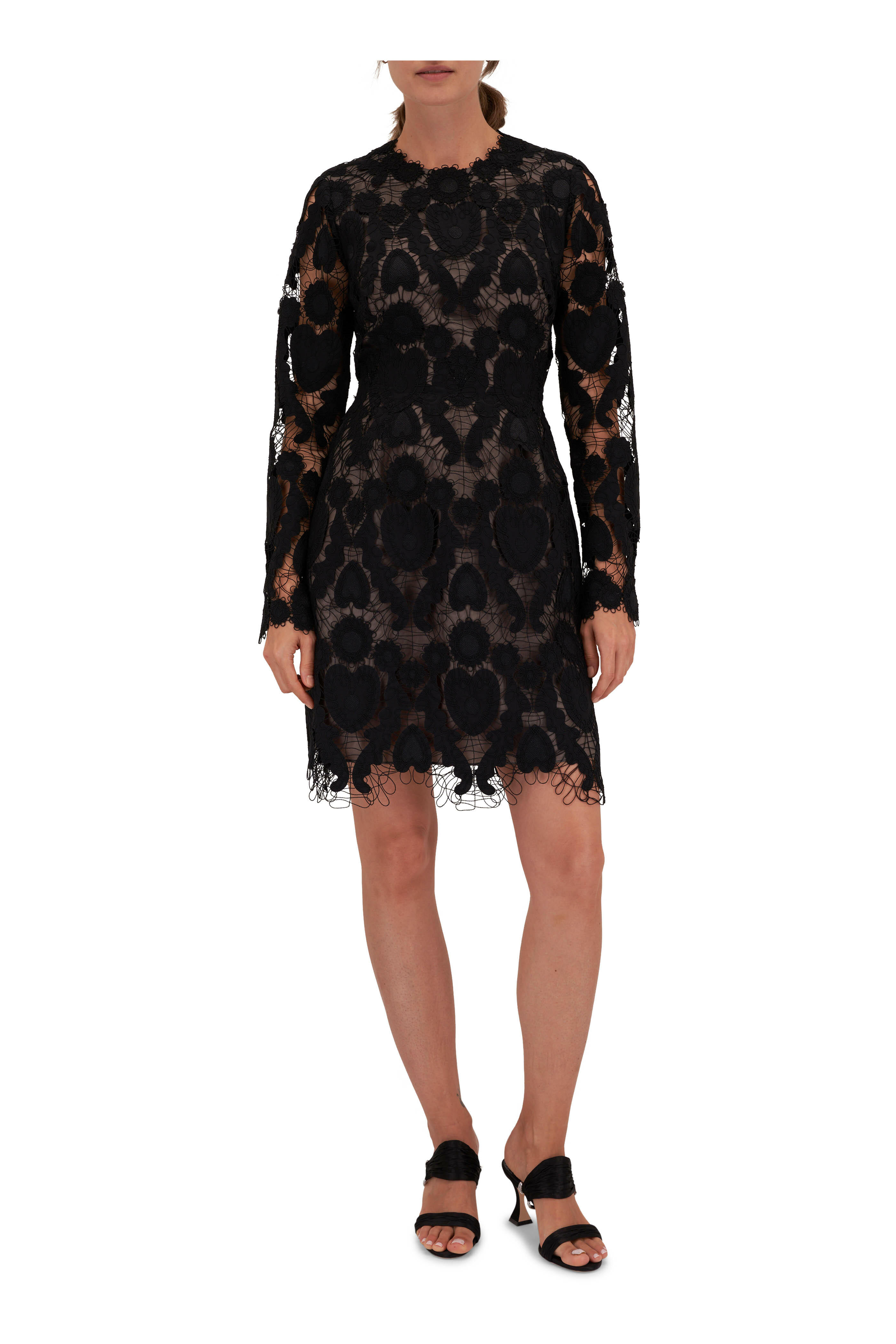 Round neckline. Concealed back zip. five button cuff. Lace trim. Made in the USA. Shoulder to hem 37'. 100% polyester. Dry clean.