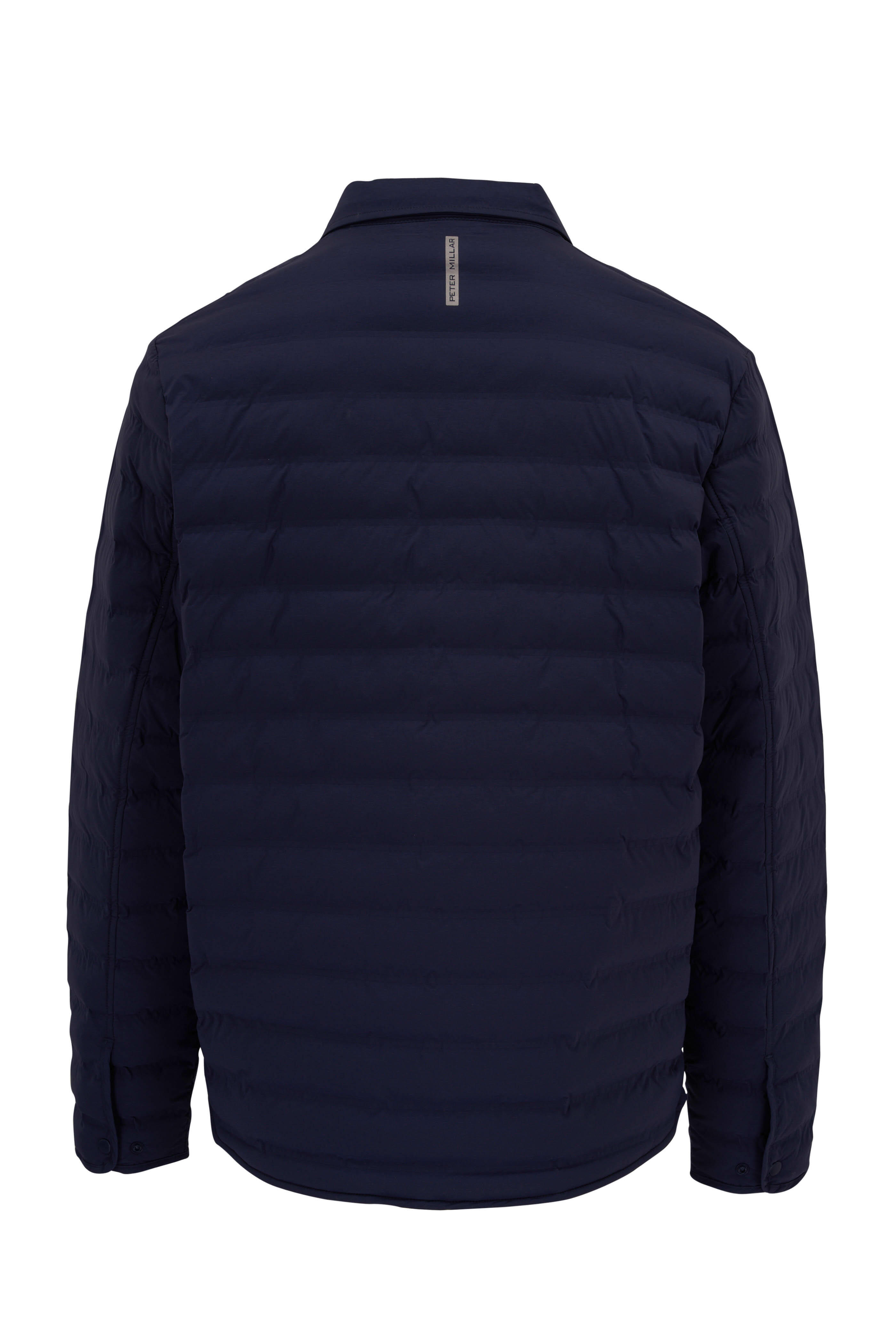 Spread collar. Snap button placket. Front left patch pocket; lower side pockets; interior pockets. Single button cuffs. Imported. 87% nylon, 13% spandex; Fill: 100% polyester. Machine wash.
