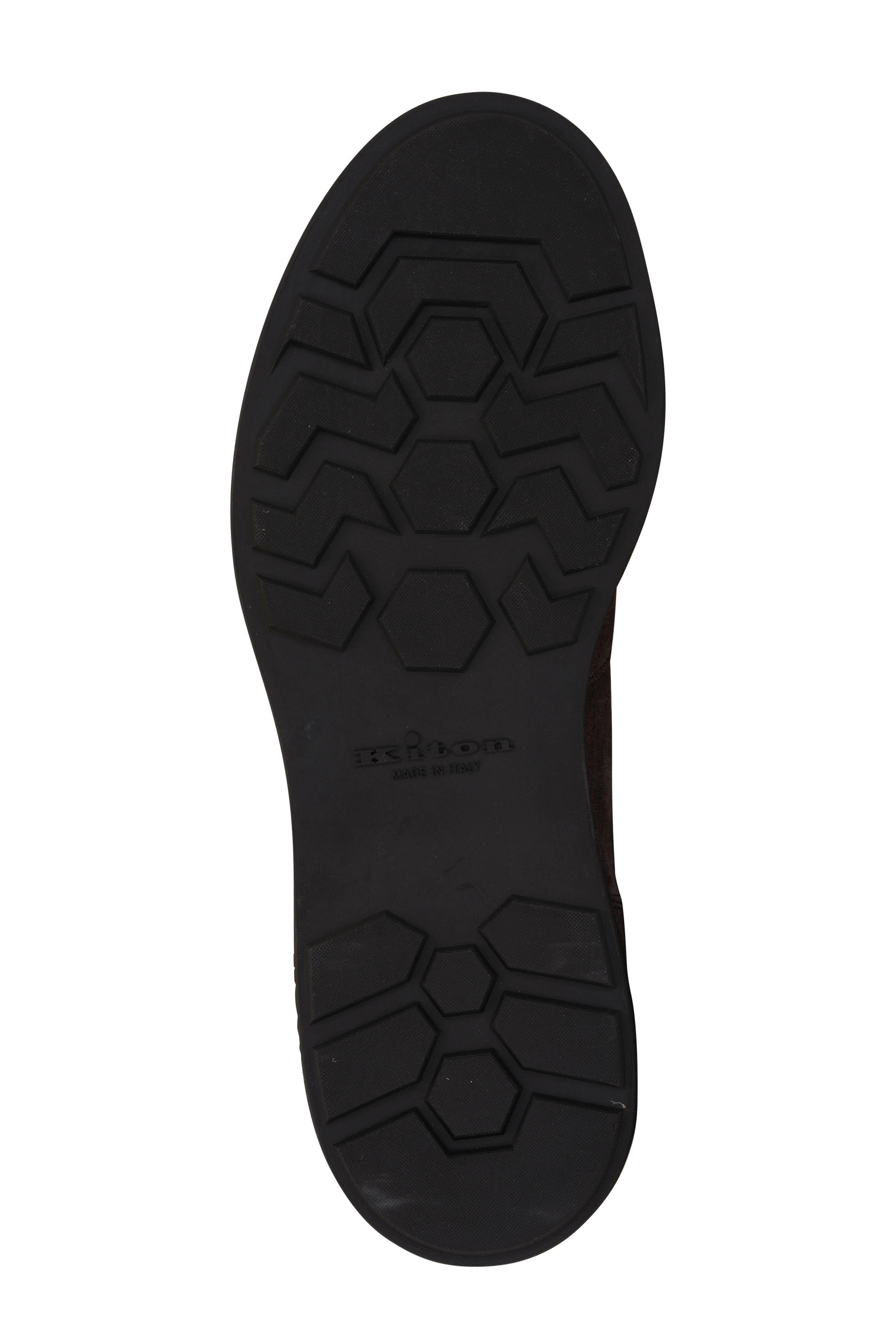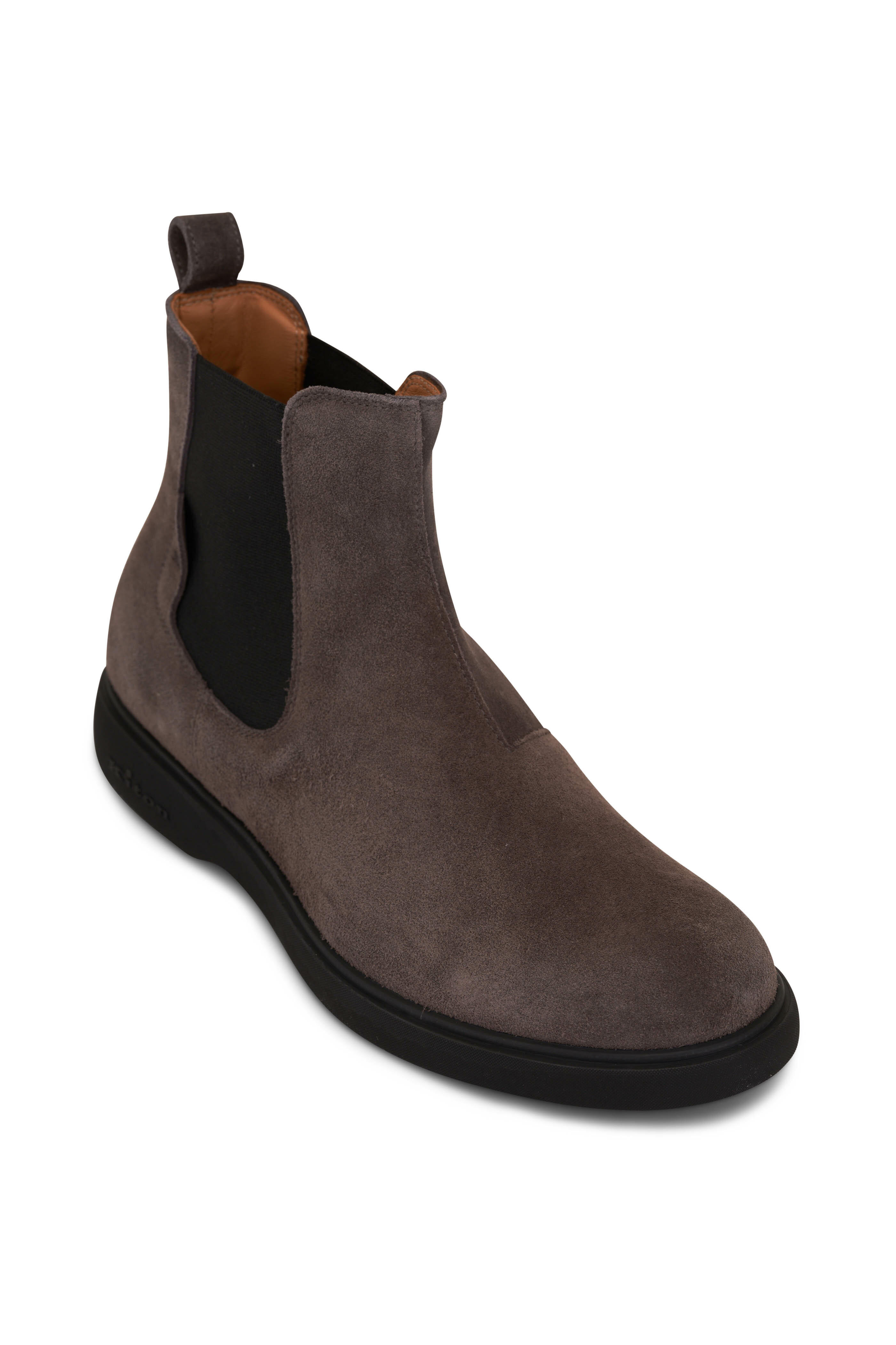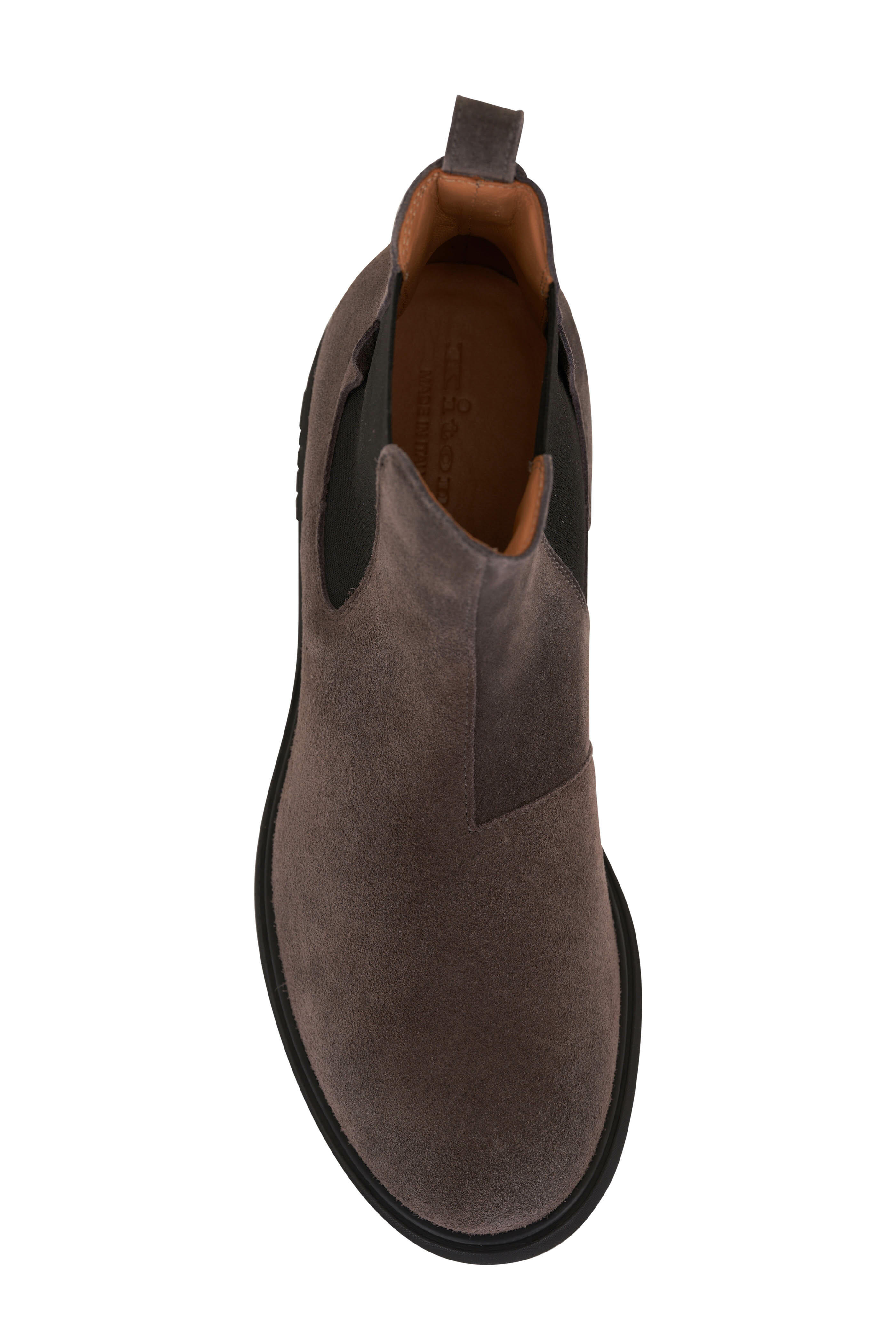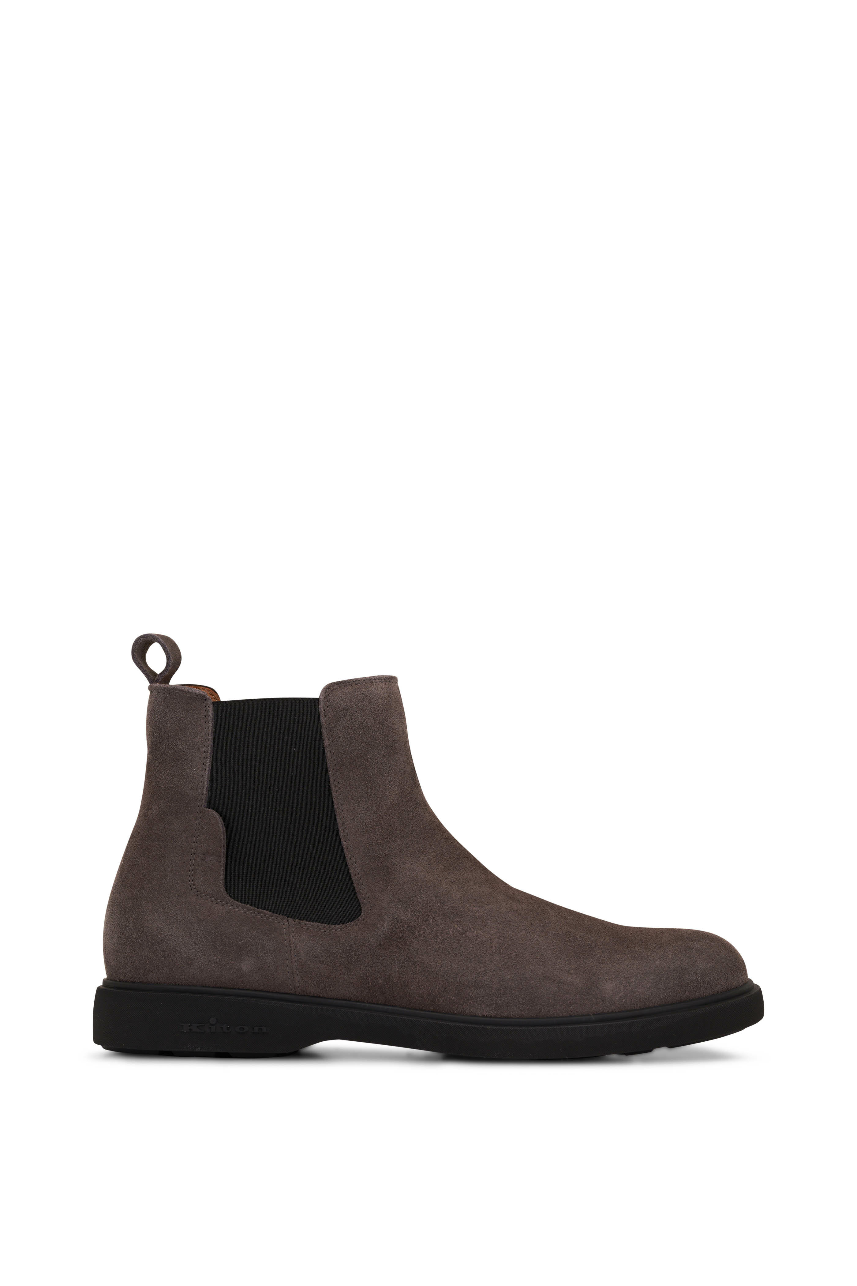 Suede upper. Round toe. Elasticized side gores. Leather lining and insole. Rubber tread sole. Back pull tab. Made in Italy.