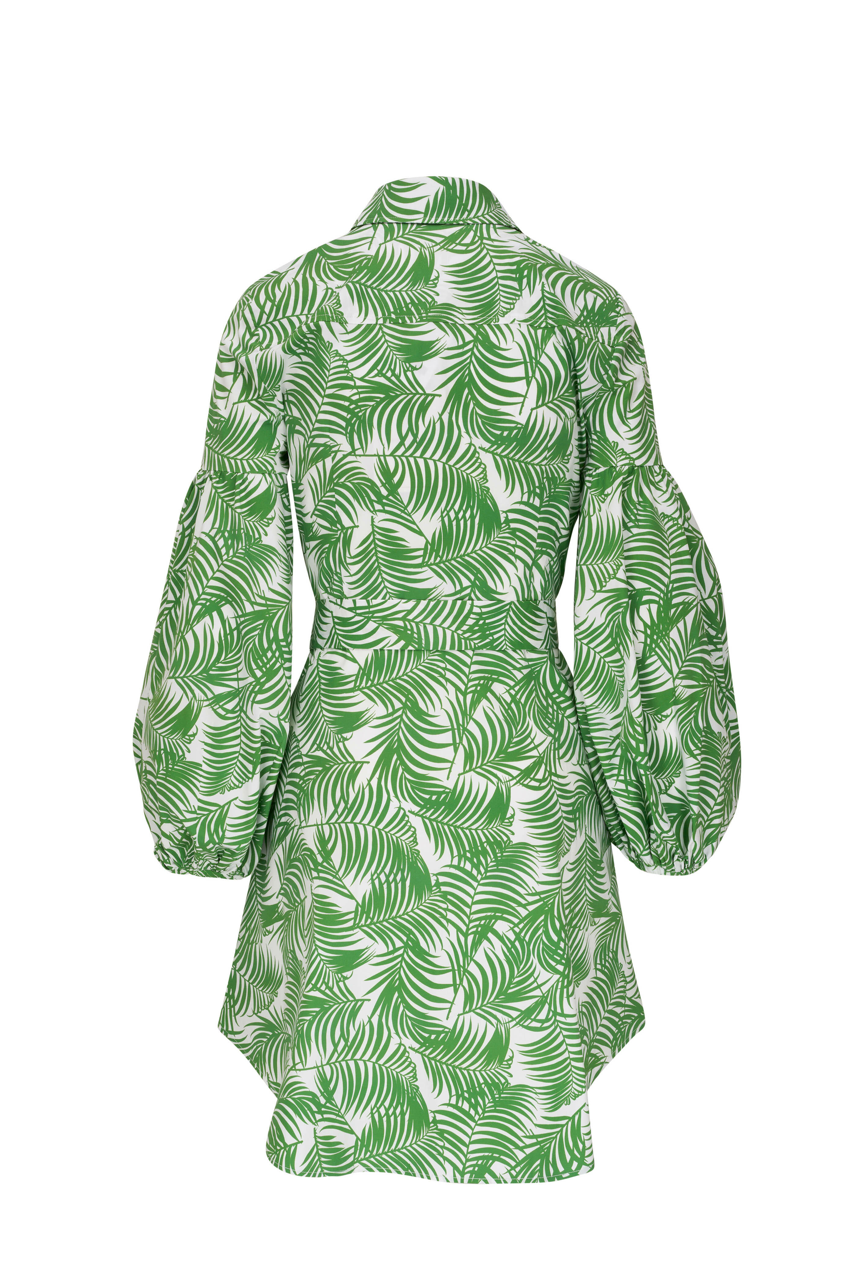 Green Palm Leaf Print Belted Mini Shirt Dress