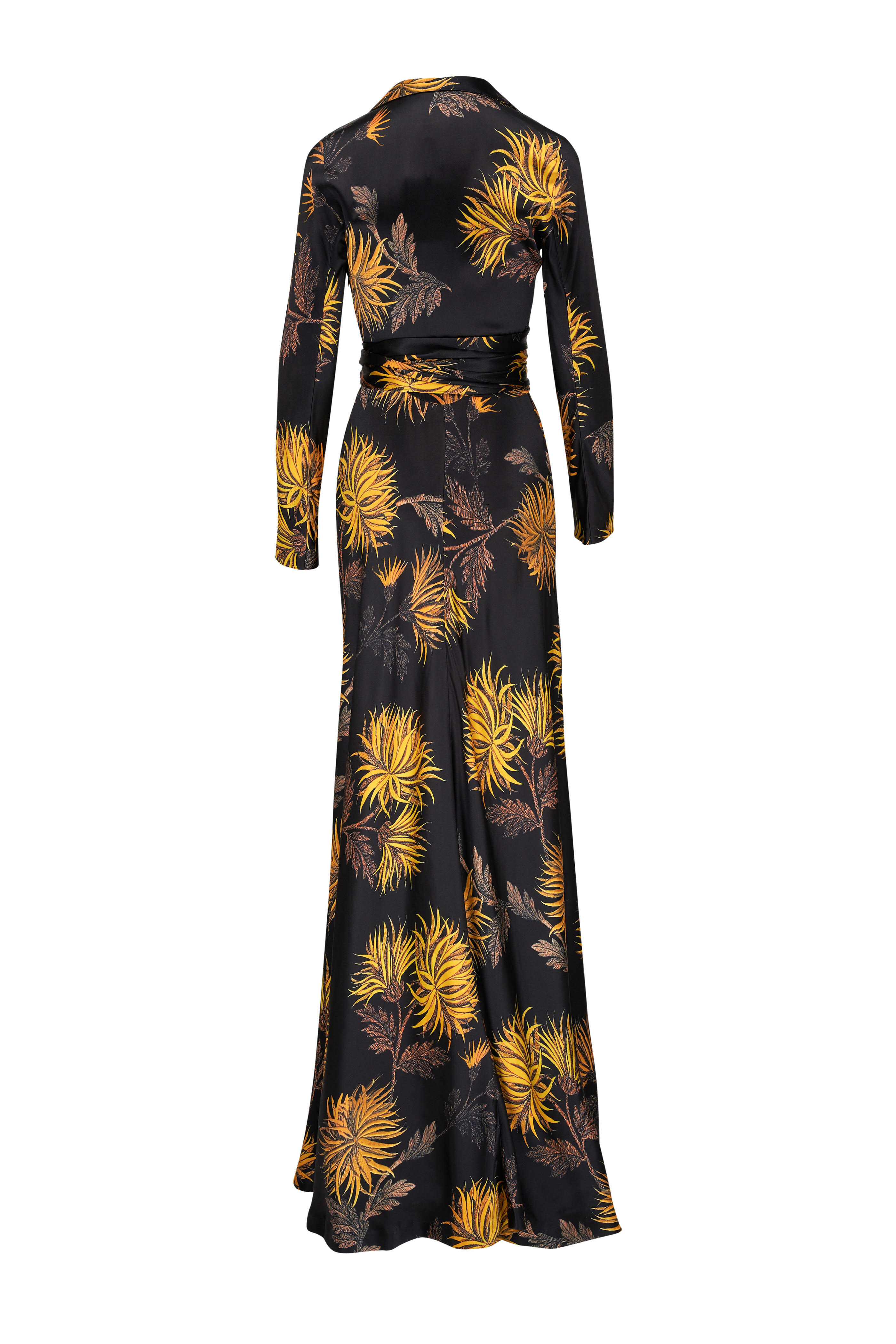 Collared v-neckline. Concealed side zip closure. Interior grosgrain waist strap. Self-tie closure. Front slit at hem. Made in Italy. Floor length. 100% viscose. Dry clean.