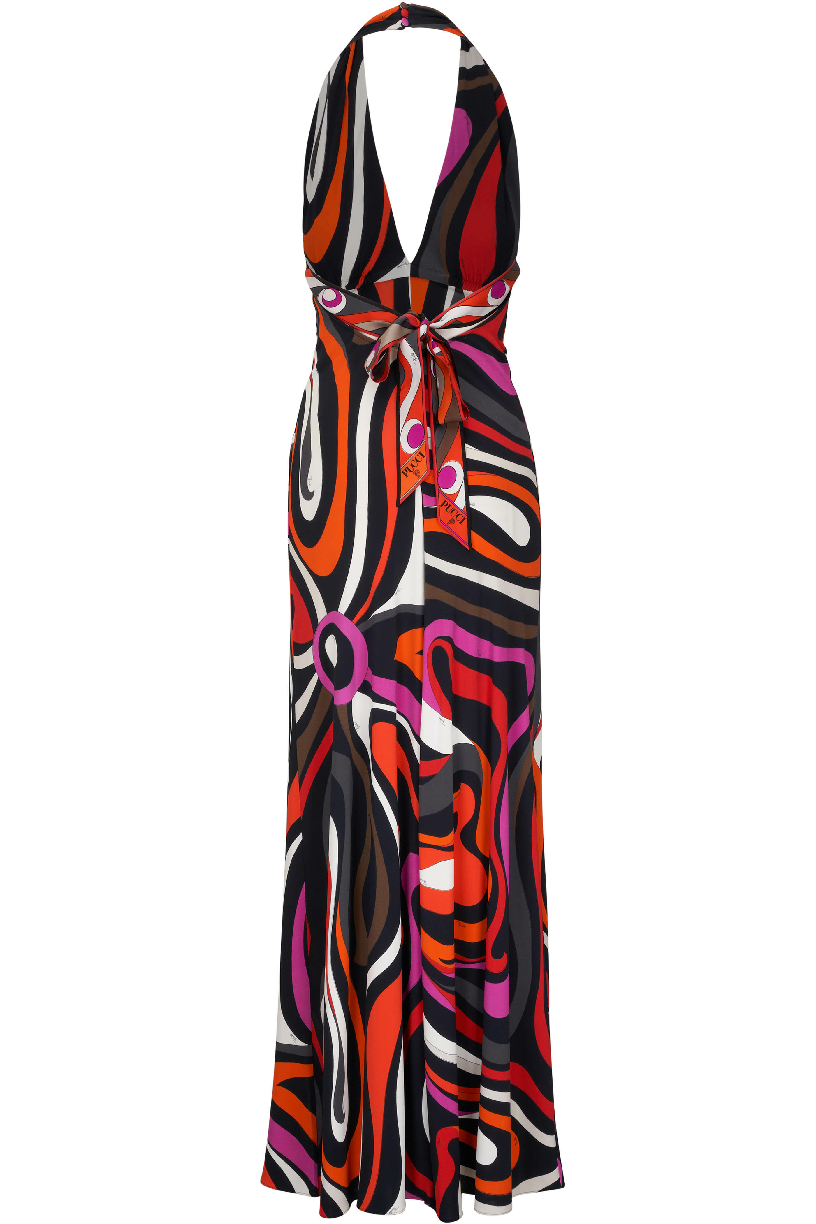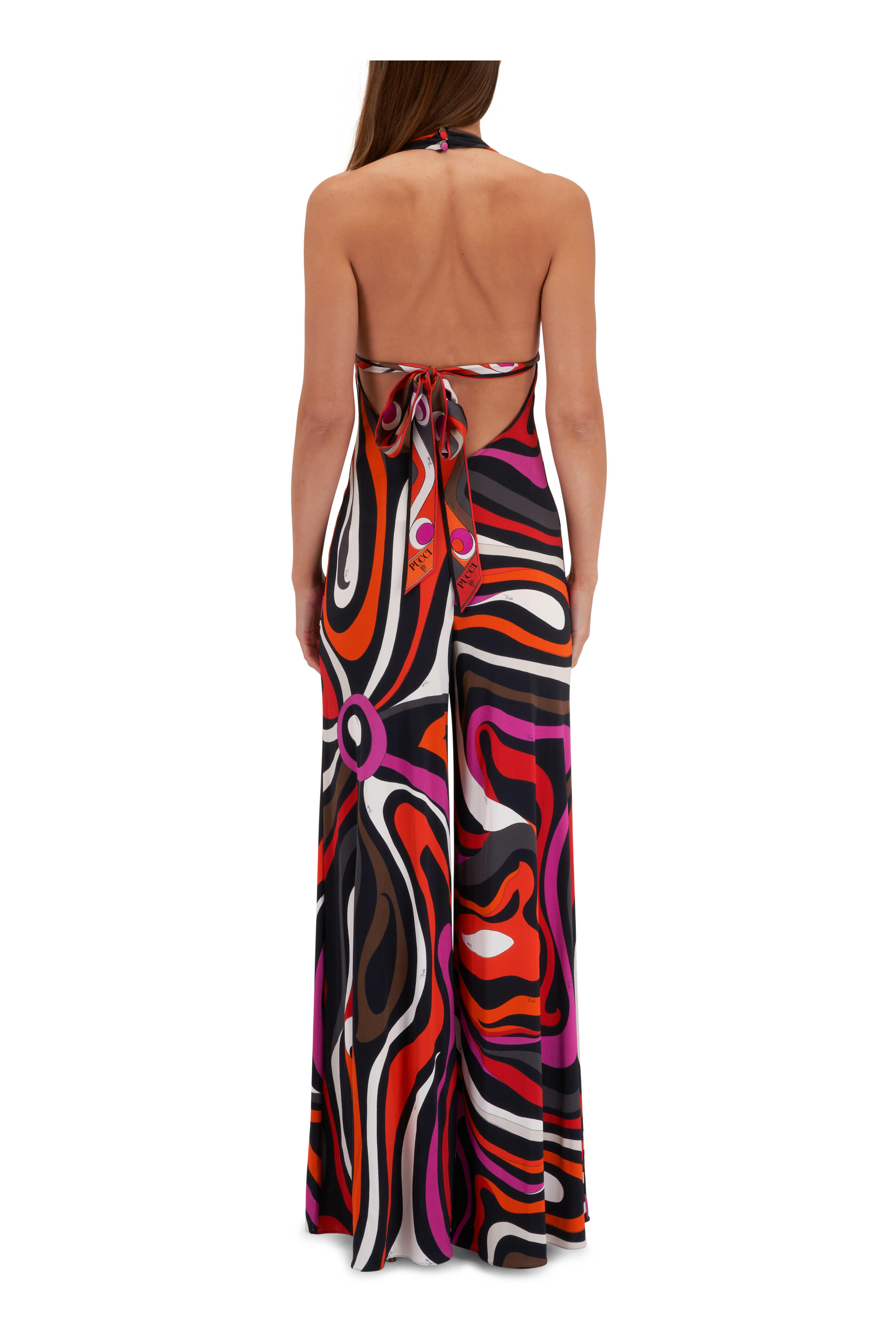 Plunging V-neck with button halter back. Concealed back zip. Open back with Goccia-print ties. Made in Italy. 35" Inseam. 62' Shoulder to hem. 100% silk. Dry clean.