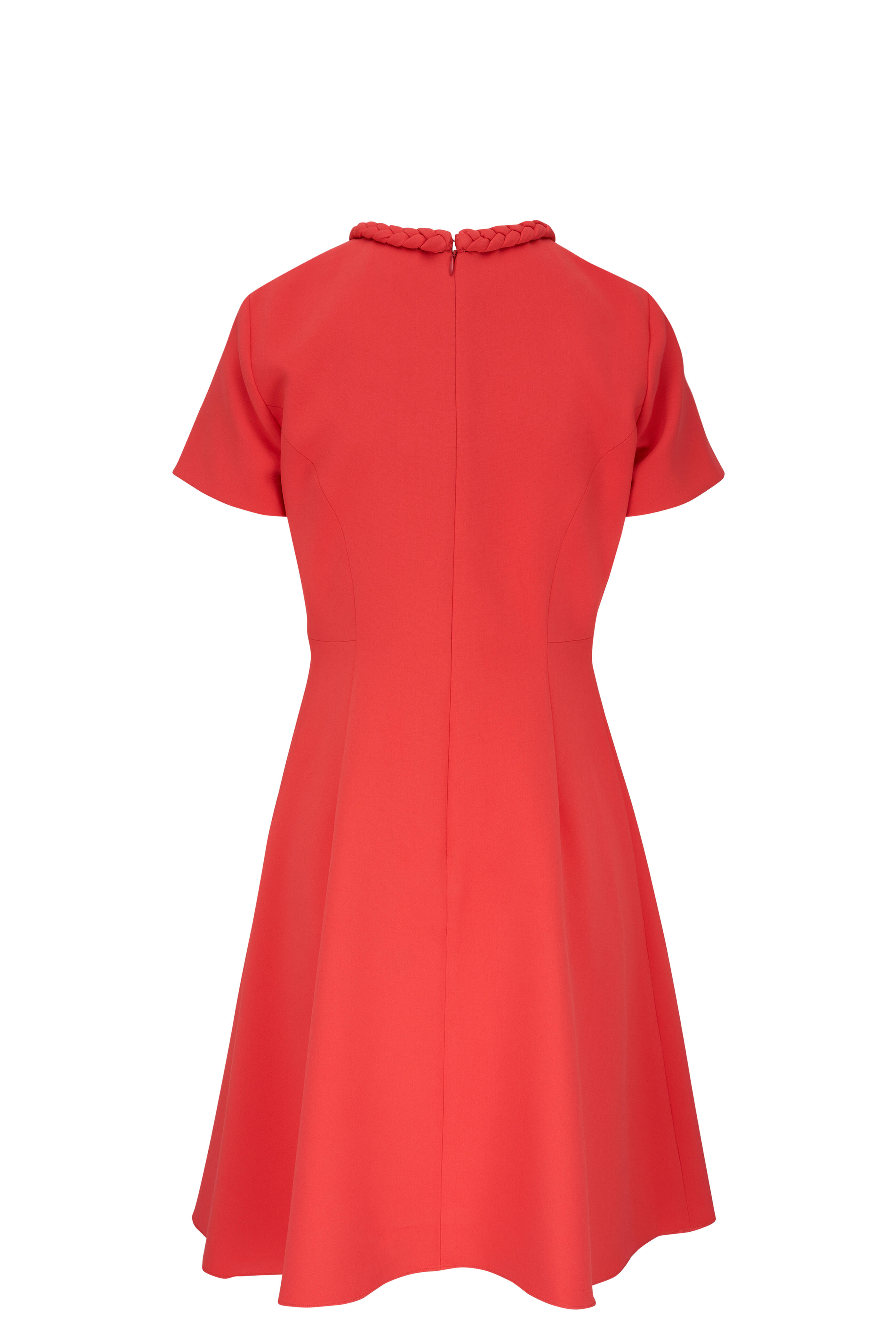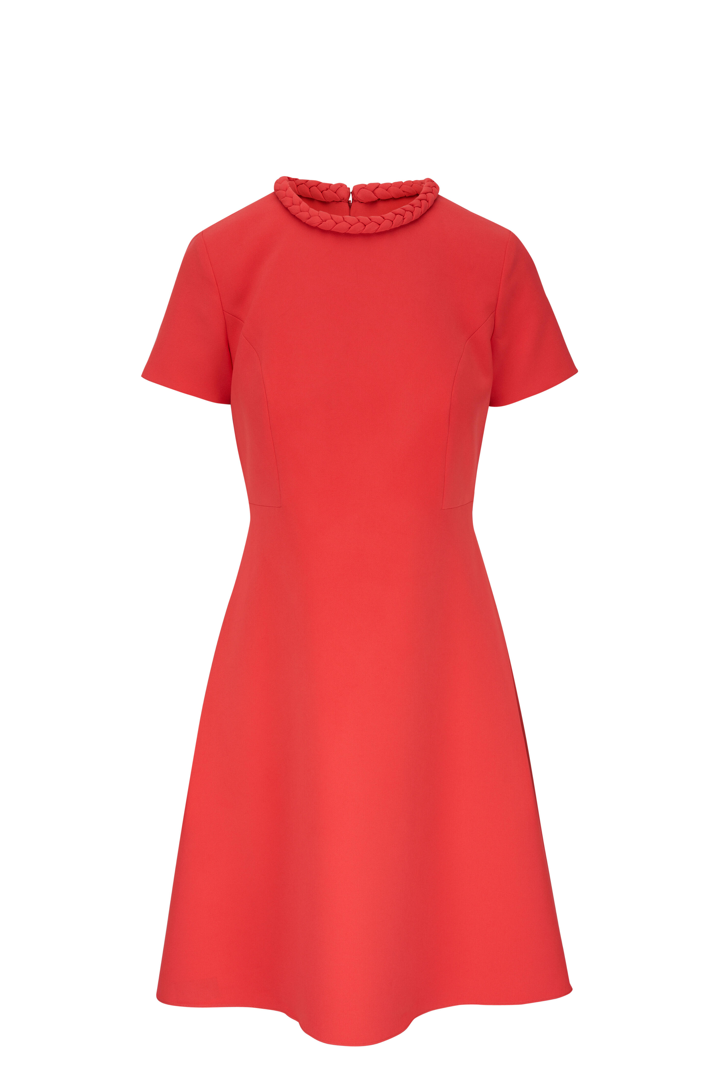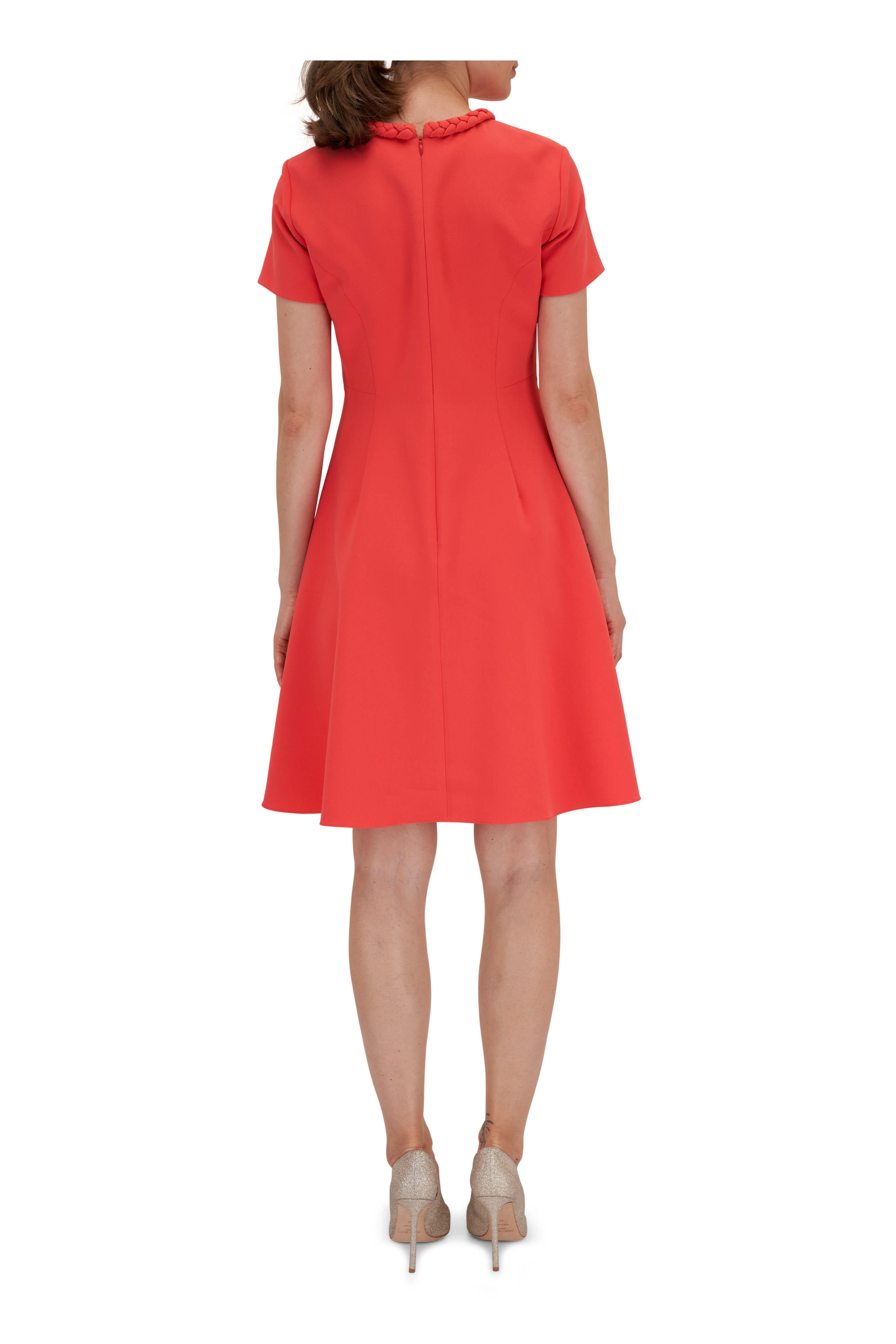 Round neckline; braided detail. Concealed back zip. Imported. 38" shoulder to hem. 92% polyester, 8% spandex. Dry clean.