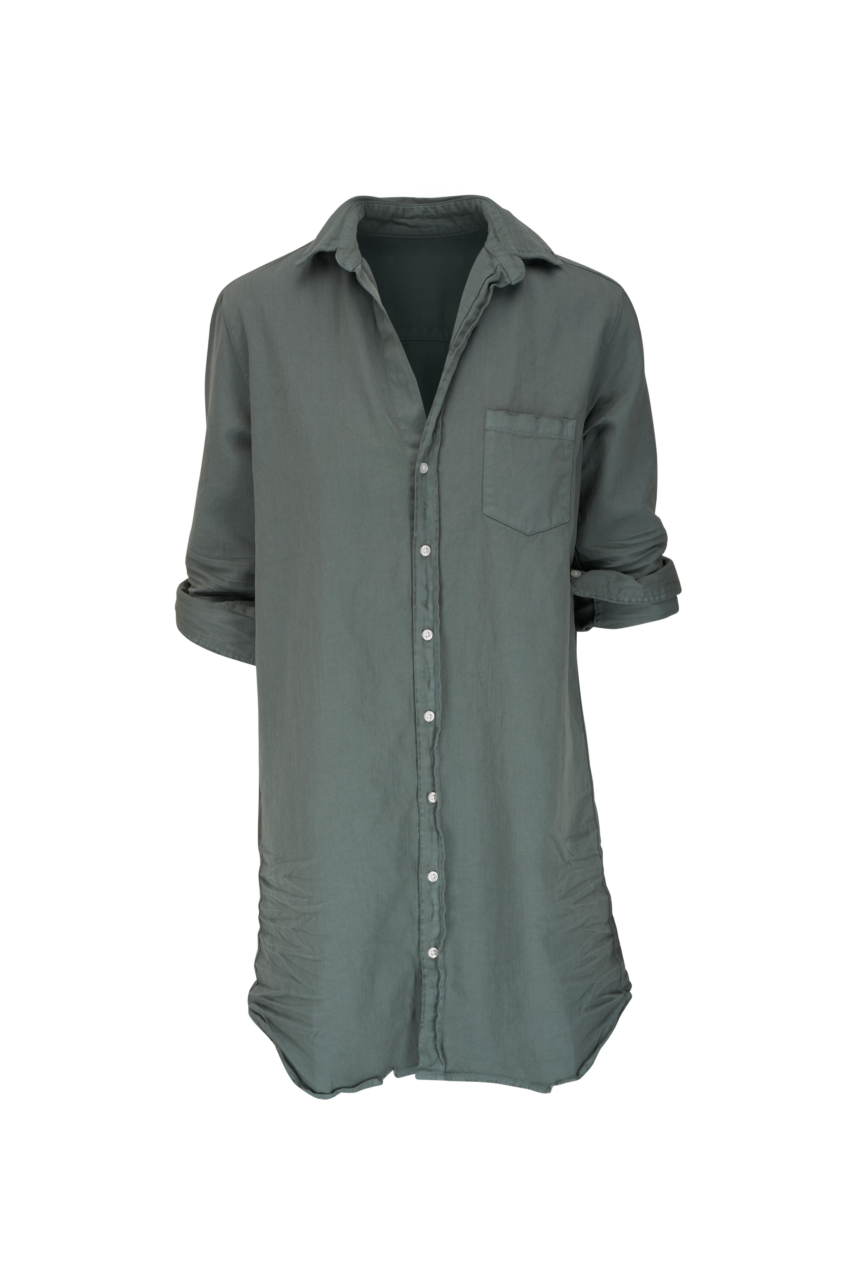 Spread collar. Front button placket. Three-quarter sleeves. Single button barrel cuffs. Distressed shirttail hem. Made in the USA. 32" shoulder to hem. 100% cotton. Machine wash.