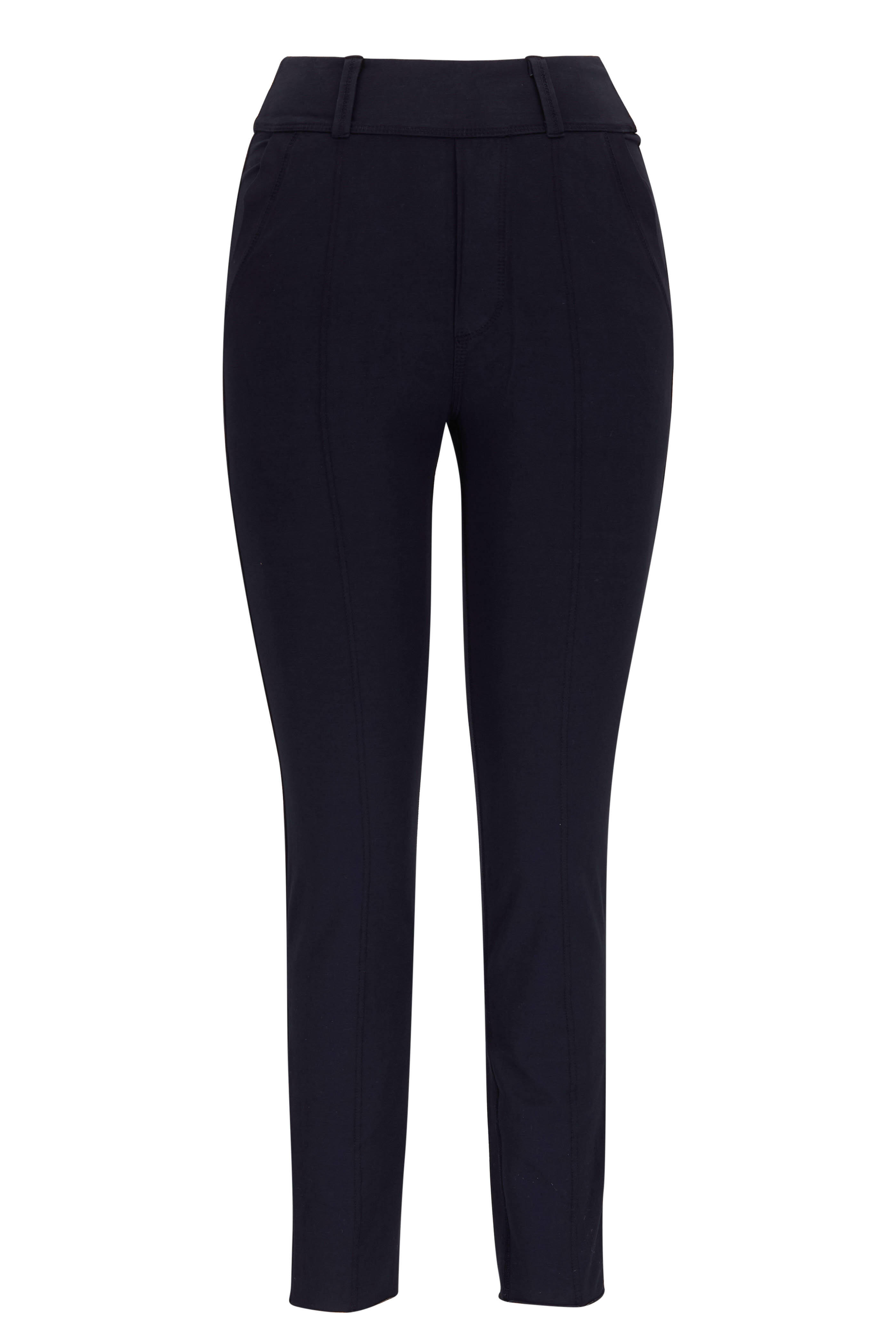 - Structured-look, stretchy-feel pant with a cropped, unfinished hem and mid-rise waist