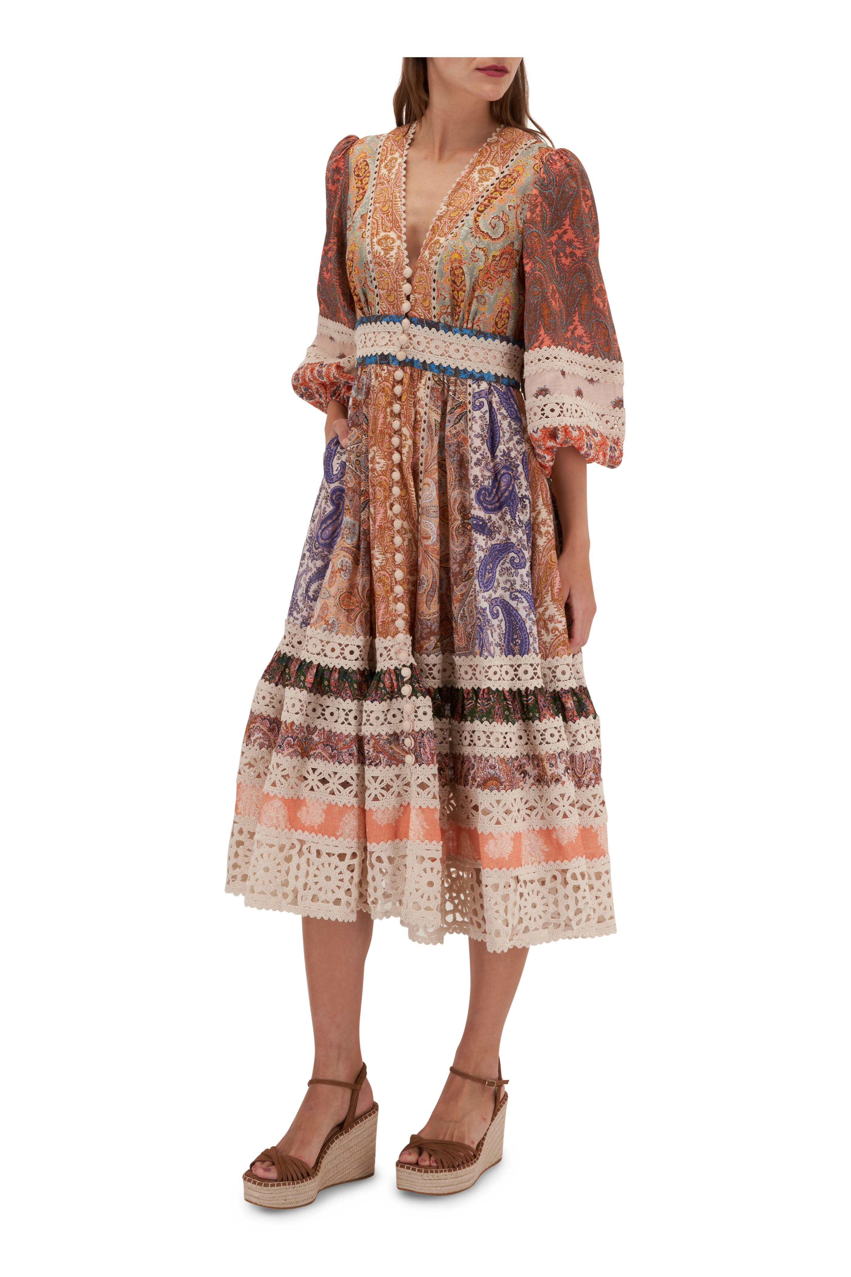 Plunging v-neckline. Five functional fabric-covered top buttons; full placket. Concealed back zip closure. Fitted bodice. Banded waist. Bracelet length blouson sleeves; elasticized cuffs. Relaxed skirt; gathered drop hem. Cutaway crochet trim. Imported. 48" shoulder to hem. A-line silhouette. 100% linen. Dry clean.