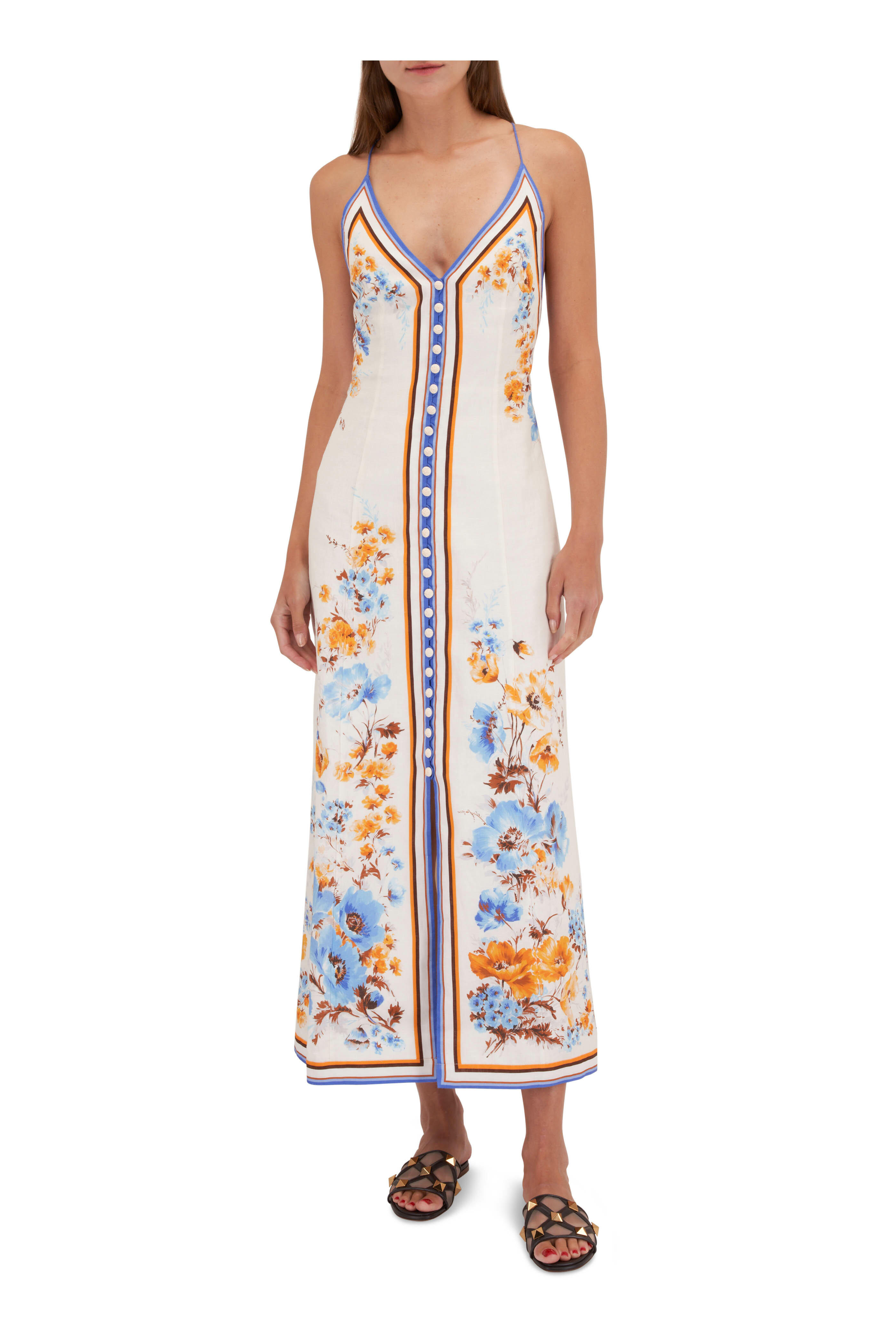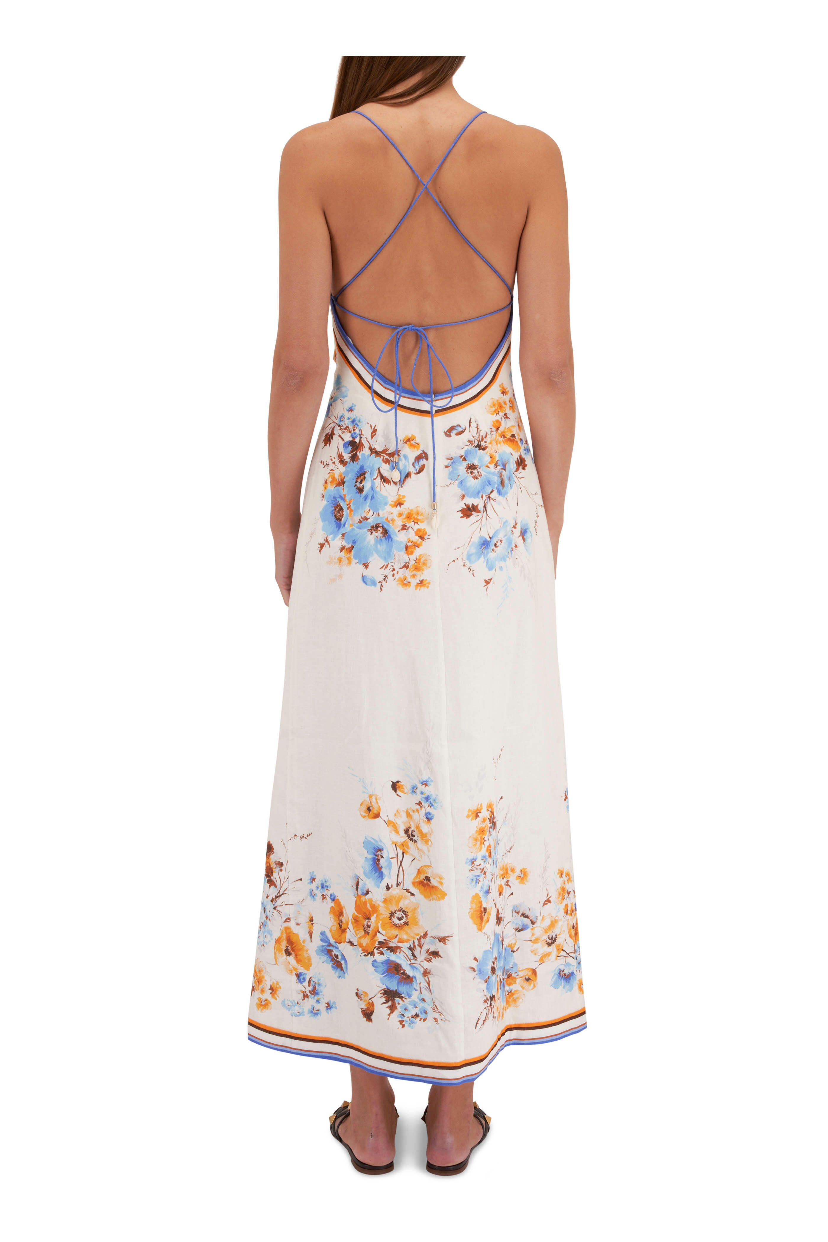 Plunging v-neckline; low scoop back. Concealed back zip; self-tie cross back straps. Full front button placket. Fine rouleau shoulder straps. Contrasting trims. Imported. A-line silhouette. 55" shoulder to hem. 100% linen; lining: 100% cotton. Dry clean.