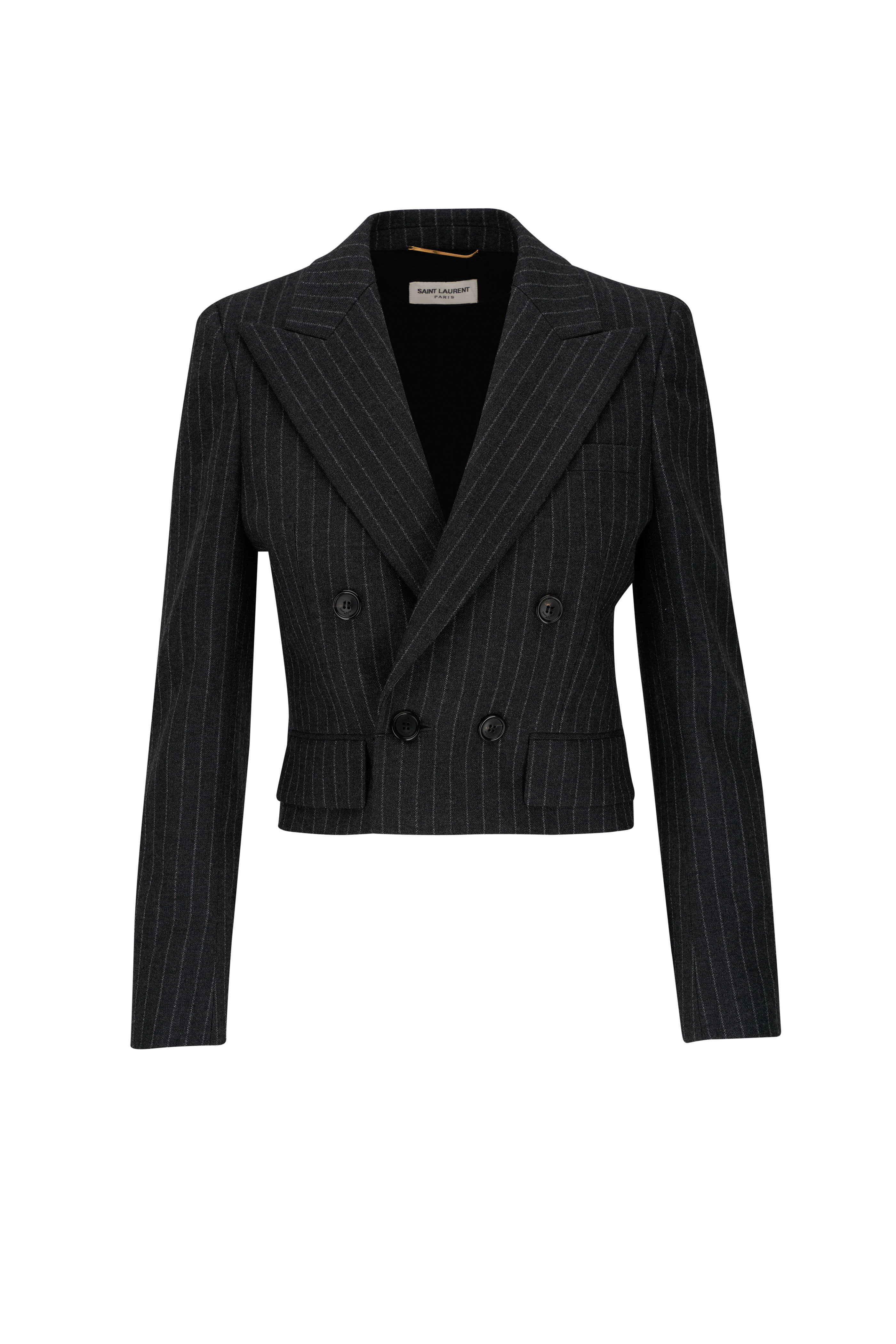 Peak lapels. Double-breasted button closure. Lower flap pockets; chest welt pocket. Cropped. Made in Italy. 100% wool; lining: 90% silk, 10% elastane. Dry clean.