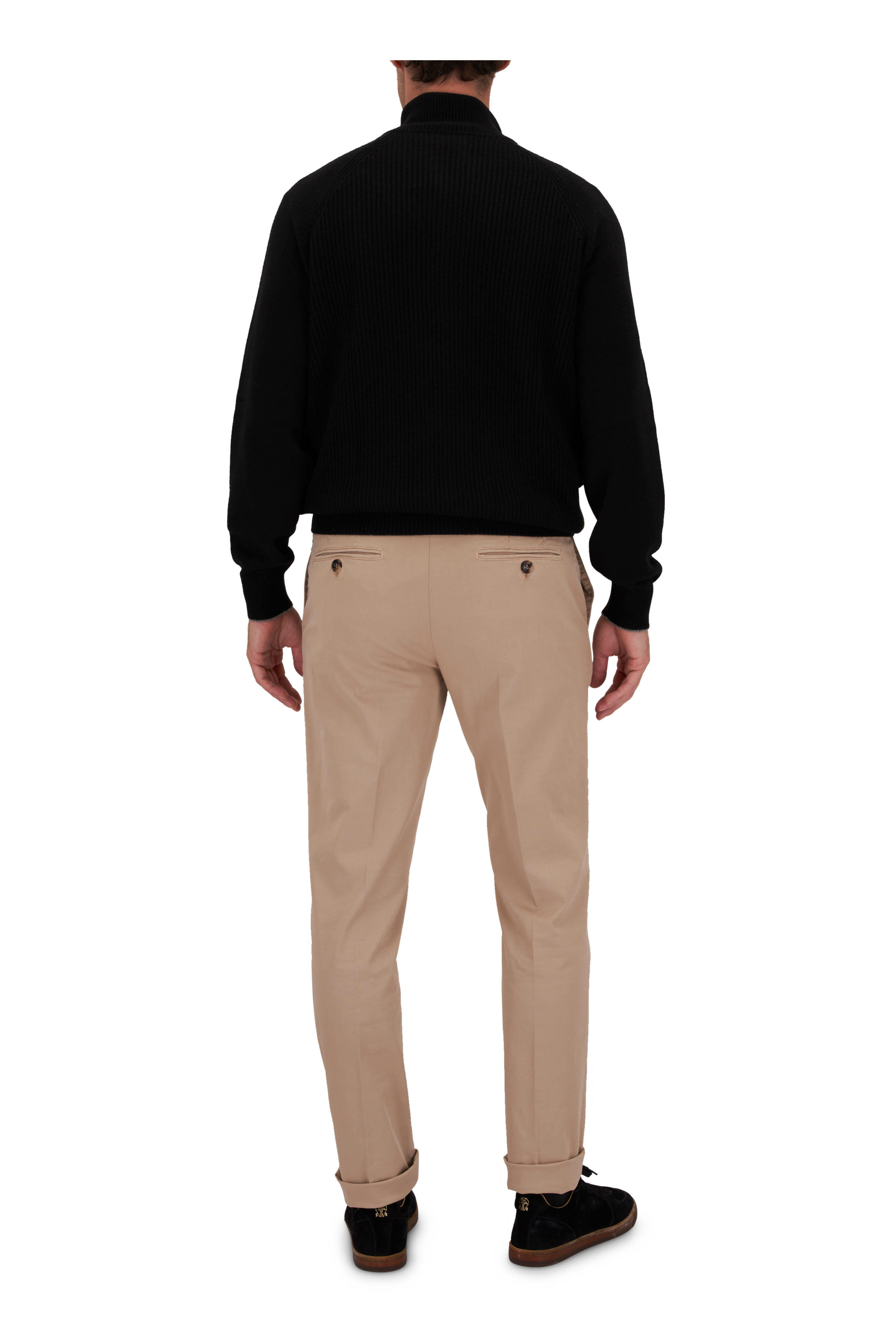 Stand collar. Two-way front zip. Gray contrast tipped cuffs. Ribbed trims. Made in Italy. 100% cashmere. Hand wash.