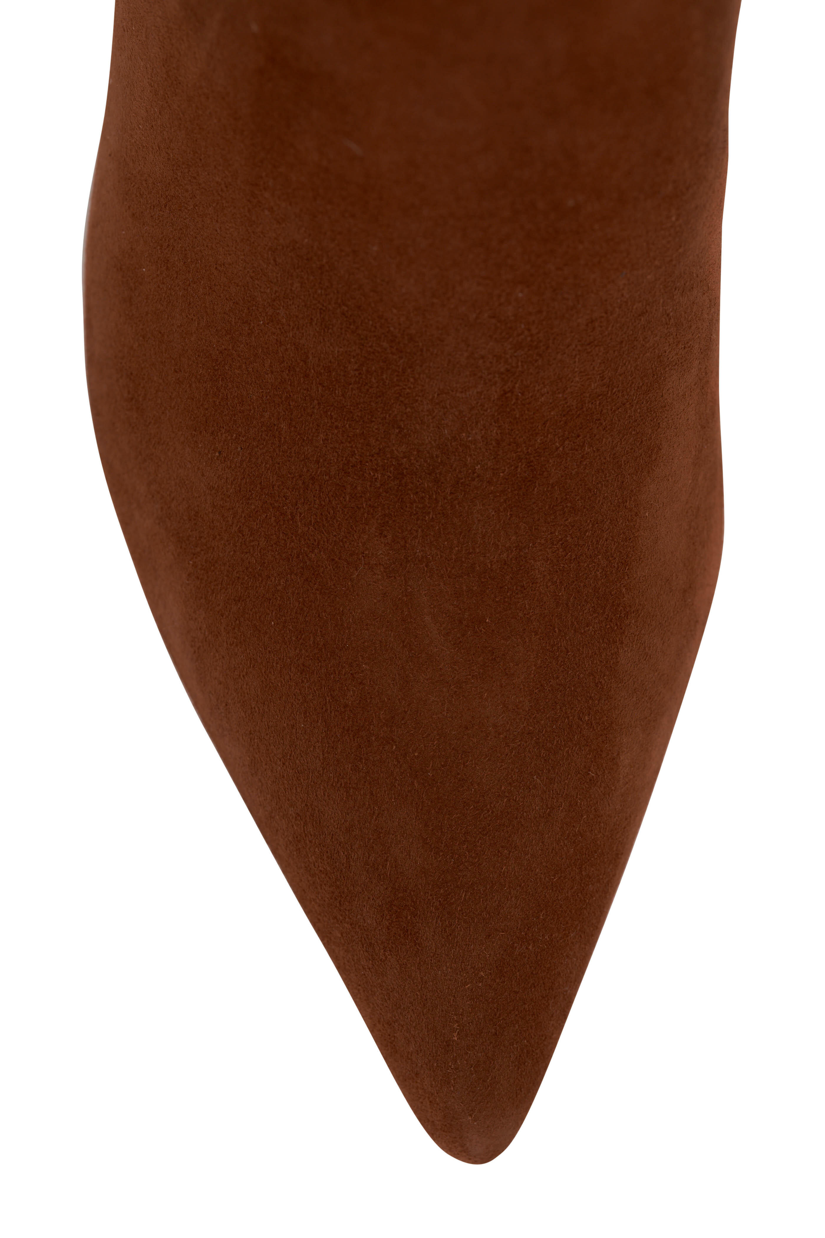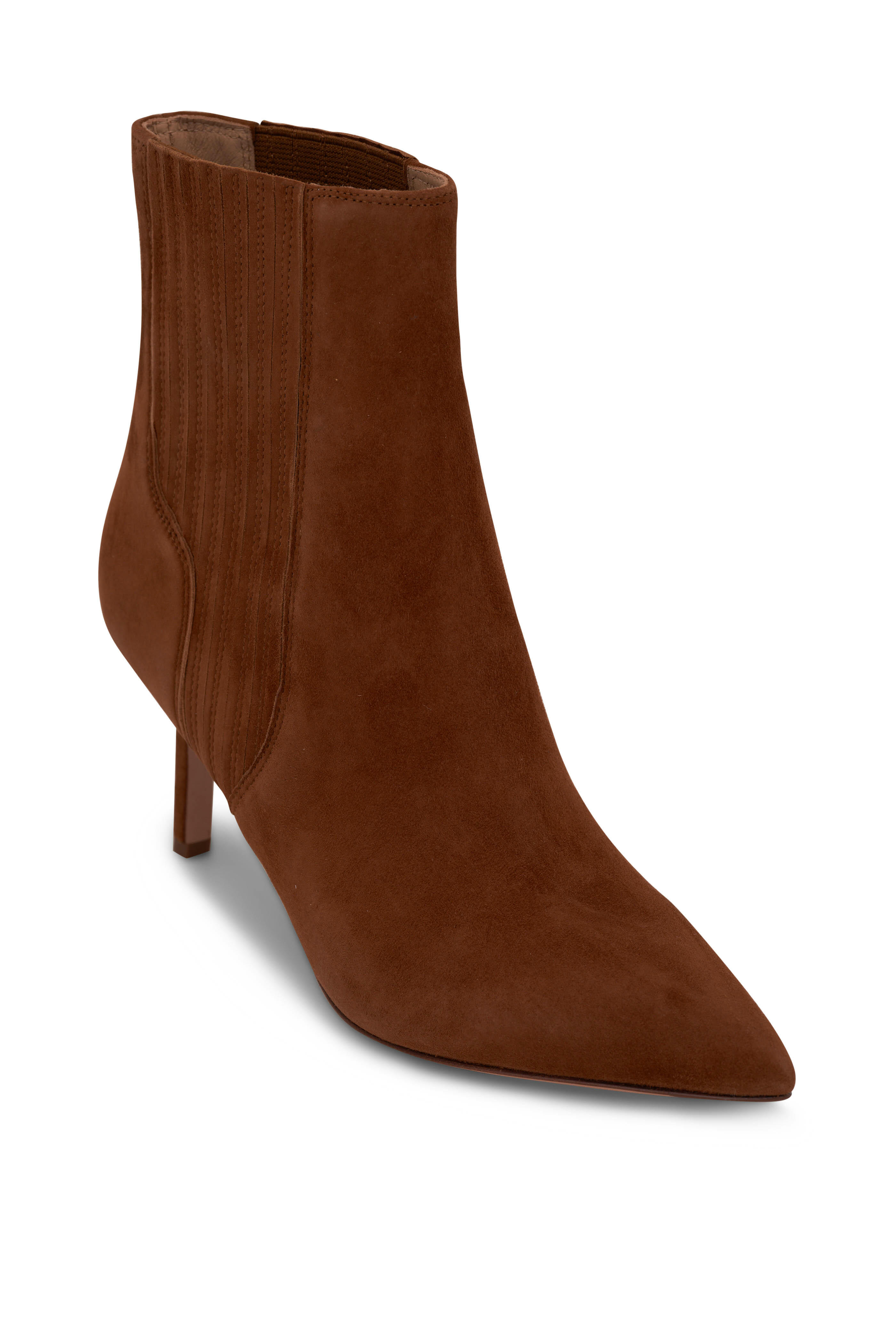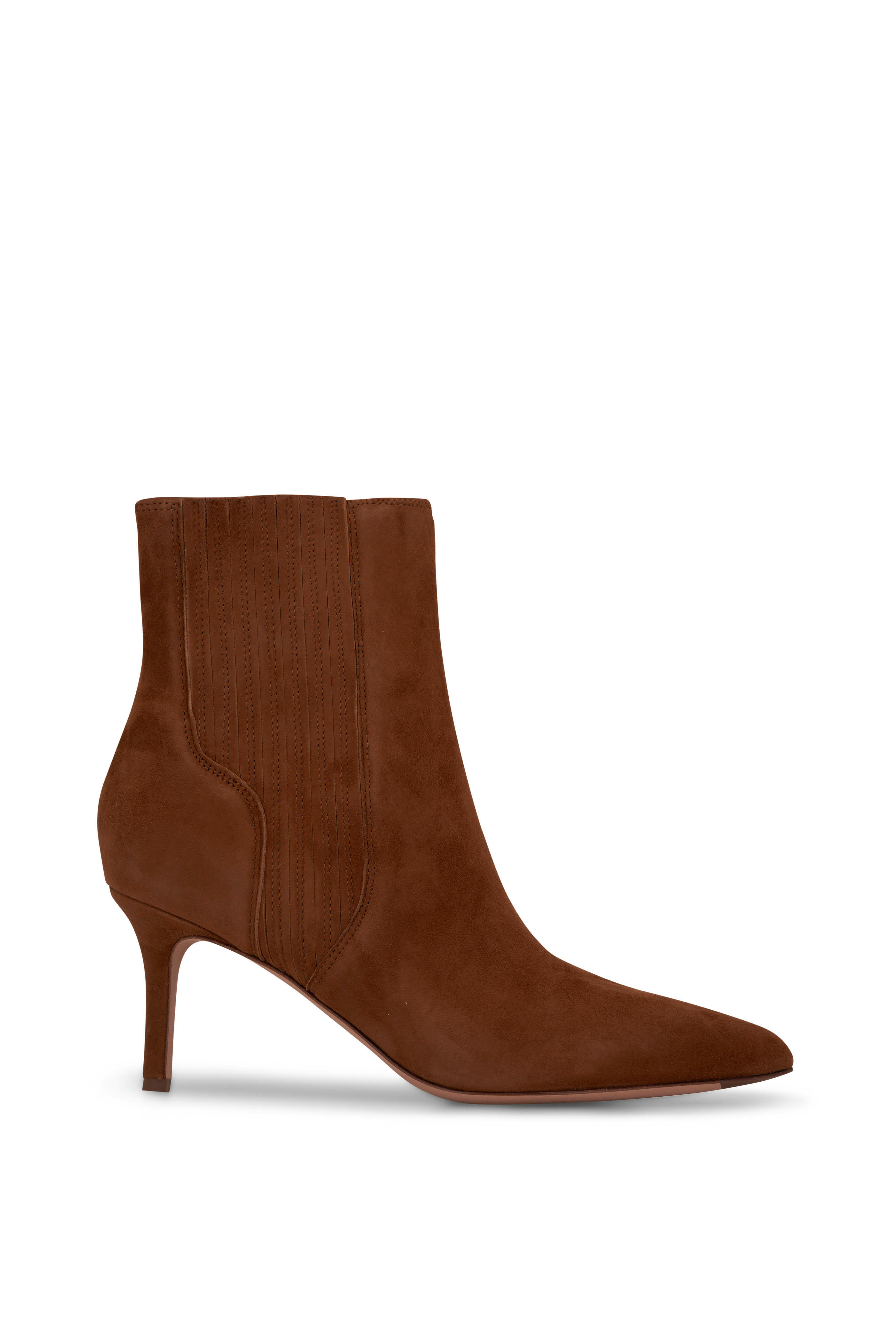 Suede upper. Pointed toe. Pull on style. Elastic goring at sides. Fabric and leather lining and insole. Self-covered stiletto heel. Leather sole. Imported. Heel height: 70mm (2 ¾"). Fit is true to size.