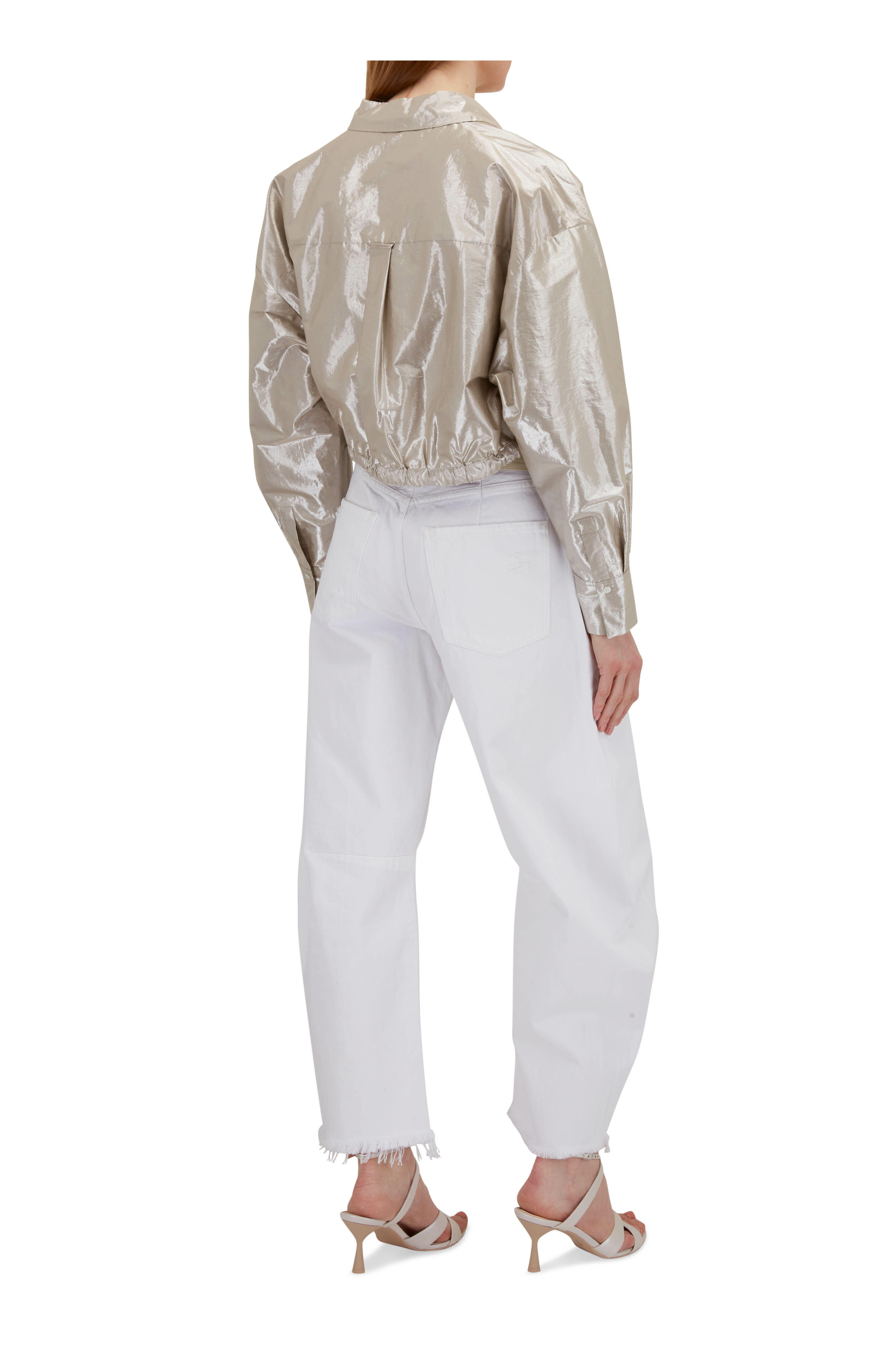 Button fly. Five pocket styling. Raw, frayed hem; distressed detailing throughout. Made in the USA. Rise: 13 1/4". Inseam: 27". Leg Opening: 20". 100% cotton. Machine wash.