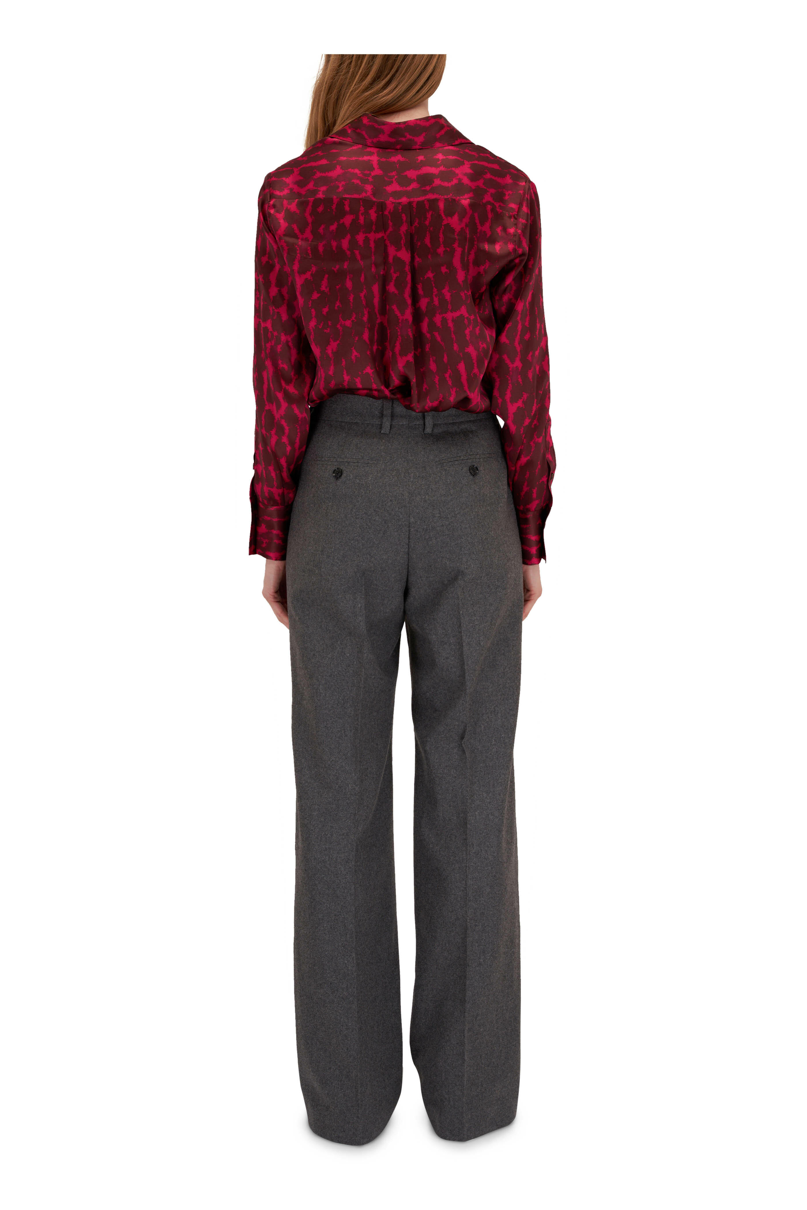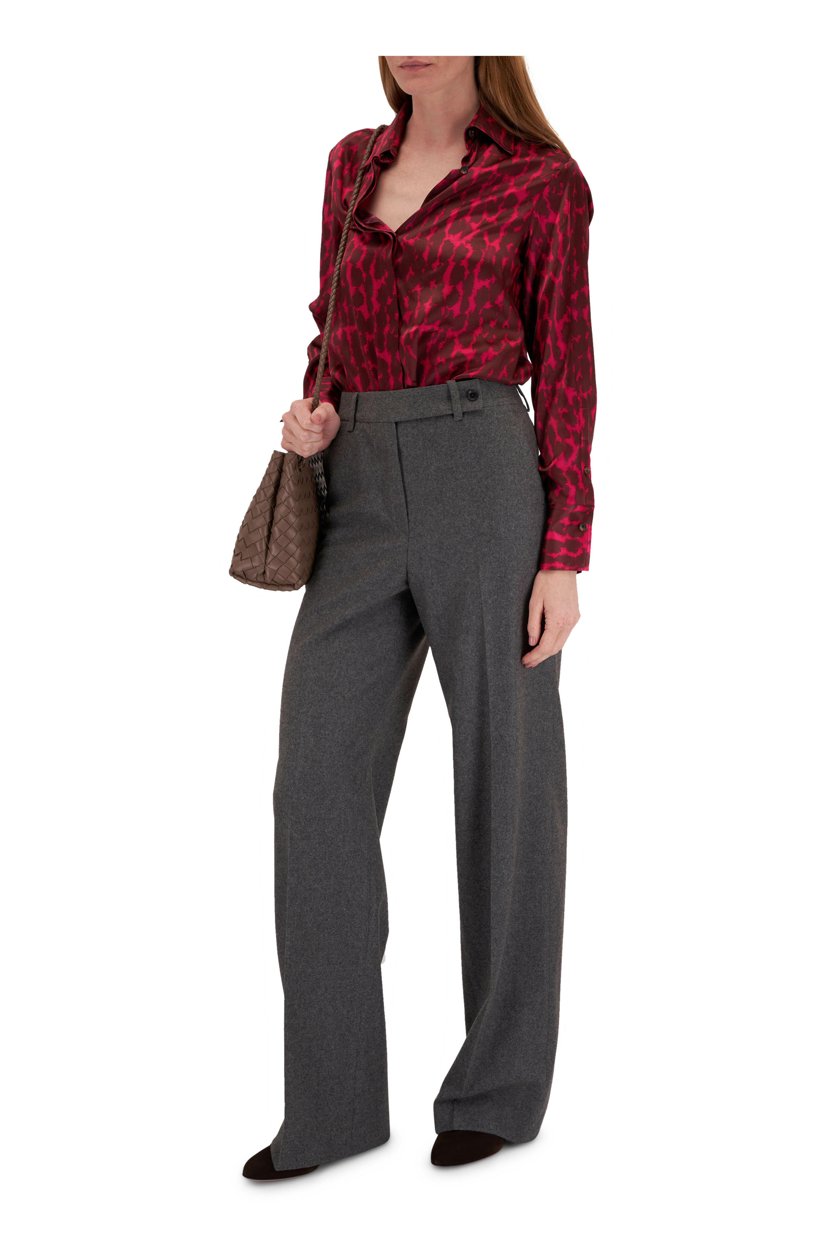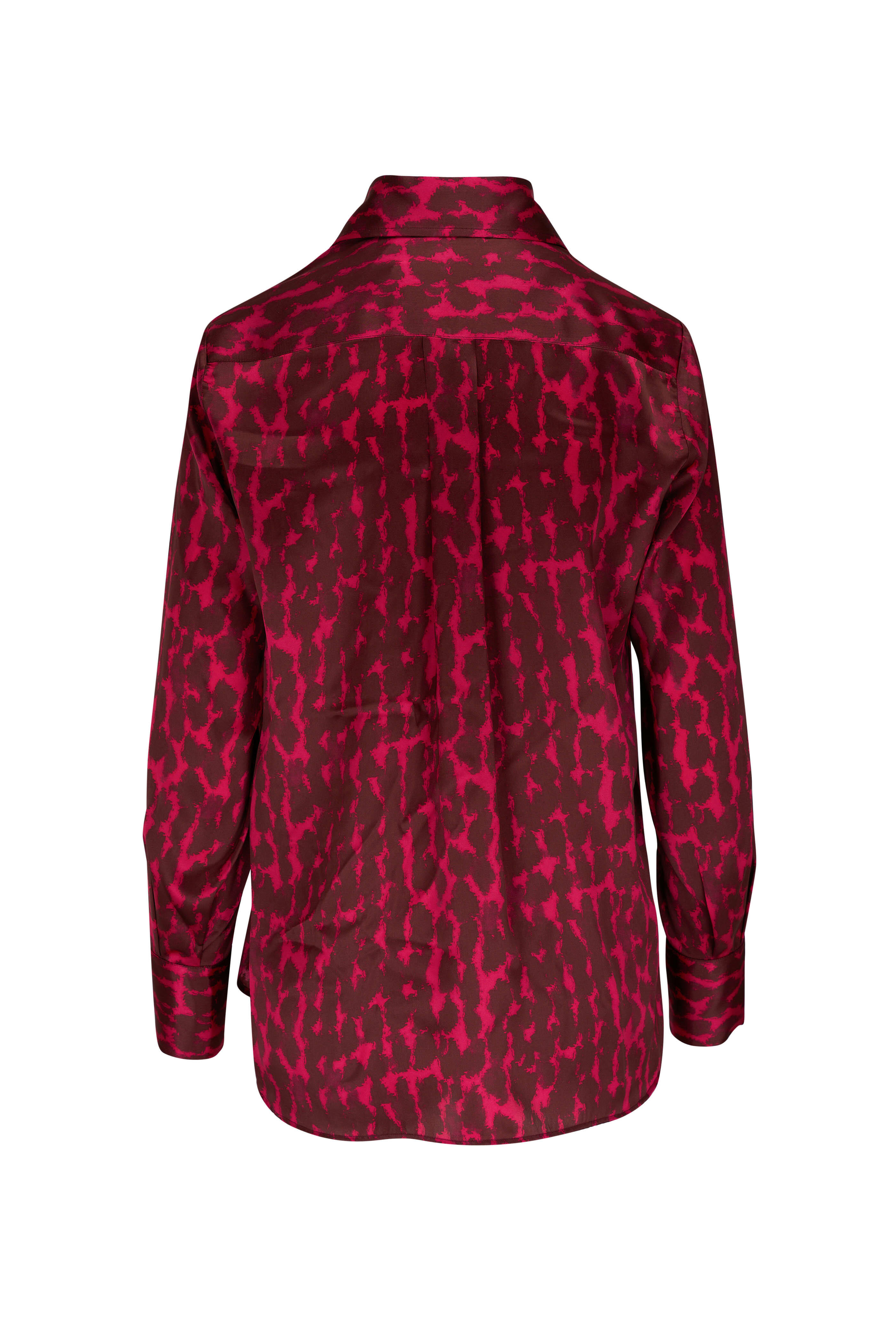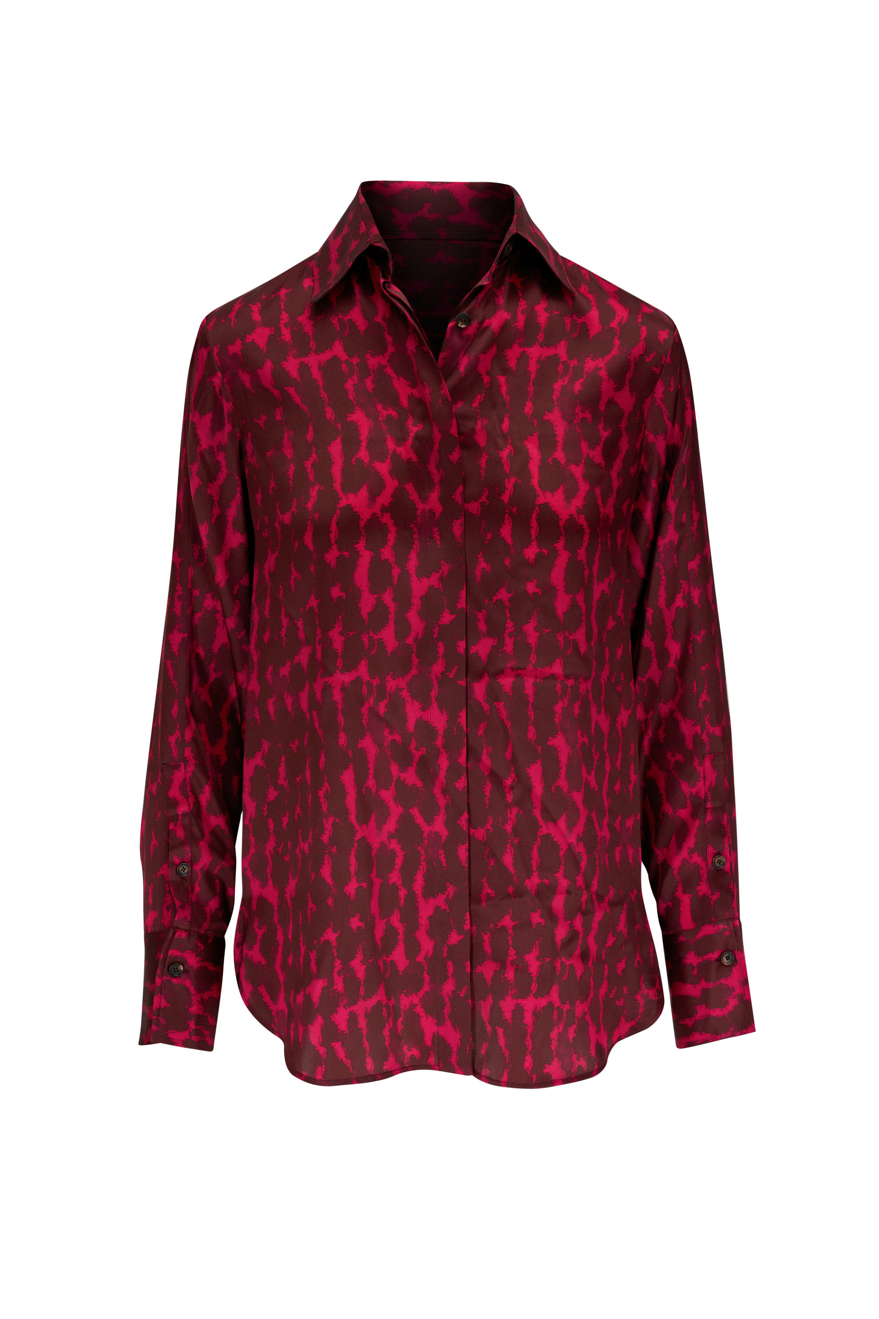 Spread collar. Concealed front button placket. Single button squared cuffs. Rounded, vented hem. Made in Italy. 100% silk. Dry clean.