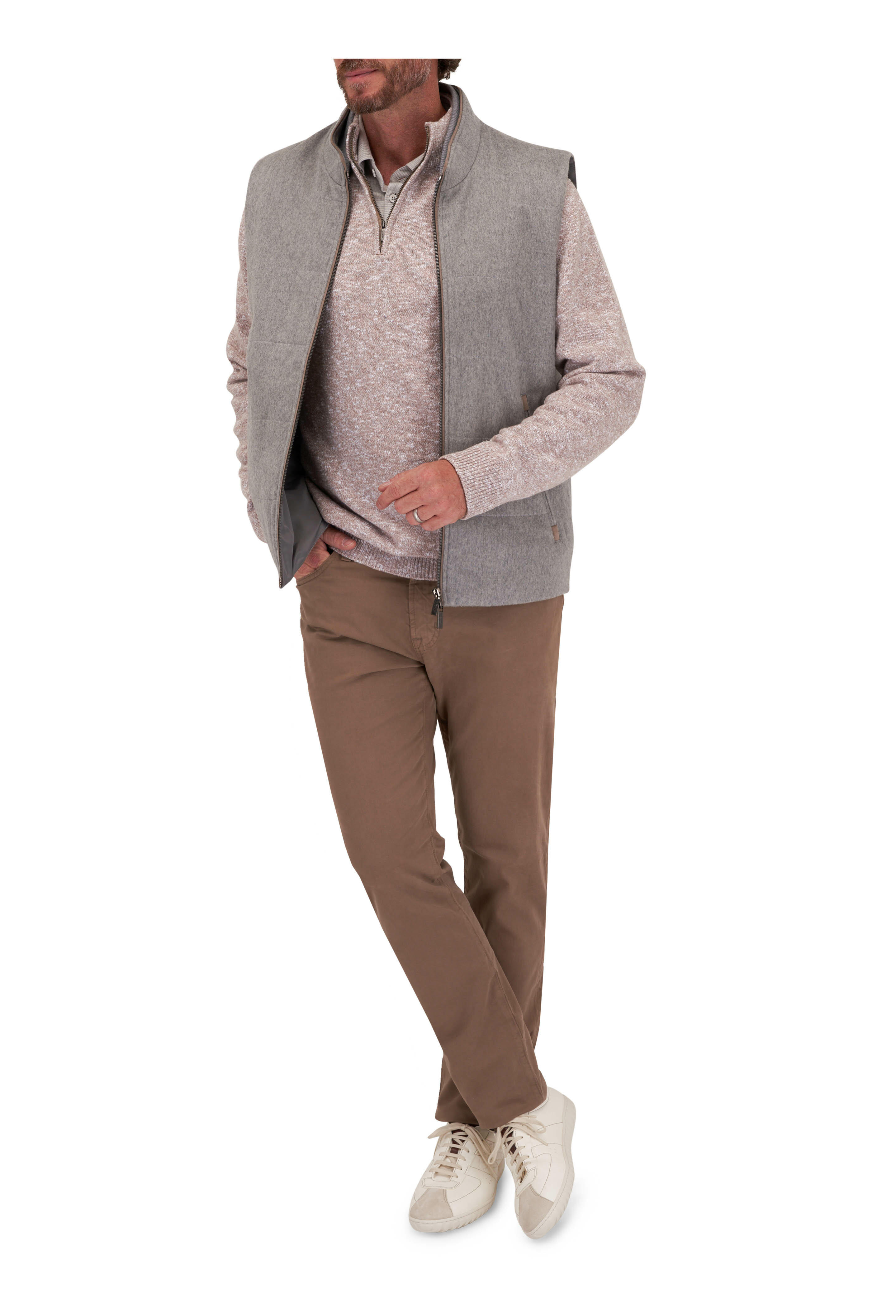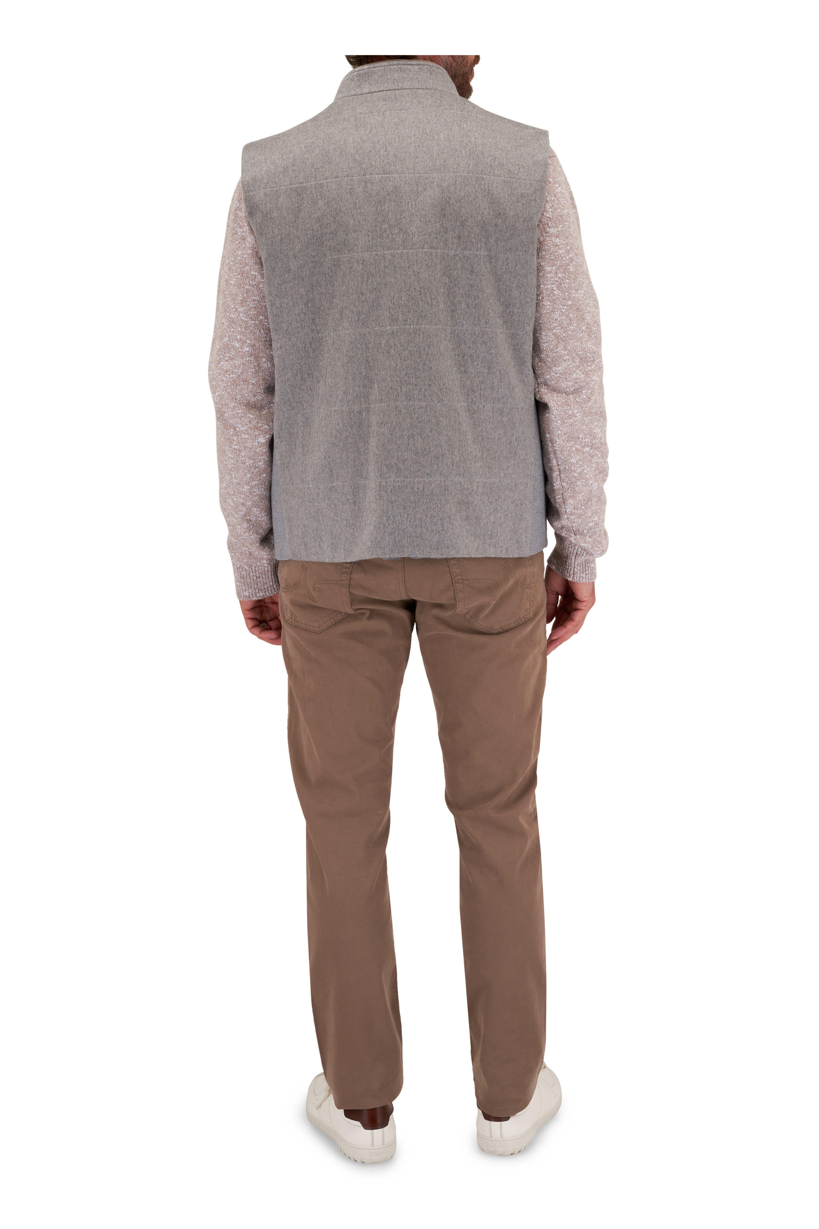Stand collar; ribbed knit detail. Two-way front zip. Lower zip pockets. Ribbed knit side panels. Straight hem. Made in Italy. 100% cashmere; fully lined. Dry clean.