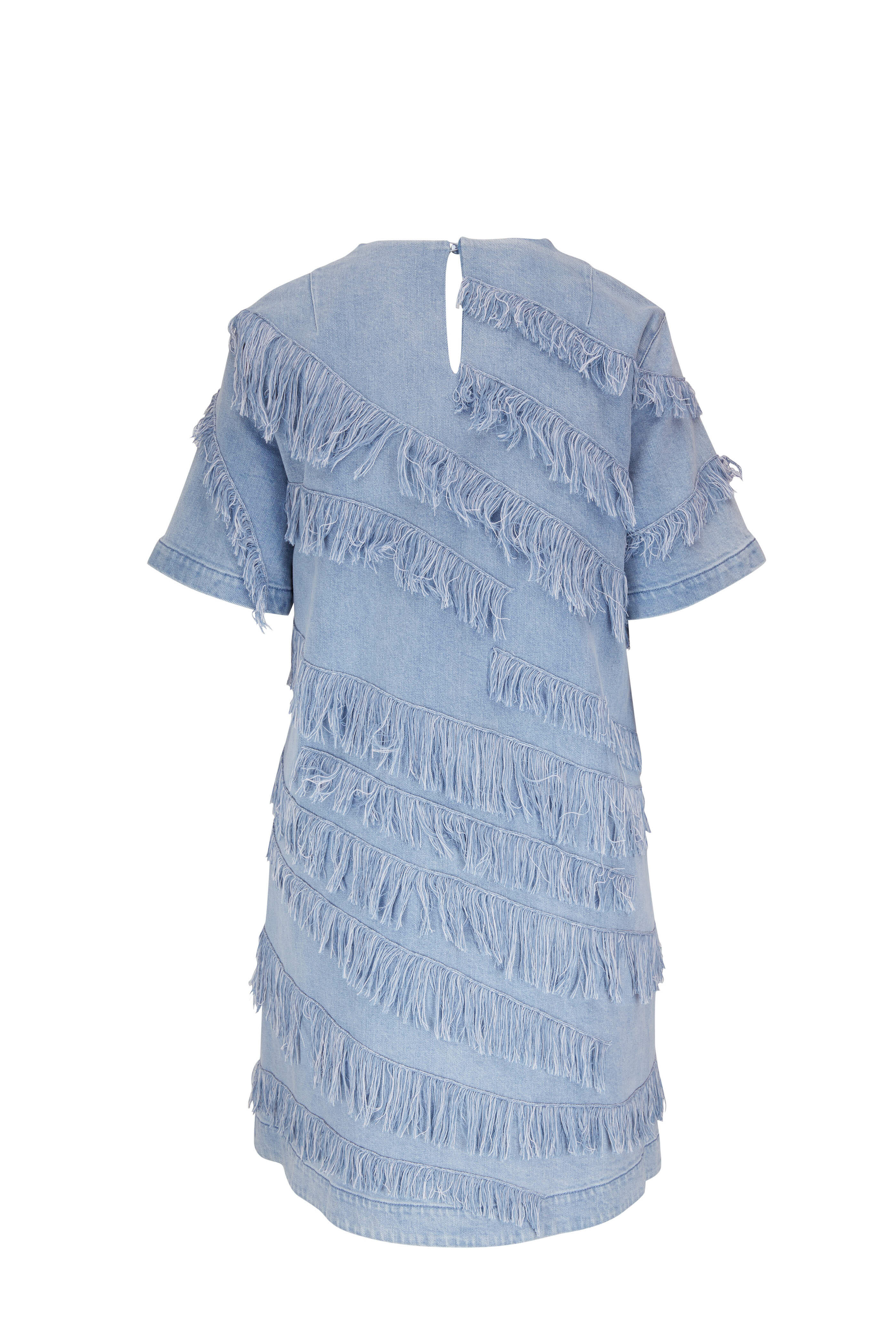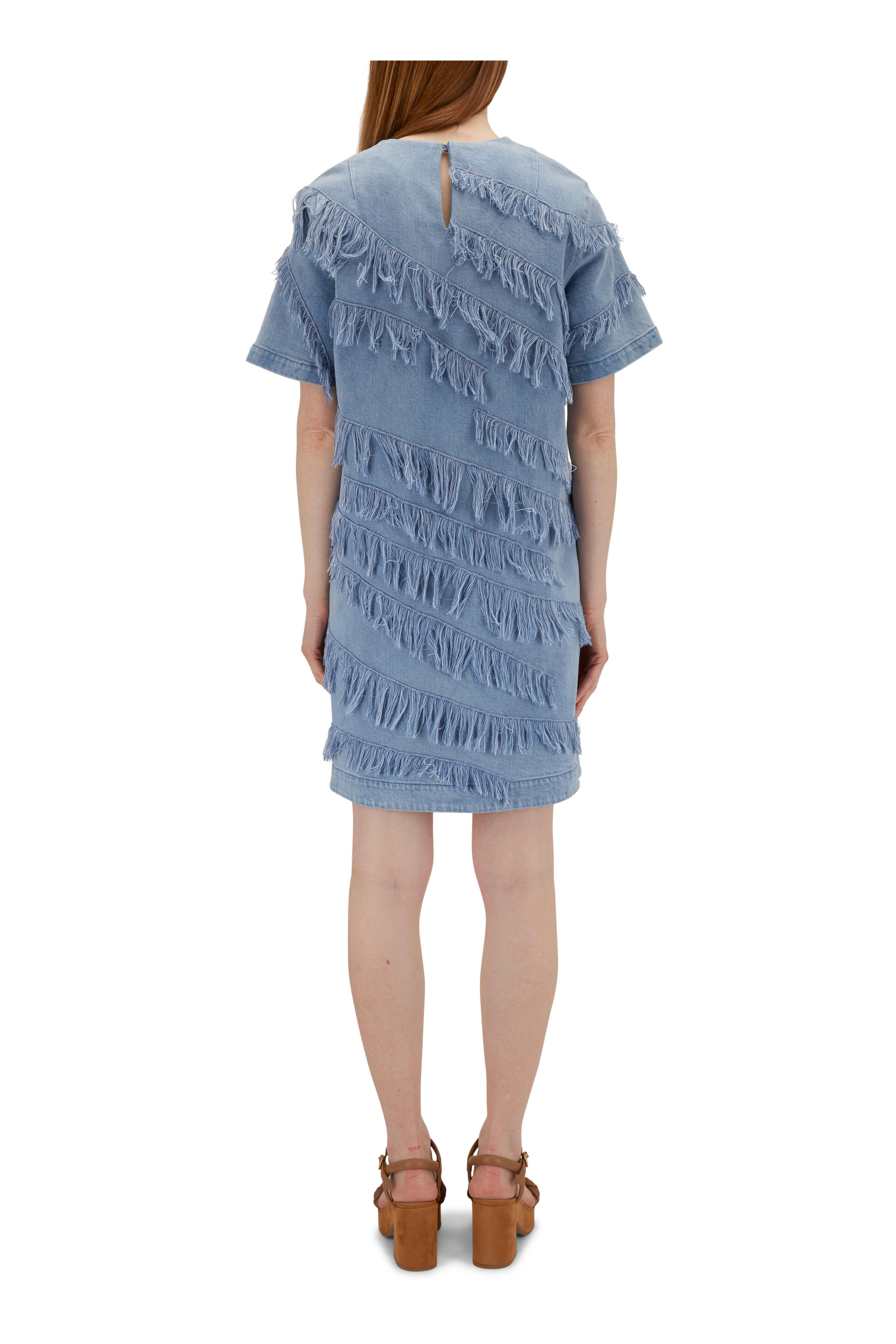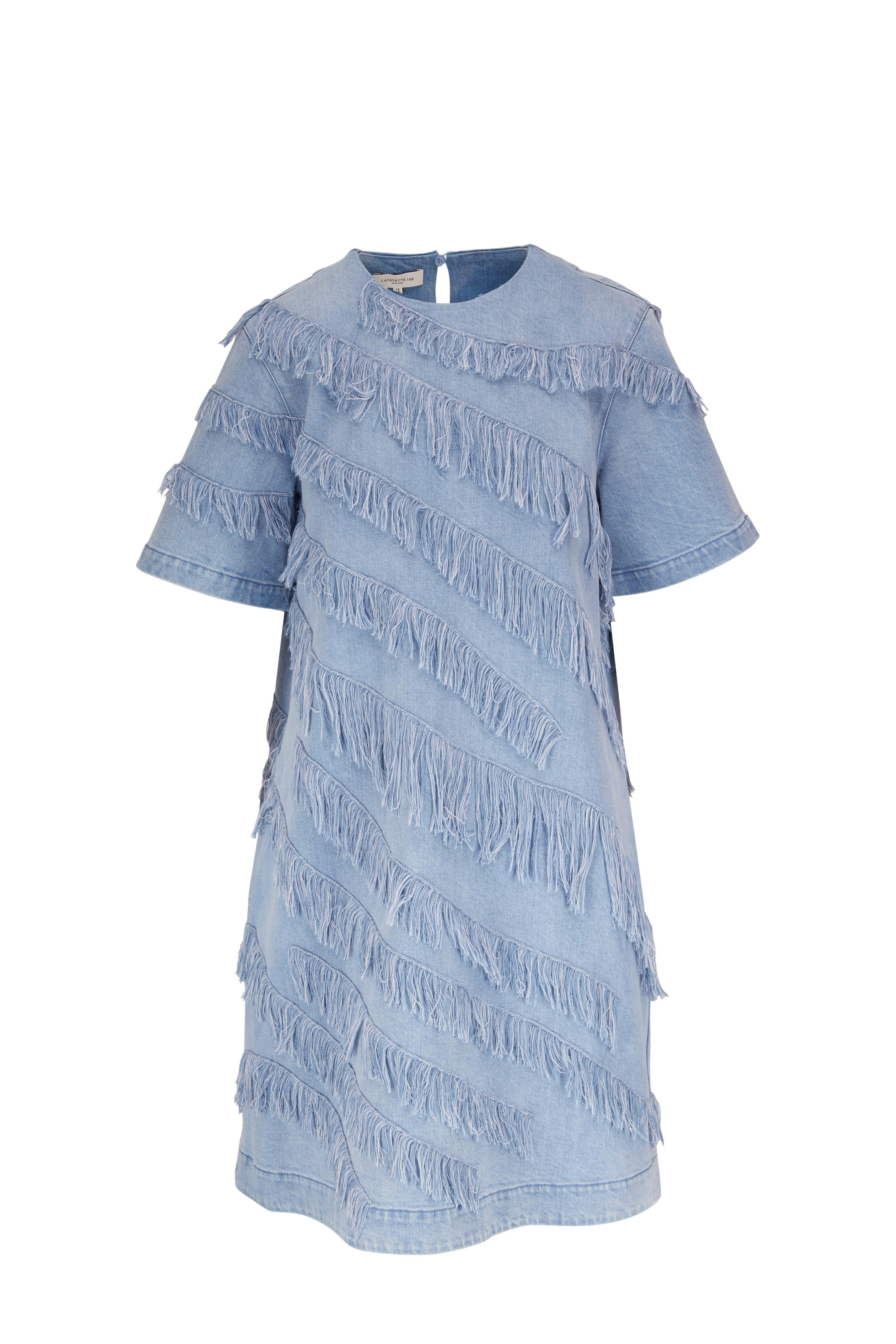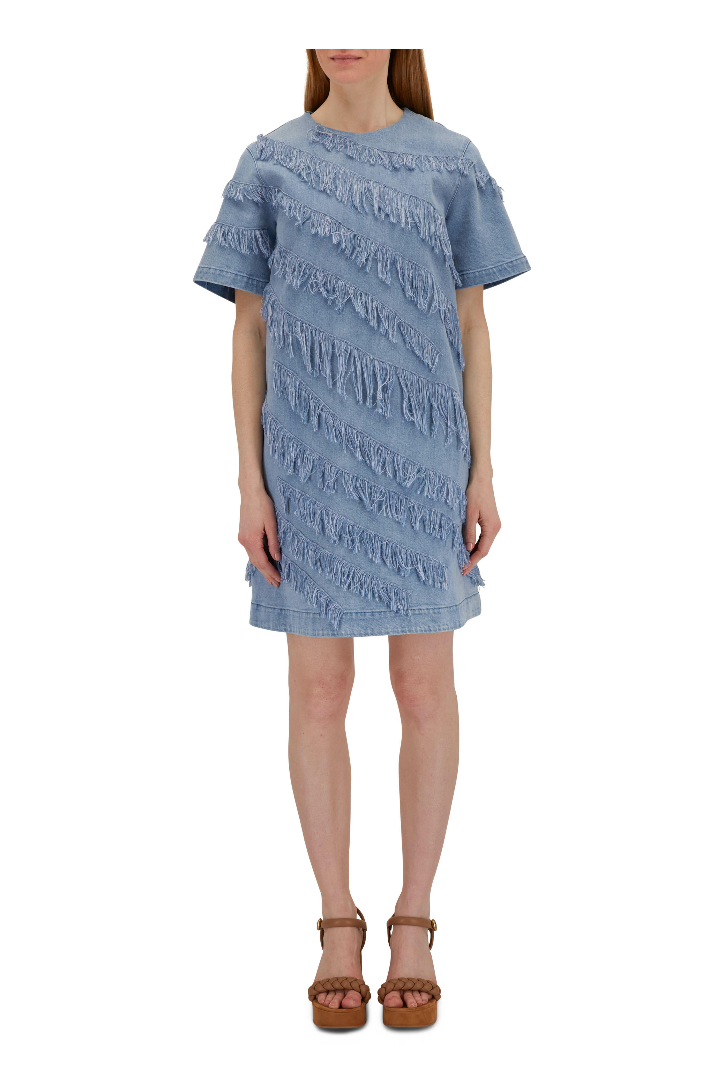 Jewel neckline. Keyhole button back. Drop shoulders. Side seam pockets. Fringe detailing. Imported with Italian fabric. A-line silhouette. Size Small: 40" bust ⁄ 41" waist ⁄ 44.5" low hip ⁄ 37" length. 98% cotton, 2% elastane. Dry clean.