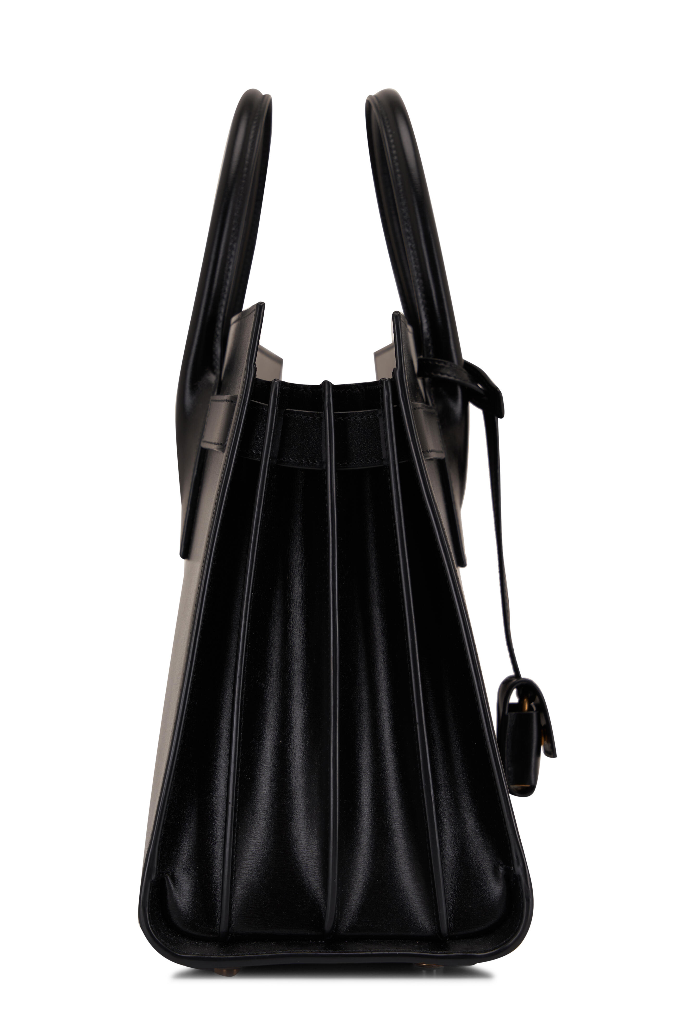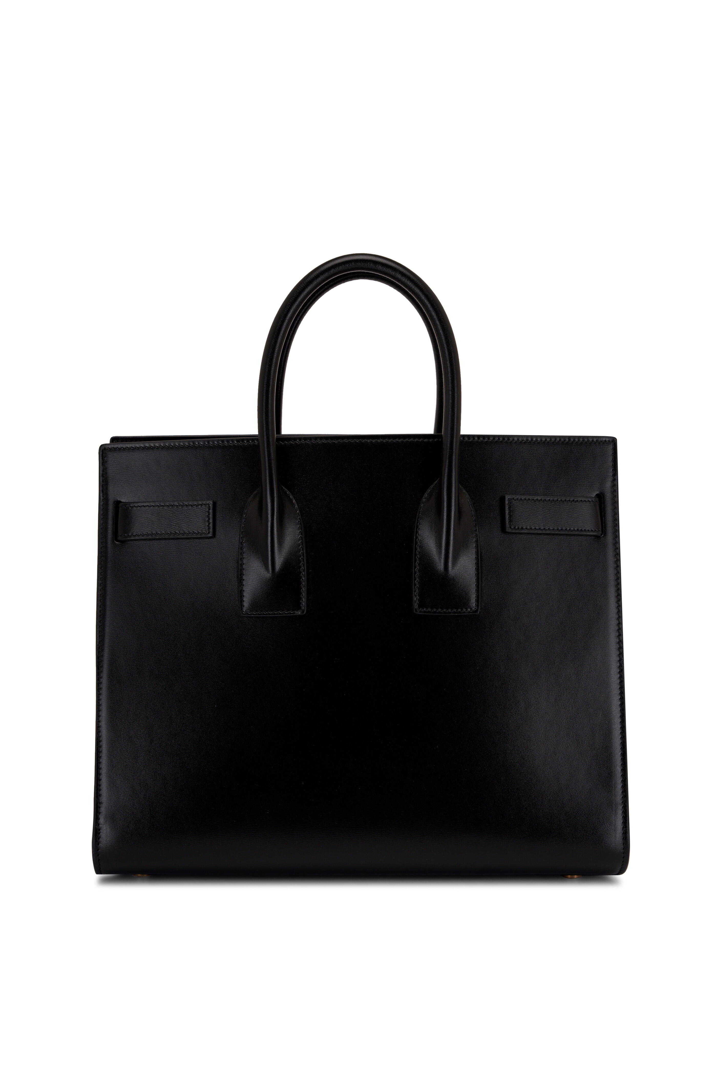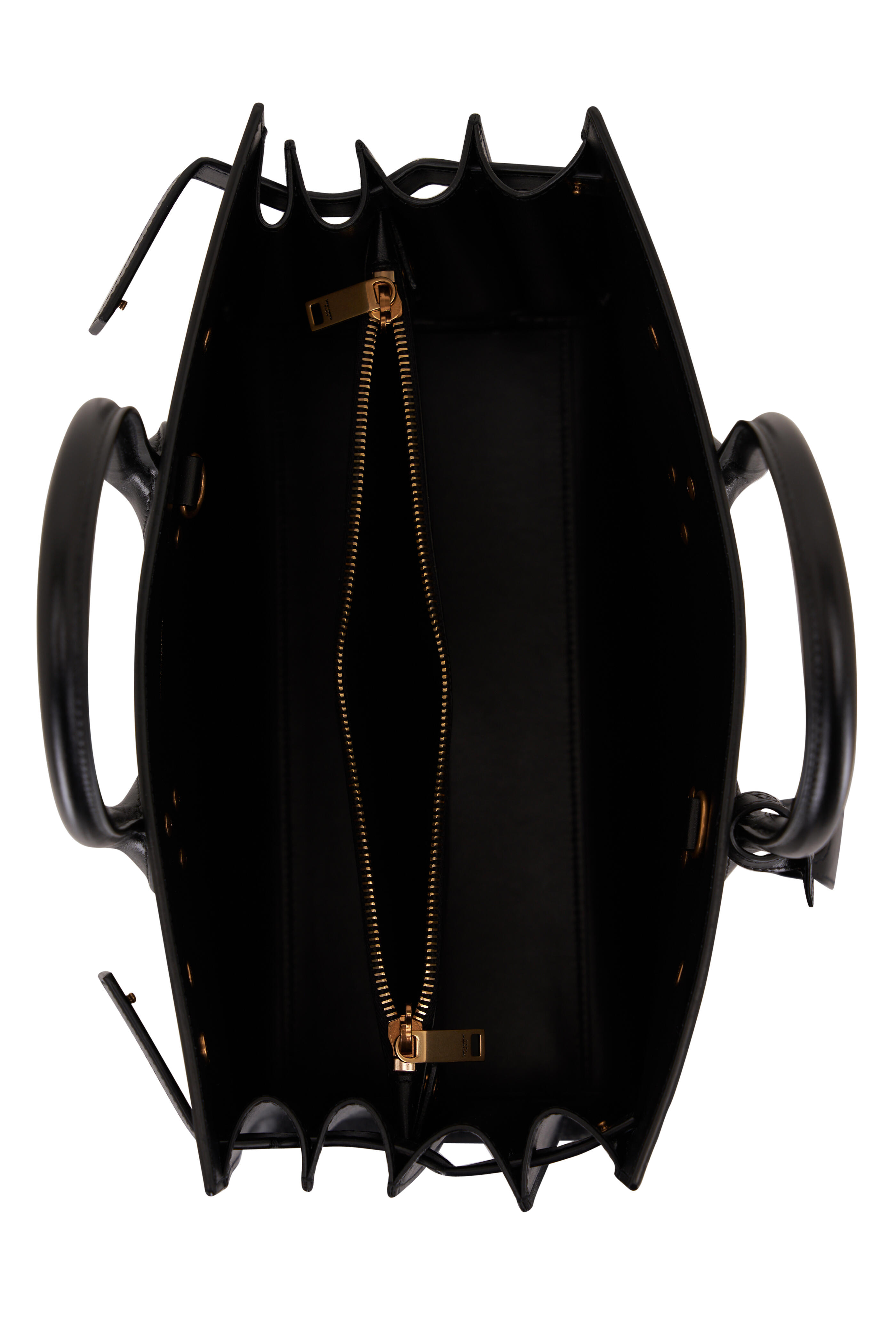 Smooth leather. Dual rolled top handles. Detachable, adjustable shoulder strap. Open top; interior zip pocket. Gusseted sides; snap-fastening tabs. Padlock and keys included. Brass-toned hardware. Protective metal feet. Made in Italy. Width: 13". Height: 10". Depth: 6". Strap length: 22". Handle drop: 4".