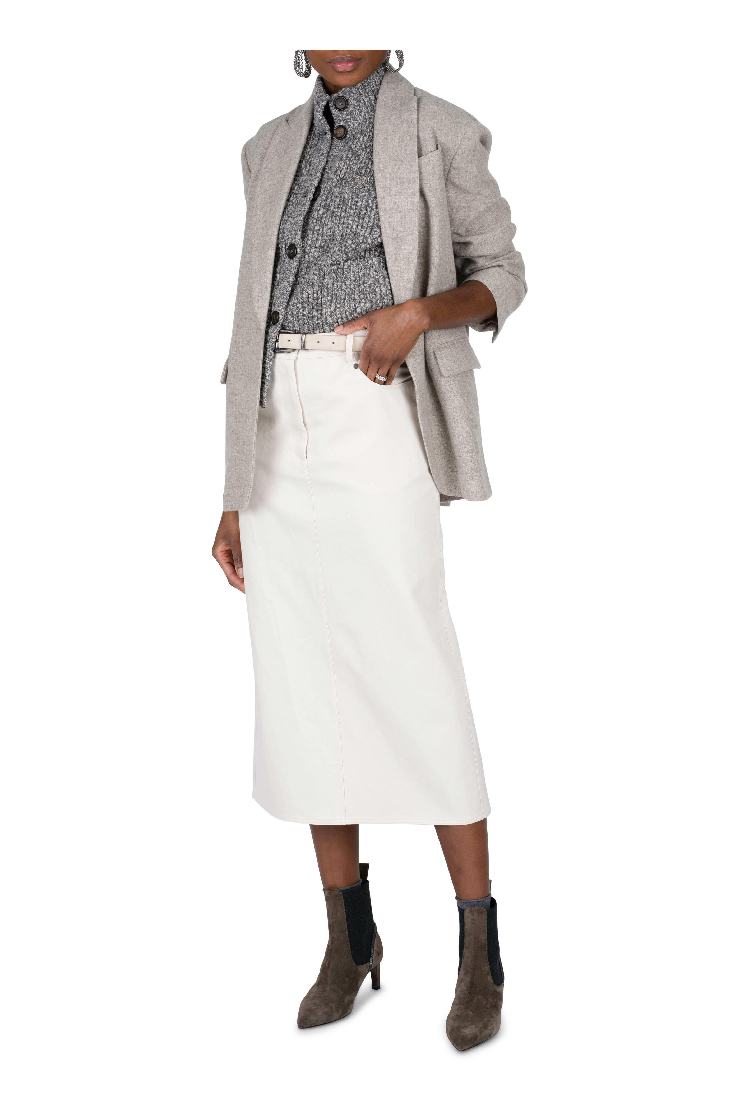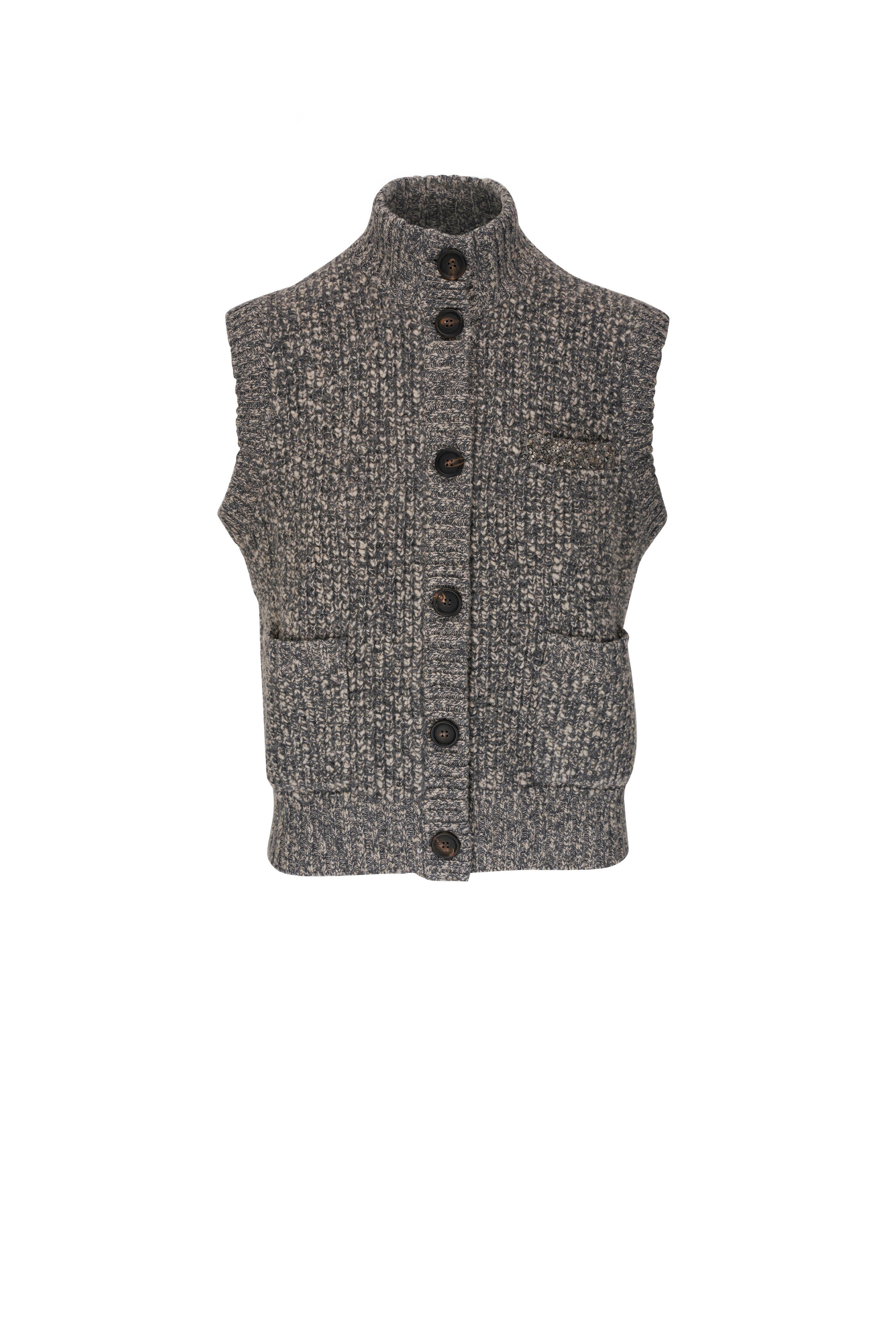 Mock neckline. Front button closure. Embellished chest patch pocket; lower patch pockets. Ribbed trims. Made in Italy. 23" shoulder to hem. 55% lambswool, 45% cashmere. Dry clean.
